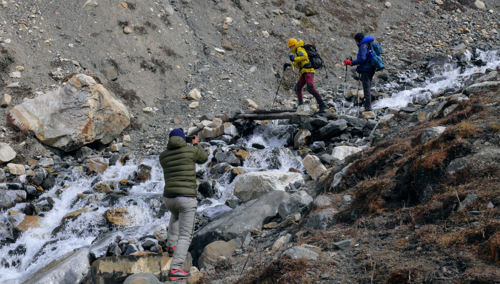 Premier jour sans changement de lodge.Les journées types jusqu'alors se déclinent ainsi ; Lever vers 6hrs avant les autres et je prends un petit café tranquille. 6:30 petit déj ou j'alterne tibétain bread, chapati ou pan cake with honey ou peanut's butter. Ce matin beurre de Yak très frais. Départ vers 7:00, 7 hrs et quart. Une halte le matin au grès des villages rencontrés pour un café ou ginger, honey tea. Pas de truc à grignoter, Dawa les gardes ;>). Repas dans une échoppe en cours de route. Arrivée tôt en général au bercail. Douche, enfin là l'eau est vraiment trop froide pour moi. 17hrs on choisi le menu du soir ; Dal bath (chicken pour moi), mômo, spaguettis... Lecture, écriture, ballade dans le village, wifi. 18hr30 repas puis débriefing pour l'étape du lendemain, bon Dawa lit la carte, puis commande du petit déj du lendemain.