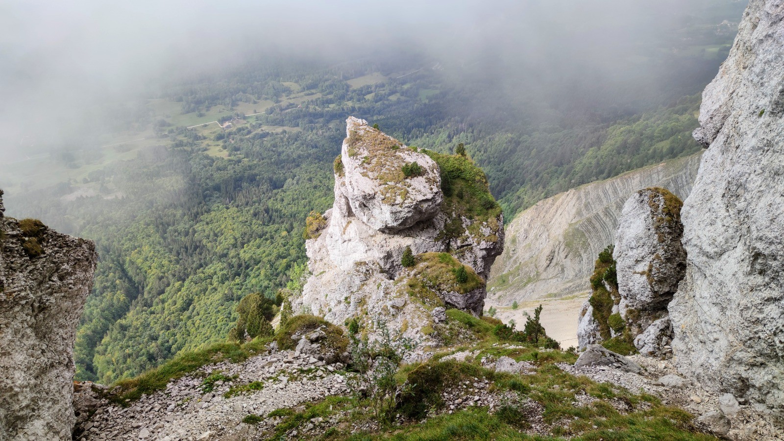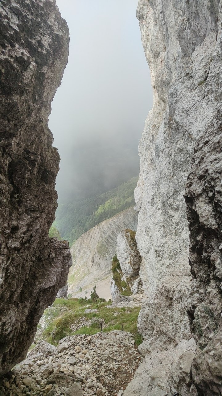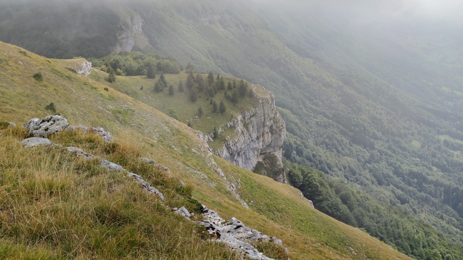 Descente : Par le Golet de l'Agneau, jolie faille dans la falaise, puis descente raide dans un pierrier avant d'arriver dans les bois et rejoindre l'itinéraire de montée.