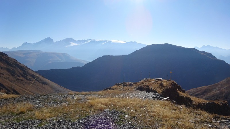 Une fois au sommet il y a un petit regret : avec les aménagements, on ne peut accéder qu’à la terrasse sud, avec une vue qui « ne » porte que dans un secteur NE (Mont Pourri, la Grande Casse) les Aiguilles d’Arves et la Meige plein axe à ONO (Vercors,). On peut apercevoir le mont Blanc en se mettant sur la pointe des pieds. Bon, comme pause déjeuner, c’est quand même pas mal.