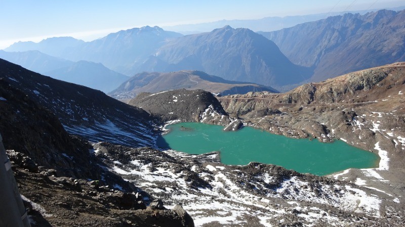 Avec un peu de chance, on pourra s’offrir un crochet cocasse : à 3100 m on passe devant l’entrée du fameux tunnel de la piste du même nom. Quand je suis passé, si l’entrée principale était fermée, la porte sur le coté ne l’était pas….. Quel plaisir d’aller de l’autre coté profiter de la vue plongeante sur le lac sans nom. Par contre, attention, en plein été je ne sais pas, mais la il y avait un effet « grotte glacière » et –au moins « côté Sarenne»- le sol était constitué d’une couche de plusieurs centimètres d’eau juste gelée et bien glissante. Crampons (au moins forestiers) obligatoires et frontale conseillée.