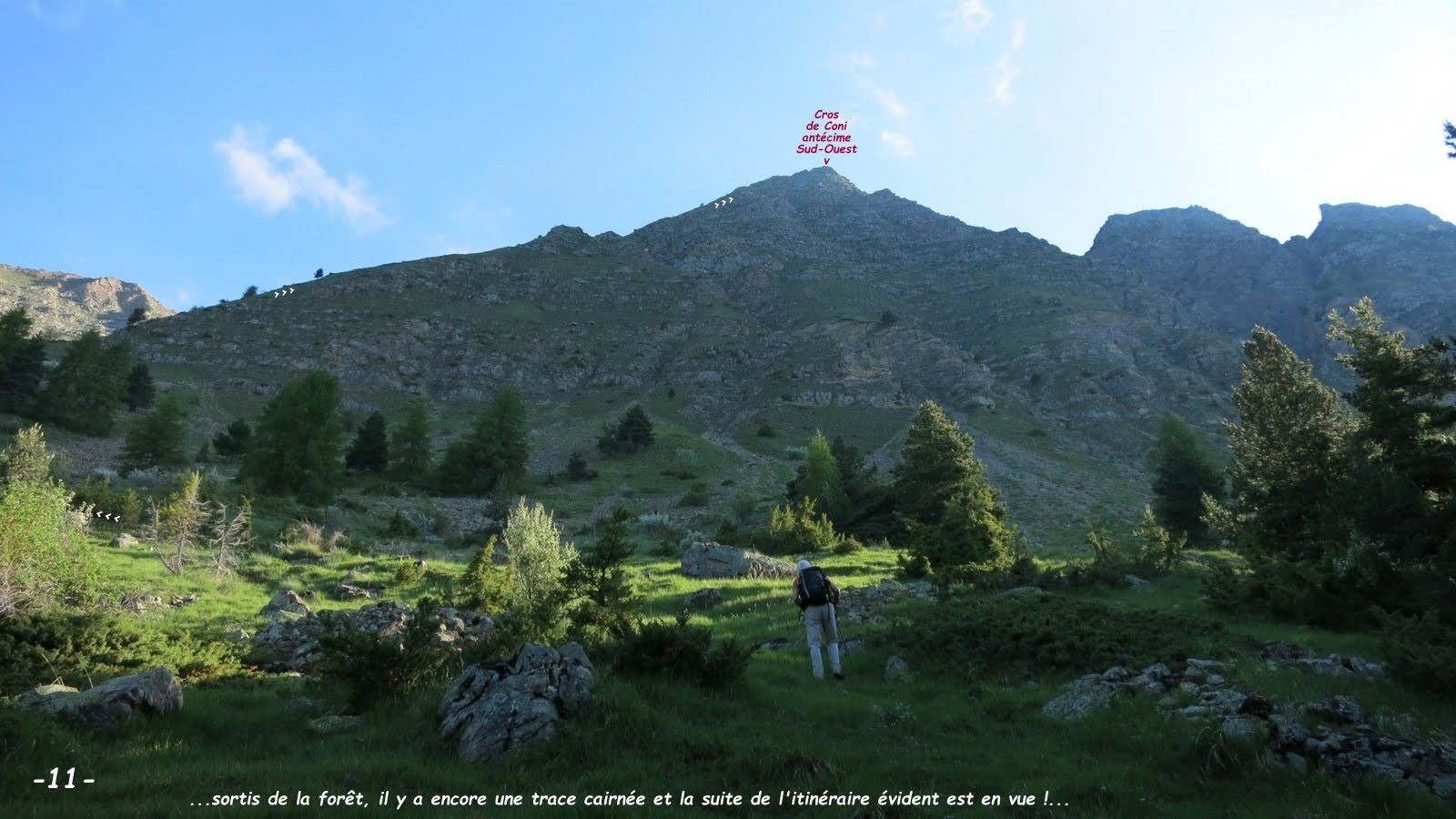 Cros de Coni, 2555 m, malgré son altitude modeste et l'ombre de ses grandes soeurs que sont la Tête d'Eslucis, la plus proche et la Pointe de Serre, la plus grande, a fière allure d'où qu'il soit vu et reste un terrain d'aventure d'une rare sauvagerie très peu fréquenté. Voilà plus de 10 ans que l'Ours l'avait en projet, toujours reporté jusqu'à cette première aventure pour laquelle il n'a pas hésité à m'en proposer la traversée suivant son projet, au plus court et au plus facile à partir de ses observations sur les cartes, les photos satellites et les repérages depuis les randonnées avoisinantes. C'est dire si j'étais confiante en sa réalisation et le résultat en aurait été presque parfait si la météo n'avait pas contrarié notre plaisir en nous entourant de brumes ascensionnelles juste quand il ne le fallait surtout pas, remarquable application de la loi de l'emmerdement maximum.