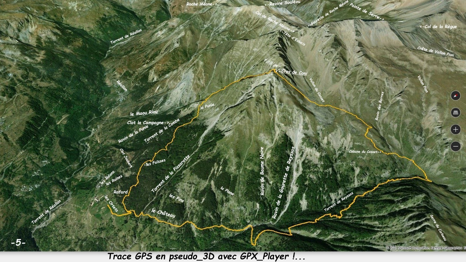 depuis un parking (signalé comme non autorisé à notre retour !) au-dessus des Ortets des Méans de Réallon sur la route sylvopastorale du Bois de Pra Martin (autre possibilité dans le premier lacet suivant, sans garantie !) > suivre la route jusqu'au deuxième lacet > montée sauvage au mieux suivant une diagonale ayant pour point de mire la crête au-dessus de la Punie et passant par Rafard, les Faïsses, Clot la Campagne (en l'absence de toute piste et autre sentier répertorié sur l'IGN, l'Ours a construit la trace de son projet au plus direct tout en minimisant la pente; une fois de plus le terrain nous a prouvé qu'en dehors des nombreuses sentes à vaches existaient plusieurs pistes et sentiers des plus agréables, mais difficiles à suivre lorsqu'on ne sait pas où ils conduisent ?! alors s'il est dommage que notre trace ne les emprunte que par morceau, elle a au moins le mérite d'aborder la crête à son dernier point le plus facilement accessible ! > remonter la crête, tantôt croupe semi-herbeuse en zigzagant pour franchir au mieux les mini-barres rocheuses affleurantes où il faut parfois un peu s'aider des mains, attention forte pente, parfois jusqu'à 45°, tantôt arête rocheuse facile en excellent rocher; pour l'escalier sommital, nous avons choisi de le contourner par la gauche où on trouve un large dièdre qui conduit facilement au sommet en franchissant 2 petites barres rocheuses > descente par l'arête Sud-Est un peu encombrée mais facile jusqu'au deuxième large couloir qui permet de rejoindre facilement la pente Nord-Est et, en ligne directe, le fort sympathique enclos rocheux des plus naturels du Vallon du Casset > de là, l'Ours en pleine somnolence digestive a bien failli nous faire rater la Cabane du Casset > après avoir franchi facilement les Torrents du Ravin des Barres et de Vallon Pion, en l'absence de passerelle, dont il ne subsiste plus que les assises, vu la magnifique crue du Torrent de Reyssas, nous avons dû nous résoudre à mouiller nos godasses en passant à gué > retour par le très beau sentier du Col de Reyssas et le GR 50 et GRP Tour du Lac de Serre-Ponçon.