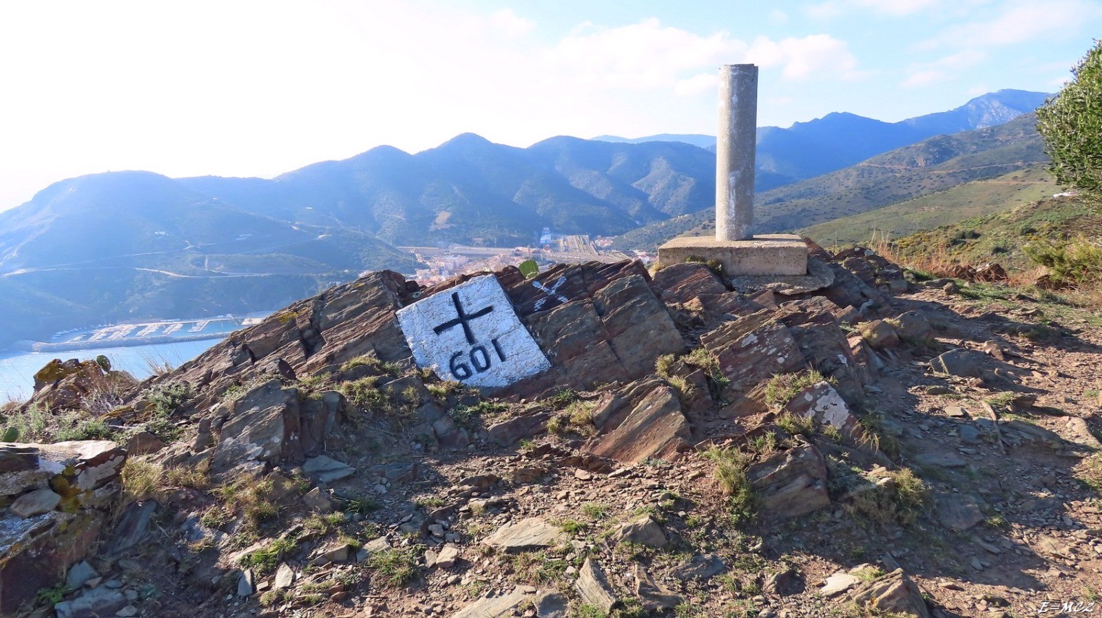 Poursuivre sur la crête, un peu avant d’arriver au col routier on trouve la croix 600. Après avoir traverser le col, continuer en direction d’un premier sommet avec pylône puis vers le Puig de les Freses lui aussi avec pylône, on y trouve la croix 601 à côté d’une borne géodésique, c’est le dernier sommet avant la Méditerranée.