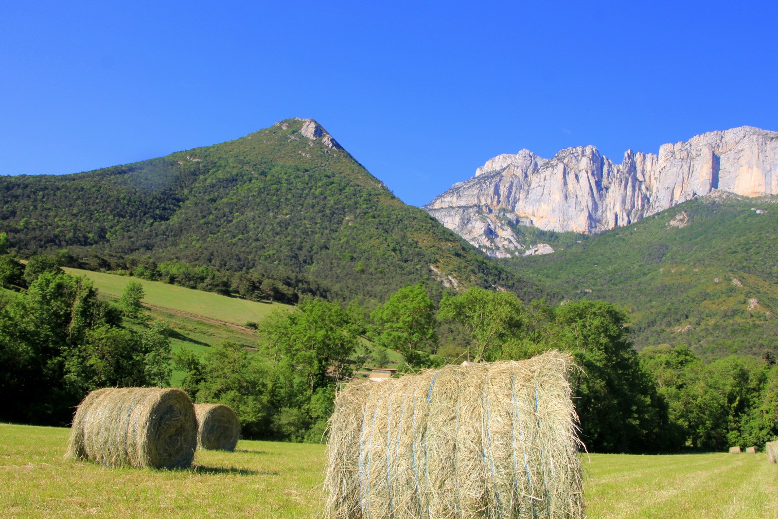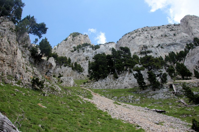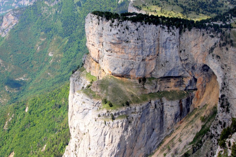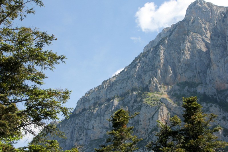 Un peu plus loin, on arrive sur des éboulis terreux (récents ) que l?on longe par la droite . On visera ensuite un éperon rocheux indiqué par le pt IGN 1591. De là, plein Est sur quelques mètres en direction de la falaise pour trouver une sente qui indique le départ de la vire ( vire bien protégée par les arbres comme le montre la photo), vire qui se poursuit jusqu?au pt IGN 1611m.
