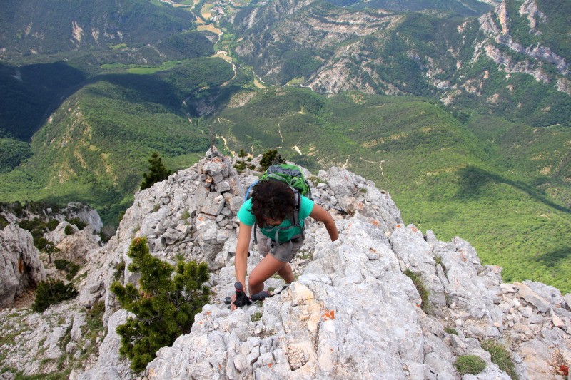 A partir de là, difficile de décrire le cheminement qui est globalement direction N-NE, ei il faut louvoyer entre quelques éperons / rochers. La sortie, est raide, aérienne et magnifique avec une vue sublime sur la vire des Heures en contrebas!