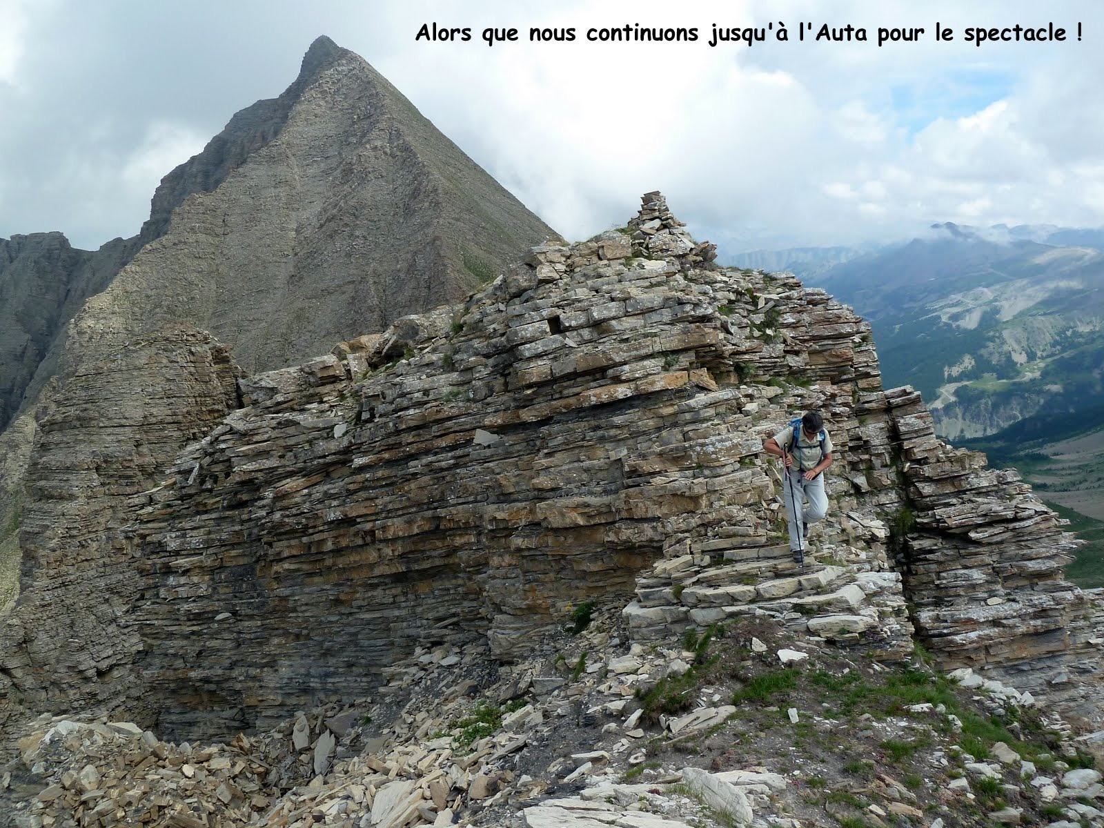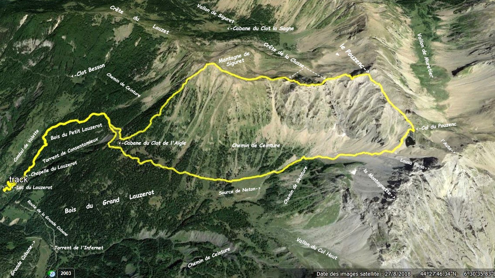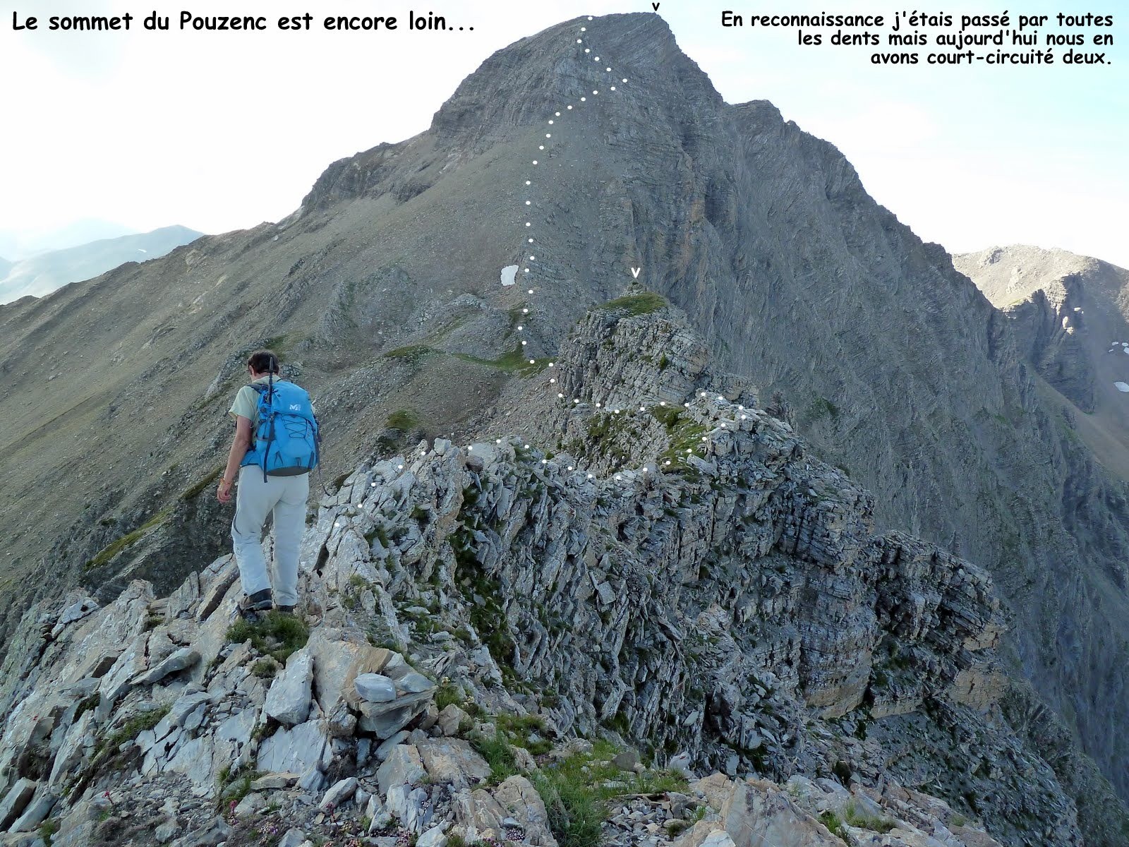 depuis le petit parking au départ du sentier du Lac du Lauzerot que l'on suit jusqu'à la Chapelle du Lauzerot > traversée du parc de protection du captage d'eau > poursuite du sentier jusqu'à la Cabane du Clot de l'Aigle et emprunter au mieux la crête Nord-Ouest de la cote 2593 m pour rejoindre le sommet 2609 m de la Montagne de Siguret > de là il suffit de suivre au mieux la crête très large jusqu'au collet, 2556 m, où elle devient rocheuse et franchement plus effilée > la suivre au plus près de son fil en escaladant facilement les 3 premiers ressauts > au 4ième, le plus conséquent, le plus aisé consiste à poursuivre sur la gauche par une vire aérienne descendante jusqu'au pied de la falaise > remonter la pente jusqu'au collet suivant, par lequel on peut poursuivre, mais il me paraît plus esthétique de rester au mieux sur l'arête pour gravir cette première bosse (que j'ai pompeusement baptisé "des grandes dalles"!) de la Clusse (la poule en patois pour les autochtones) > suivre le fil de la crête jusqu'au collet suivant d'où on peut facilement court-circuiter la bosse suivante, mais c'est dommage car c'est techniquement la plus esthétique avec une descente particulièrement aérienne si on va jusqu'au bout, la vire à chamois sur son flanc Est que nous avons empruntée est certes bien moins exposée mais pas plus facile. La petite dent suivante n'est pas difficile à escalader et peut se contourner facilement par la gauche > remonter ensuite la pente pierreuse jusqu'à venir buter sur la barre rocheuse de l'arête du Pouzenc qu'il suffit de suivre sur la droite, pour la rejoindre au-dessus par une succession de petites barres transversales faciles à escalader à la condition expresse que le sol ne soit pas gelé, sinon danger maximal ! > de retour sur l'arête, il suffit de la suivre facilement jusqu'au cairn sommital, 2898 m > le retour se fait par sa voie normale (désormais en tirets rouges sur l'IGN de Géoportail) jusqu'au Col du Pouzenc, 2676 m > d'où on rejoint au mieux le vaste pierrier du couloir Nord-Ouest de l'Auta qu'il faut descendre jusqu'au Chemin de Ceinture, de très loin la partie la plus pénible de cet itinéraire ! > ensuite le plus aisé et le plus court est de revenir par le Chemin de Ceinture jusqu'à l'itinéraire de montée par lequel on revient au parking ! Mais c'était sans compter avec notre ami Pacou qui, pourtant pressé par le temps, a cru bon de nous inviter à le suivre sur son itinéraire soit-disant le plus rapide !...
