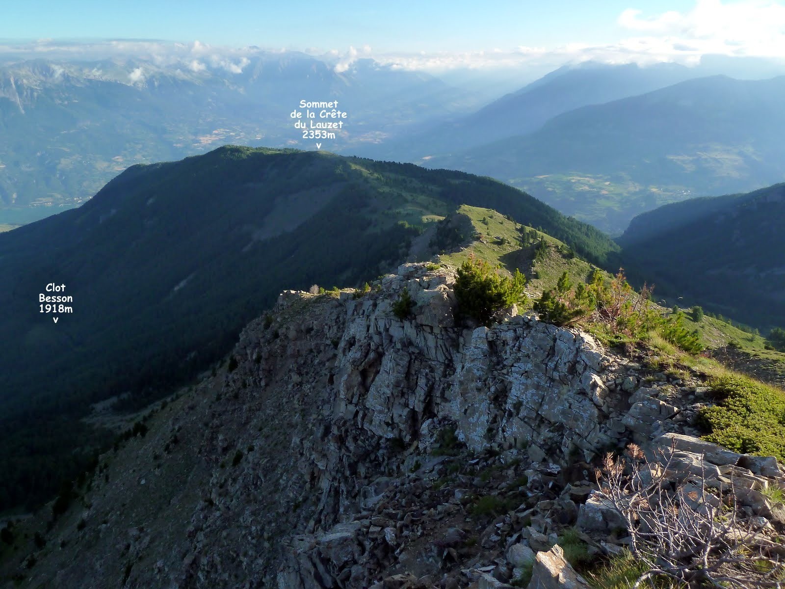 Le Pouzenc en traversée depuis la Montagne de Siguret au Nord jusqu'au Col du Pouzenc au Sud en suivant la crête au plus près de son fil. La Route Forestière de Clot Besson étant en très mauvais état, j'ai proposé un départ depuis la Route Forestière de la Grande Cabane. J'ai reconnu cet itinéraire en sens inverse en août 2011 pour ma première année de retraité à Embrun, répété en octobre, avec une amie à l'époque inscrite au CAF d'Embrun, dans la foulée suite à la traversée de la Montagnette et je le refais toujours avec autant de plaisir même si les années commencent à compter. Attention, itinéraire assez gazeux avec quelques passages un peu exposés, sur un rocher très médiocre, même si on peut trouver bien pire dans l'Embrunais, cependant les difficultés techniques intrinsèques n'excèdent pas le 2c, 3a; une assurance peut être utile pour les moins aguerris, le port d'un casque jamais inutile ne me paraît pas indispensable.