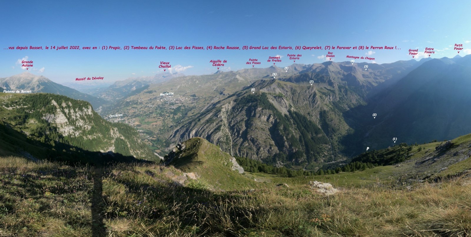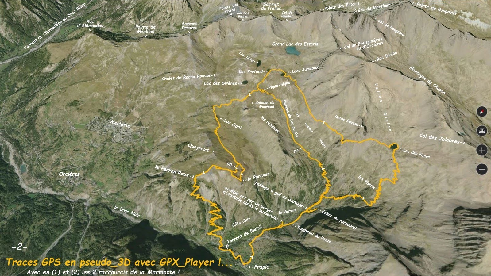 depuis le parking obligatoire visiteurs de Prapic, 1550m, (d'où nous avons essayé de ruser pour éviter le macadam, tout comme au retour, 2 exemples qui ne sont sûrement pas les meilleures solutions !) > village de Prapic et sentier balisé du Lac des Pisses (sauf que la rive droite de la passerelle sur le Torrent de Blaisil était fermée par un filet à moutons défendu par 3 bergers d'Anatolie dont 2 attachés et le troisième libre et particulièrement agressif ! demi-tour et poursuite par le sentier du Tombeau du Poète et la sente en rive gauche en espérant rejoindre le sentier le plus haut possible; devant son impossibilité sans trop s'exposer, retour à la prise d'eau d'irrigation où, heureusement pour nous, la traversée à gué a été facile), retour sur le sentier balisé > Lac des Pisses (dont nous avons fait le tour !) > les Lacs de Merlette par le sentier qui traverse à flanc sous Roche Rousse et en amont des Petites Pisses > Lacs Jumeaux > Lac Profond > descente sur le collet en amont de la Cabane du Gouroud (où la Marmotte nous a rejoints à la suite de son raccourci par le vallon du Lac du Col et la piste de la gare de départ du Télésiège du Gnourou !) > Lac Jujal et son vallon suspendu > le Paravar > l'épaule de la crête Sud du Queyrelet descendue par le sentier sur son fil, puis par la large croupe Sud-Est jusqu'au sentier du Perron Roux qui se poursuit de la plus belle manière dans le mélézin, traverse de façon particulièrement spectaculaire un ravin schisteux très pentu avant de retrouver dans un nouveau mélézin ses bonnes manières et n'en ressort qu'à quelques encâblures du pont sur le Torrent de Blaisil en aval de Prapic > retour parking.