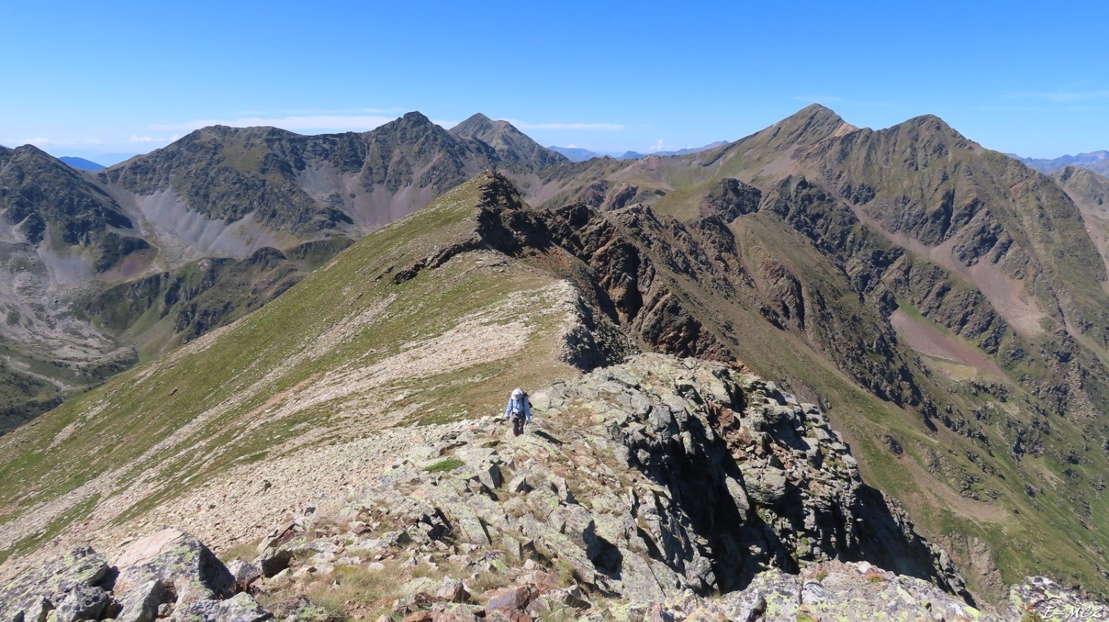 Du Pic de l’Estany Mort, suivre la crête frontière en traversant les Pic de Mil-Menut et le Pic de la Pala de Jan (non nommé sur la carte IGN). Du Pic de la Pala de Jan, conserver la crête jusqu’à la première dépression et descendre sur la droite. Il faut louvoyer au mieux du terrain pour revenir progressivement vers le refugi de Jan. On peut rejoindre un sentier balisé rouge jaune, le suivre vers la droite et reprendre le sentier utilisé à la montée sans passer par le refuge en coupant sur la gauche.