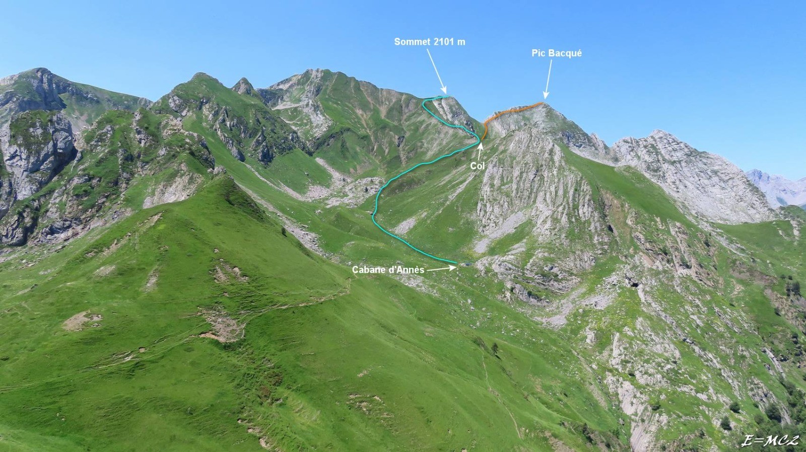 Du parking revenir par la piste jusqu’à la route goudronnée et prendre la première route sur la gauche, goudronnée elle aussi. Aller jusqu’à la fin du goudron, prendre la piste de gauche repérée par un cairn. Après quelques minutes succède à la piste un sentier cairné de qualité inégale mais jamais difficile à suivre. Le cheminement remonte le vallon du Ruisseau de l’Annès pour déboucher sur un plateau vers 1750 m. Le sentier se poursuit sur la gauche vers le Col d’Escourets et sur la droite on y trouve la cabane d’Annès. Traverser le plateau, poursuivre dans le thalweg et après avoir dépassé une zone rocheuse, obliquer sur la droite pour monter en direction d’un col, 1940 m, auquel on accède par un jeu de traces plus ou moins visibles, de meilleure qualité dans la dernière partie.