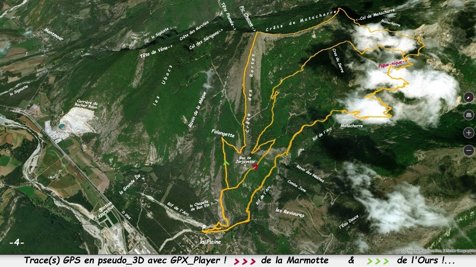 Depuis le parking du Site d'Escalade de la Chapelle de Bon Vin, soit traverser au mieux le Rif de l'Arc et suivre notre trace (un peu sportif sans plus !) soit grimper tout de suite sur la digue de sa rive gauche, donc à droite et rester sur le sentier qui la remonte jusqu'au Gué, plus ou moins facile à passer suivant le niveau d'eau ! > par le sentier ou une fois le balisage retrouvé poursuivre en direction de Folongette jusqu'à sa jonction avec celui de Matacharre au Col des Sérigons > le suivre en sens inverse et l'abandonner à son franchissement de la Crête des Rortes pour remonter hors balisage cette longue crête jusqu'au sommet du Pic Chauve (quelques petits cairns, sentes à vaches, privilégier le flanc droit de la croupe tant qu'elle est boisée, directement sur la crête ensuite !) > retour par la Crête de Matacharre, un peu sportive au début mais très peu exposée, bien plus facile ensuite nonobstant les innombrables sauts pour suivre la sente principale de part et d'autre d'une clôture électrique > de la cote 1723 m, il est préférable de rejoindre directement le Col de Matacharre (notre variante n'ayant pour seule finalité que de tenter de photographier la Tête de Jarret et le Rocher de Goueyran dans le ciel, hors de la Montagne Durbonas !) > du col suivre le GRP Tour du Dévoluy jusqu'au-delà de sa traversée du ravin du Torrent de la Pisse où il rejoint celui du Gîte de Matacharre (nouvelle dénomination de l'Ancienne Maison Forestière de !) > le suivre, après être passé en rive gauche du Rif de l'Arc l'abandonner dès qu'il remonte et continuer sur celui qui descend rejoindre la Route Forestière, la suivre vers l'aval, elle passe en rive droite par un gué, la poursuivre jusqu'au départ sur la gauche du sentier qui descend sur la Plaine par une très intéressante rampe en balcon sur la gorge du Rif de l'Arc > nouveau Gué et retour parking par le sentier sur la digue.