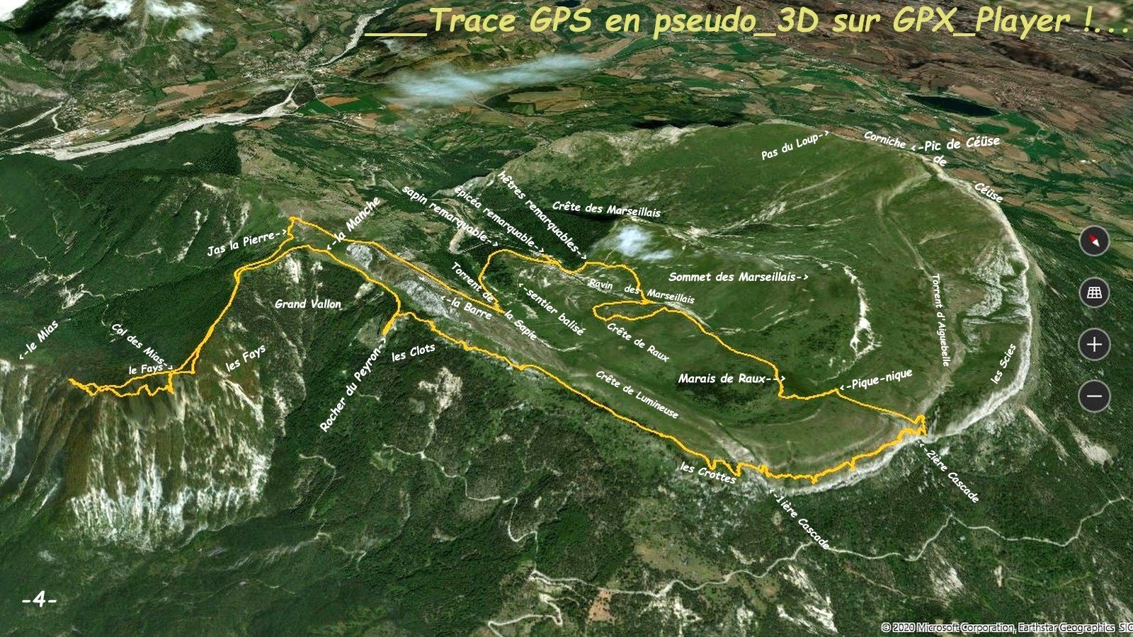 depuis l'ex-Station Céüse 2000 > la forêt de la Sapie > sentier de la Manche jusqu'à son arrivée en crête > traversée de l'alpage du Jas la Pierre > Col et l'essentiel de la crête en partie dénudée des Mias en aller-retour > la Manche et le GR de Pays entre Céüse et Durance > les Crottes > sentier des Cascades > le Marais et la Crête de Raux > traversée du ravin des Marseillais pour rejoindre au plus court le Hêtre remarquable de Céüse à côté du sentier du sommet des Marseillais depuis la station > retour station.