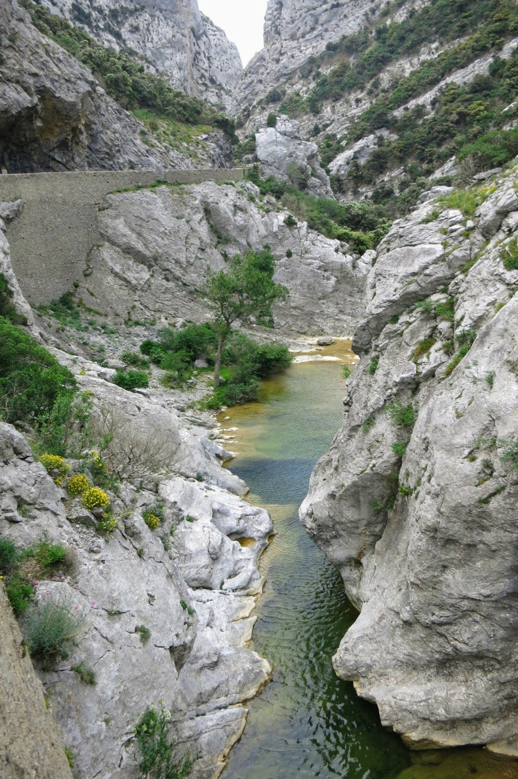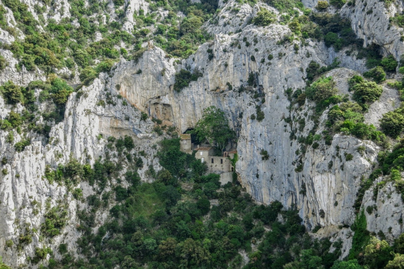 Nous passerons sous le majestueux château de Peyrepertuse, à seulement 4 km à vol d'oiseau, mais n'y monterons pas. Notre but est d'atteindre Cubières-sur-Cidobre où nous bivouaquerons. Car le dimanche, nous voulons découvrir les gorges du Galamus dans le calme. Etape sereine et même contemplative à l'ermitage de St Antoine, niché dans la falaise des gorges. Magique!