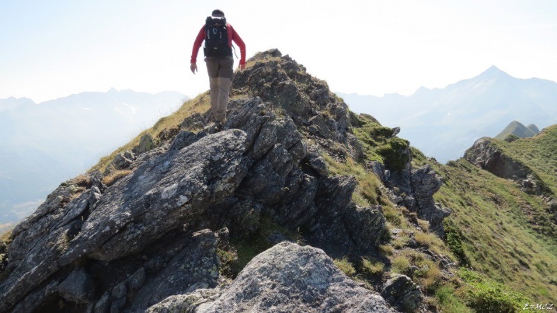 Du col monter vers l'est au mieux les pentes raides pour atteindre le début de la traversée (2277 m). Suivre la crête sans grande difficulté jusqu'au Soum Braqué et ensuite jusqu'au Soum des Canaus.