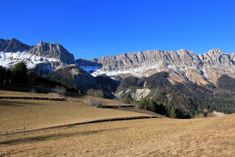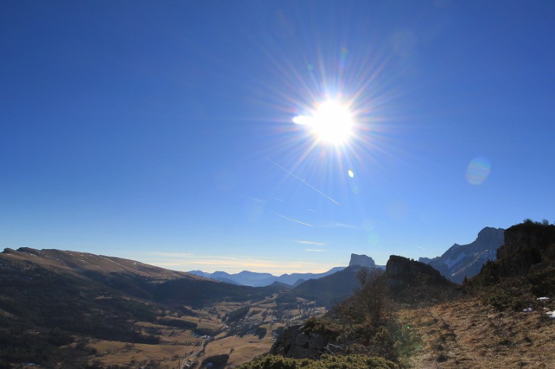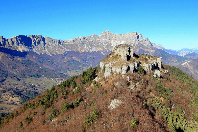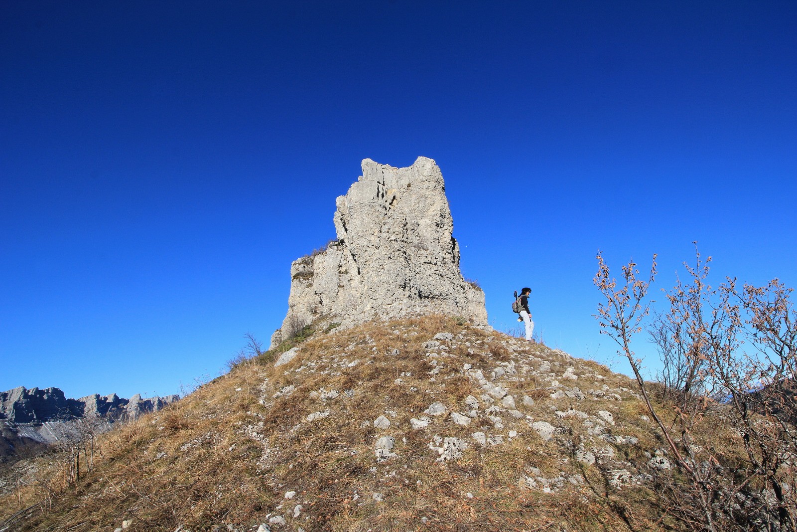 Rocher du Château Vert. Revenir sur ses pas sur une centaine de mètres jusqu'à un Kairn qui indique une sente plein Sud et longe le bastion sommital par l'Est. On passe à côté "du Donjon", traverse le bois jusqu'au pied du Palais. De là , nous avons opté par la droite puis une parte de la via Cordata (R5) jusqu'au sommet. Descente à vue par les pentes herbeuses plein sud, puis dés que le relief le permet, Sud Ouest à travers le bois jusqu'au