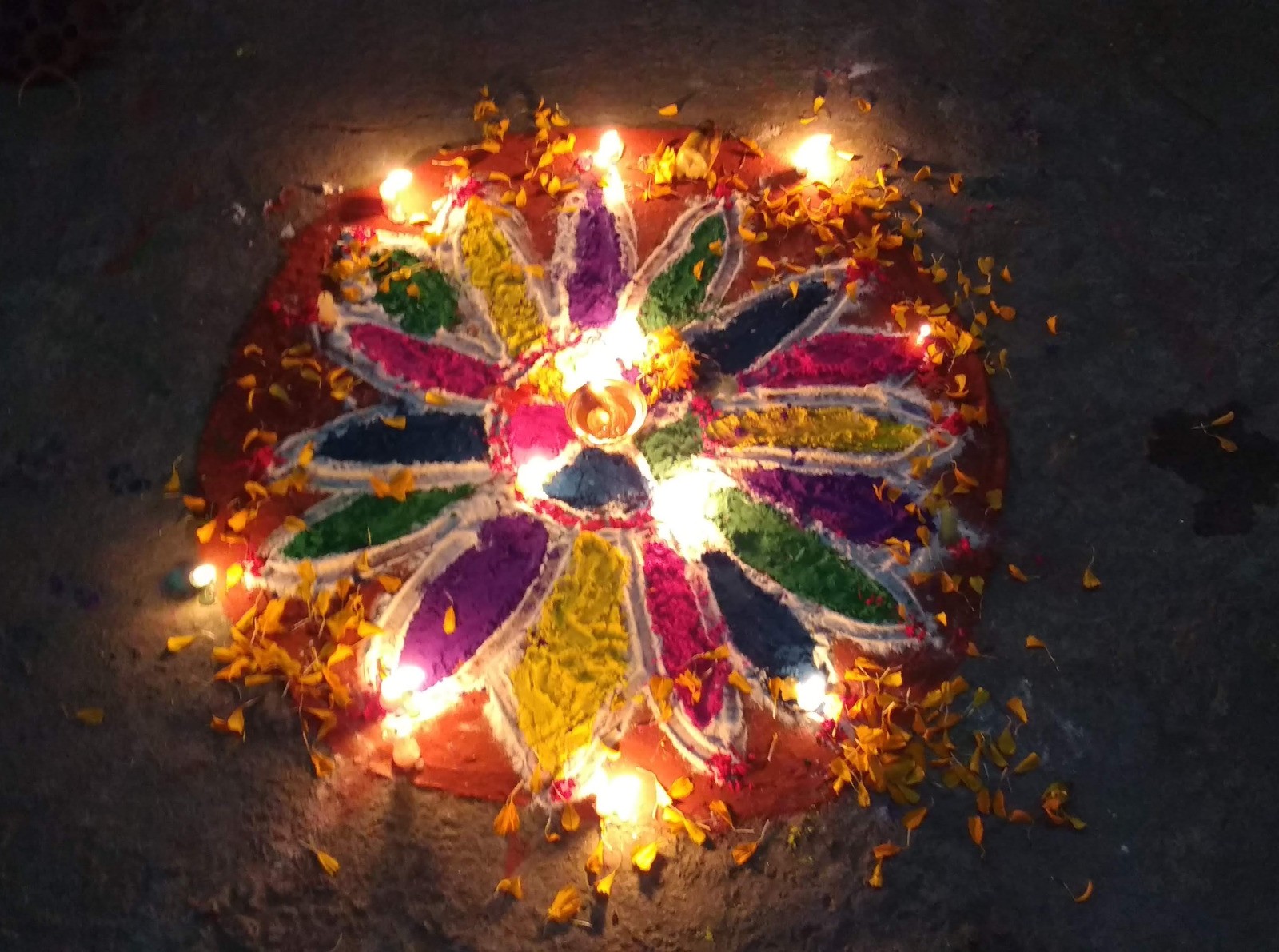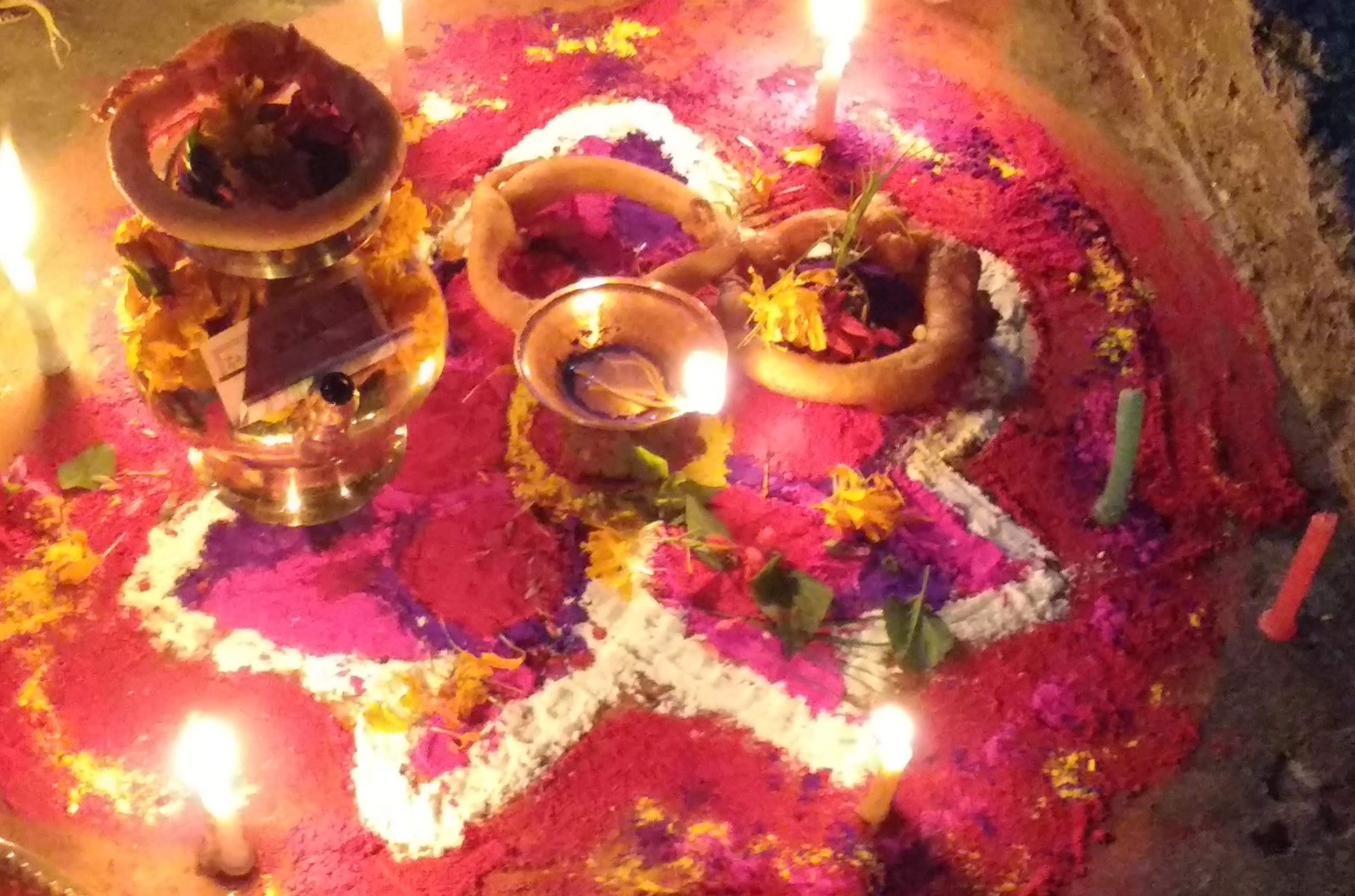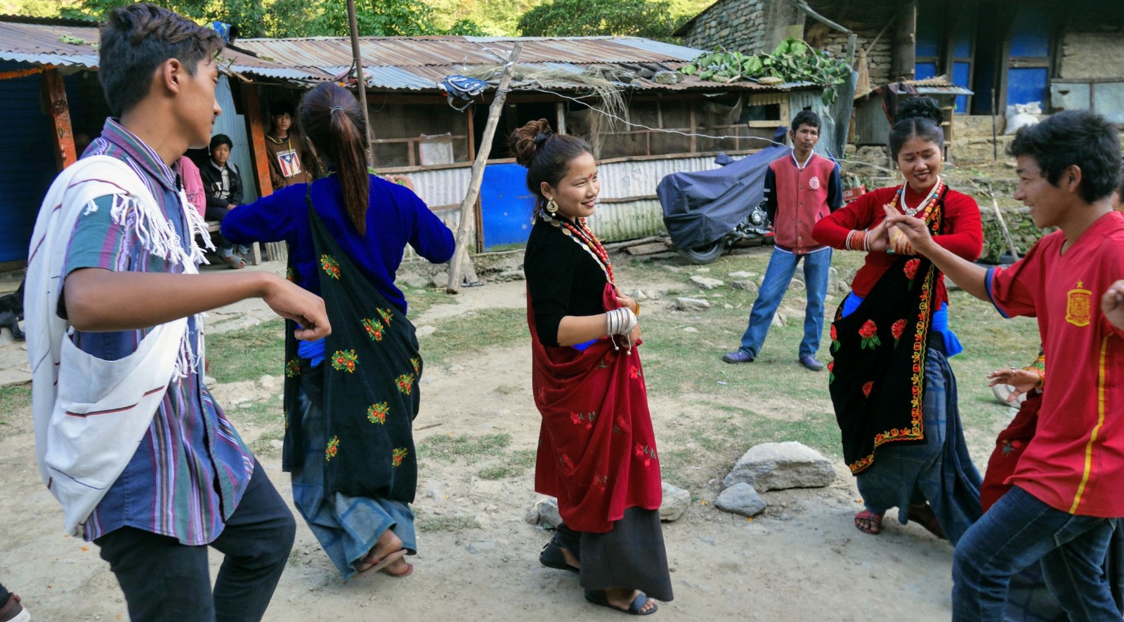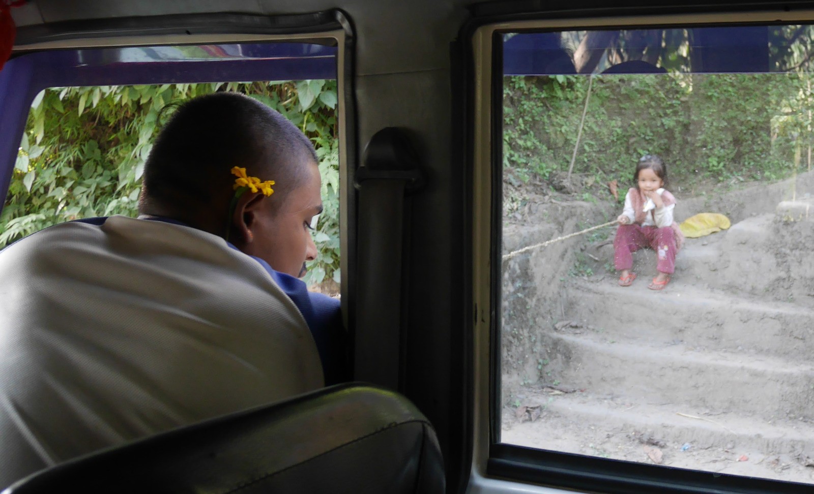 Nous partons plus tard maintenant. 3 heures pour rejoindre Darcha pani et Thonche. Dharapani est de l'autre coté de la rivière. Il est 10hr30 et nous attendons la jeep. On commande un pancake et nous faisons bien car nous en mangerons pas avant longtemps, mais cela nous ne le saurons qu'après. Pour rejoindre Besisahar nous prenons un jeep locale, full de bouteilles de gaz. 3 personnes devant, 3 à l'arrière et Phulba sur les bouteilles de gaz. Voyage tape cul de 5 heures, mais super sympa. La route est défoncée et horrible, mais rigolotte. La jeep est assez confortable. Trés dangereuse aussi avec le torrent en contre bas, sans garde fou, des torrents qui traversent la route, ces croisements impossibles, musique népalaise à fond. Lors d'un arrêt prés d'une cascade, tous dégante, Phulba se met à danser dans le tea shop, les serveuses et nous aussi. L'ambiance est électrique. C'est la fête de Tihar et la musique, une rengaine que l'on va entendre de partout. Nous repartons et dans tous les villages, la jeep est arrêtée par des jeunes filles qui bloquent la route en dansant et demandant des sous, que le chauffeur donne à chaque fois. On emmène quelques jeunes filles, super bien habillée un peu plus loin. Trop top ce voyage de fin de treck. Au village la fète bas son plein avec de magnifiques mandalas dessinés sur les trottoirs. Repas solennel avec discourt pour finir la journée dans une vrai ville.