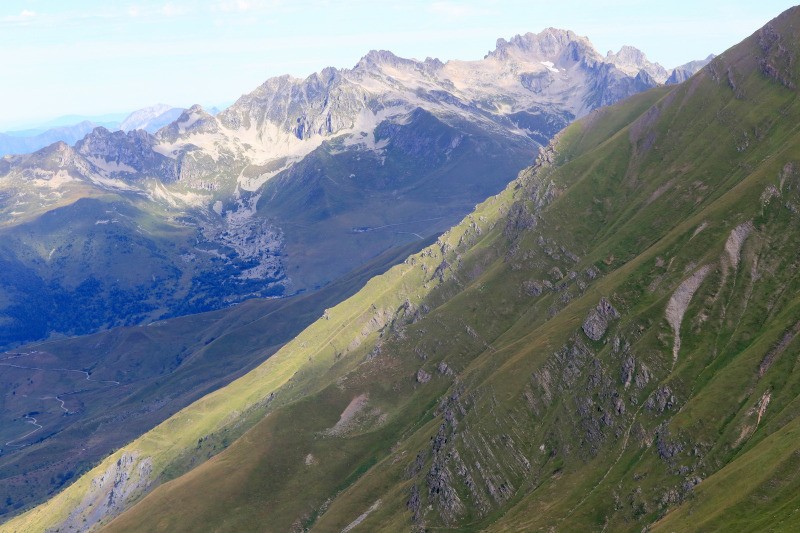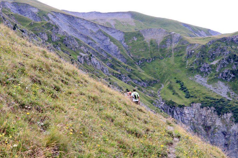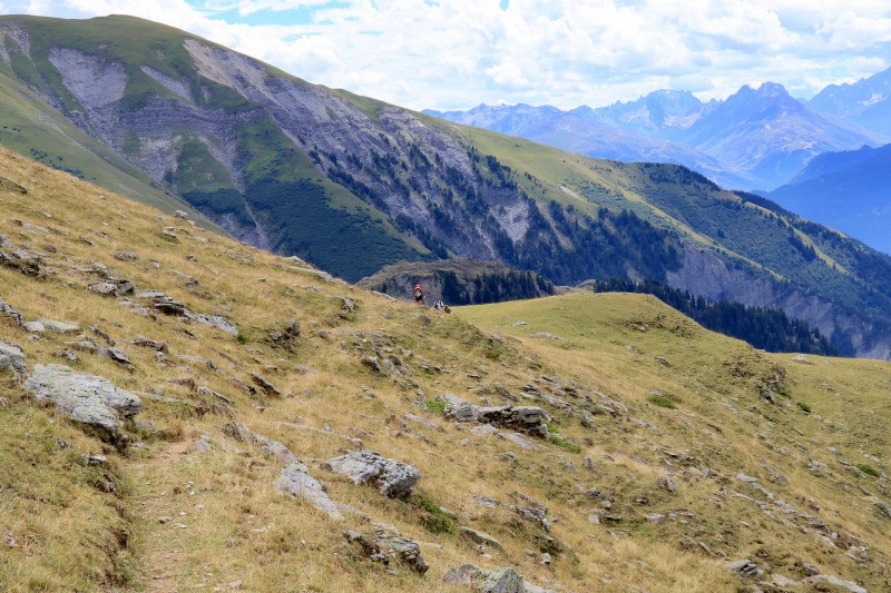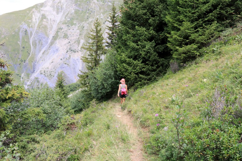 Coin du Châtel. Il se raidit progressivement et descend en lacets le long d'une ravine (à main droite).