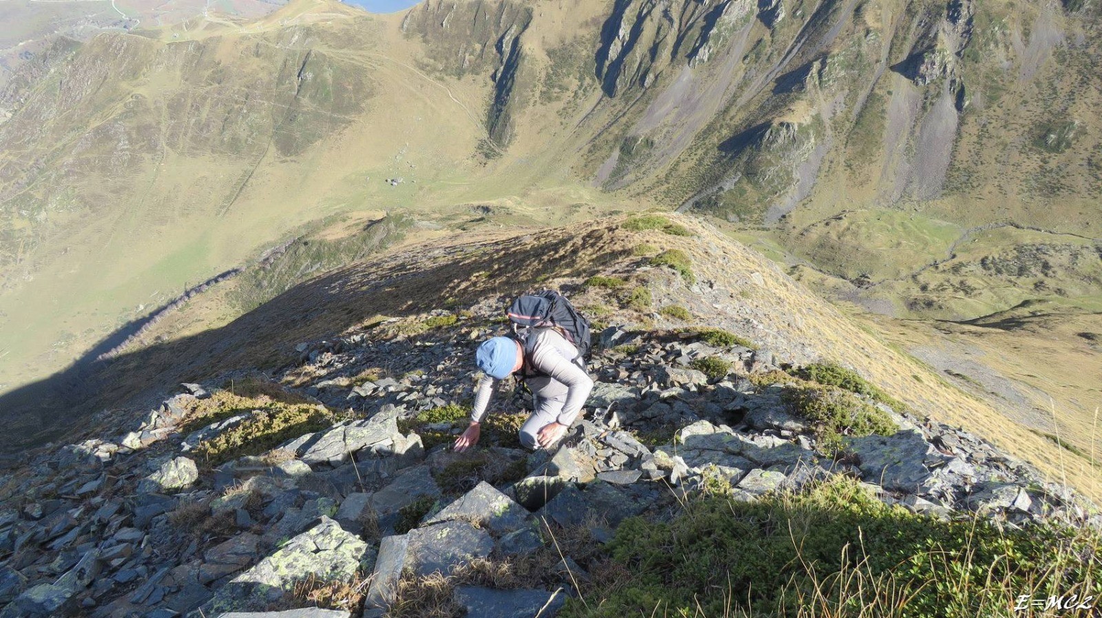 La descente suit la Crête de Bassiouente et commence par la désescalade d’un ressaut rocheux dans lequel on n’a pas oser s’aventurer. Descendre versant est une cinquantaine de mètres et prendre le premier passage facile sur la droite pour revenir vers la Crête de Bassiouente. Suivre la crête ou l’une des sentes en contrebas de celle-ci. La trace enregistrée, pour cause de vent, suit l’une des sentes, il y a plusieurs passages rocheux plus ou moins aériens mais faciles. Poursuivre la descente jusqu’à un col, 2500 m, et descendre sur la gauche vers la cabane en tôles vertes et jaunes.