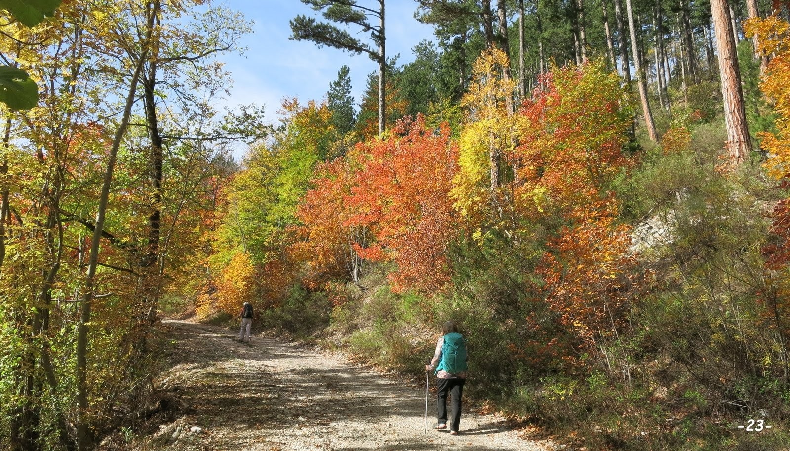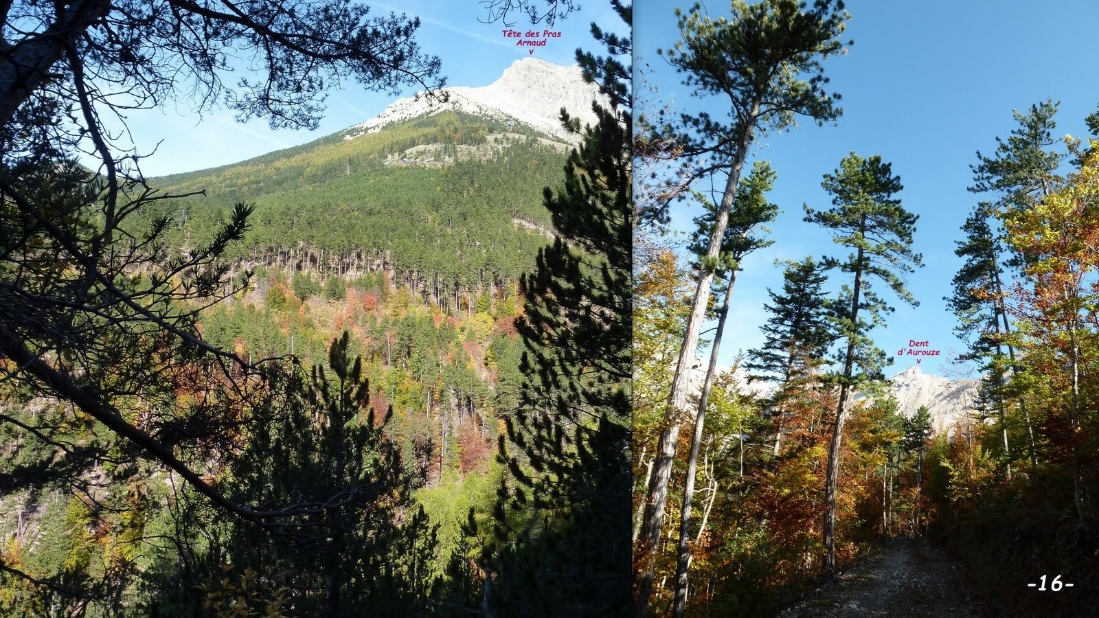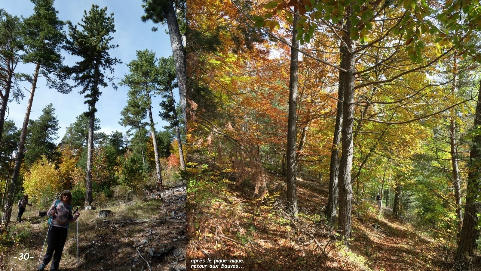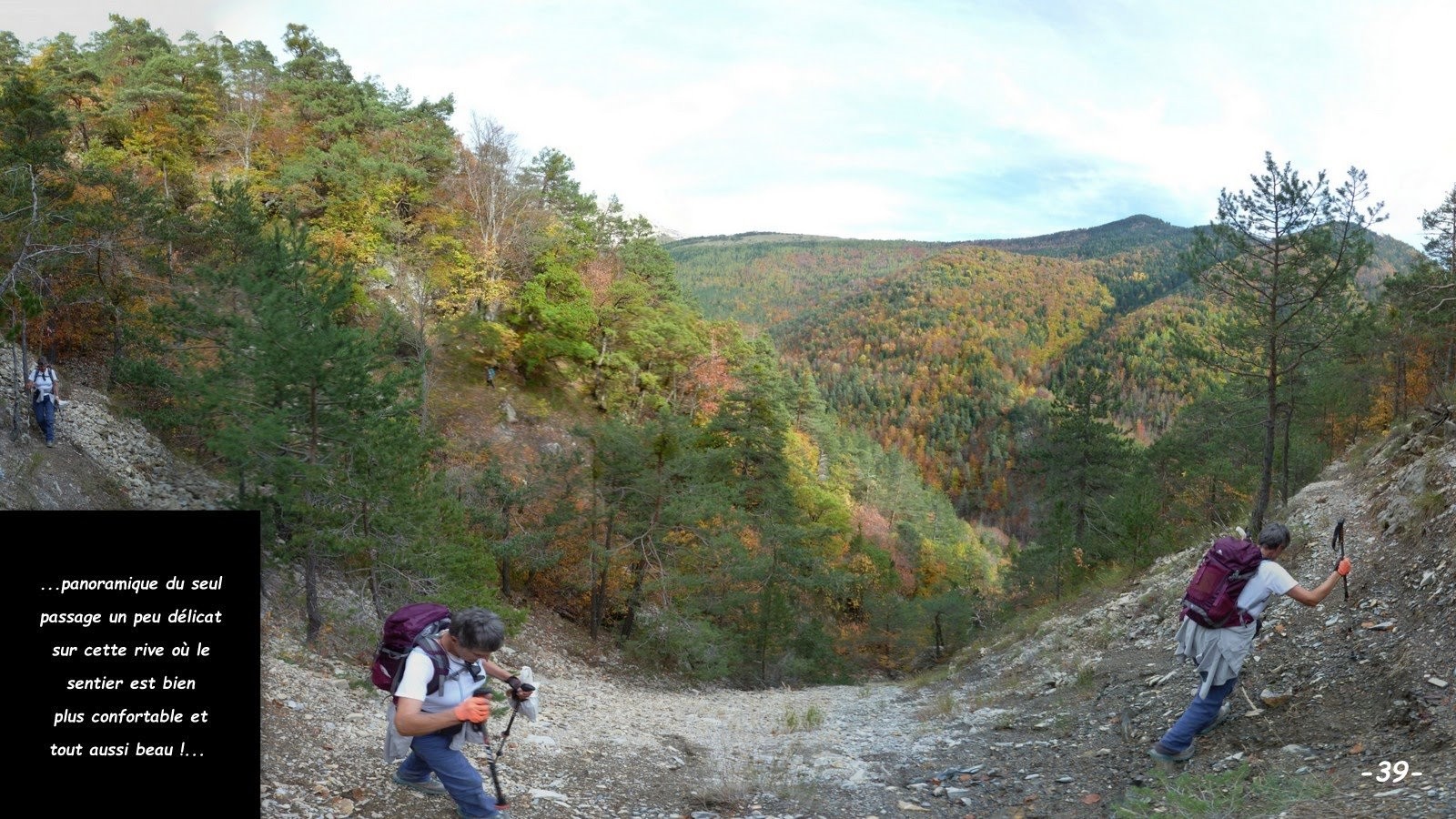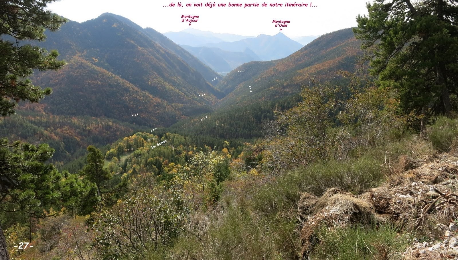 Après le flamboyant festival de couleurs automnales de vendredi dernier, j'ai dû sérieusement me creuser les méninges pour offrir à mes coéquipières une innovante récidive. Bien évidemment la vallée aux rives assez abruptes de la Sigouste avait été repérée sur l'IGN depuis longtemps, mais nous ne nous y étions encore jamais aventurés alors, les prévisions étant encore excellentes, il convenait de ne pas en rater l'occasion. De retour au parking, à voir leurs têtes et entendre leurs commentaires, mission accomplie ! cette randonnée leur a encore bien plu, même si l'ancien sentier de la rive gauche n'est plus entretenu depuis fort longtemps et présente plusieurs traversées de ravines un peu délicates, sur des pentes particulièrement raides pour lesquelles mieux vaut être bien chaussé et avoir un pied très sûr. Celui de la rive droite où la pente n'est pas aussi marquée, est bien moins sauvage et ne présente qu'un bref passage un peu délicat sur une vingtaine de m, dans la traversée de la ravine avant son passage au-dessus du Rocher de l'Ours. Mais attention, la passerelle en amont du Gué avant les Sauvas s'étant effondrée, suivant le niveau d'eau, sa traversée tout comme celle du gué peut poser problème (à l'exception de l'exceptionnelle réactivité de la Commune de la Roche-de-Rame, vu la désinvolture avec laquelle ont été traitées, quand elles le sont, mes différentes alertes sur SURICATE, je ne vais pas encore perdre mon temps à effectuer un nouveau signalement !). Le bonus que constitue la boucle du Sentier du Pic et du Chamois (sur la carte Top 25 de Géoportail) très bien balisé, ne présente aucune difficulté et est très plaisant. La variante au GRP sur la croupe du Serre Vieux est intéressante à double titre car elle évite quelques m de macadam et offre une très belle échappée sur Montmaur et la plaine entre les Vallées du Petit Buëch et de la Béoux, et même au-delà jusqu'aux abords de Veynes.