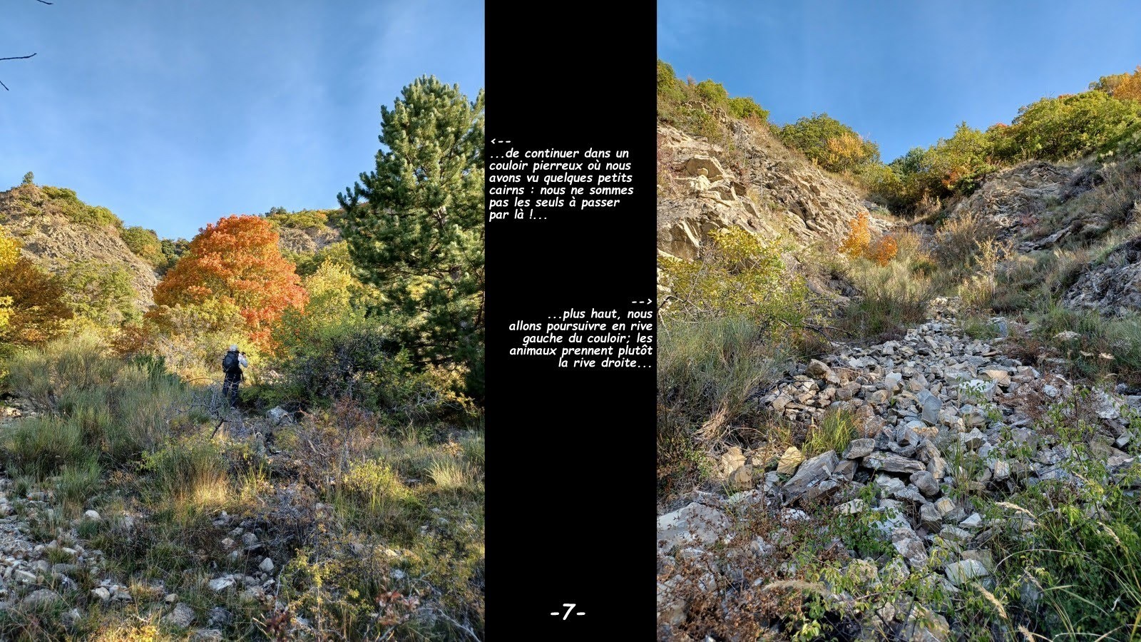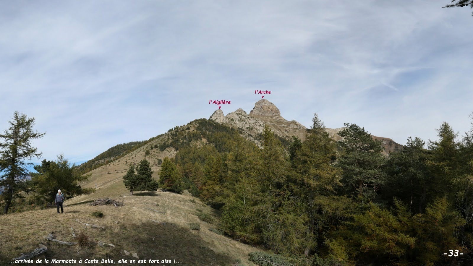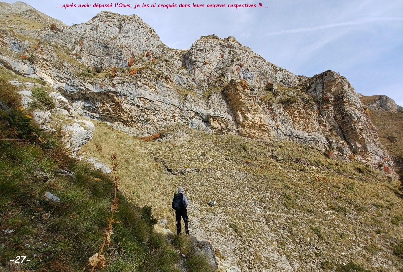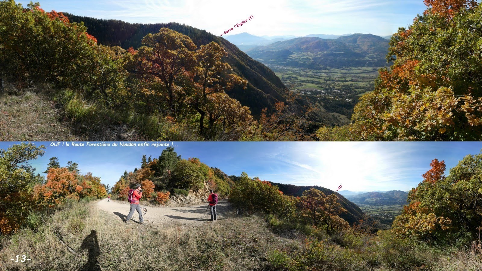 Couleurs d'Automne ! où aller pour bénéficier des plus belles ? dimanche en revenant de Merlette par le Col de Moissière nous avons trouvé que sa descente était la plus colorée de tout l'itinéraire, tandis que vue d'en face sur la RN94 la Forêt de Morgon, habituellement la plus colorée de tout le secteur, était encore bien verte. Alors l'Ours s'est creusé les méninges pour nous trouver les itinéraires les plus à même de nous satisfaire en Forêt Domaniale du Sapet. Après les tests d'au moins 3 scénarios, soit trop long, soit avec trop de dénivelé, soit le cumul des deux et la volonté de ne pas laisser la Marmotte seule sur des portions un peu trop scabreuses, il en est arrivé à ces 2 derniers qui s'harmonisent suffisamment bien pour que la Marmotte puisse en toute tranquillité à son rythme monter jusqu'à ce fameux sentier en balcon en partant de la Maison Forestière où il ne voulait pas qu'elle soit seule, tandis que partis de bien plus bas nous allions tester un original et des plus directs raccord entre la rive gauche du Ruisseau de St-Pancrace et la Route Forestière du Noudon pour, la Marmotte rejointe, effectuer ensemble la traversée du sentier normal du Piolit à la crête de Coste Belle. Très sauvage et relativement confidentiel parcours en balcon qui se mérite, sur un sentier particulièrement étroit et parfois même assez exposé, avec un cours passage câblé très détérioré donc d'autant plus dangereux, se méfier également des parties herbeuses en dévers pouvant se révéler particulièrement glissantes, toute chute en aval pouvant avoir des conséquences dramatiques. Quel dommage qu'un tel bijou ne soit plus entretenu ! probablement parce qu'aucune collectivité de quelque nature qu'elle soit ne veut pas en prendre la responsabilité !? il va de soi que nous n'y avons pas rencontré le moindre bipède, ça change du Piolit pourtant tout proche.