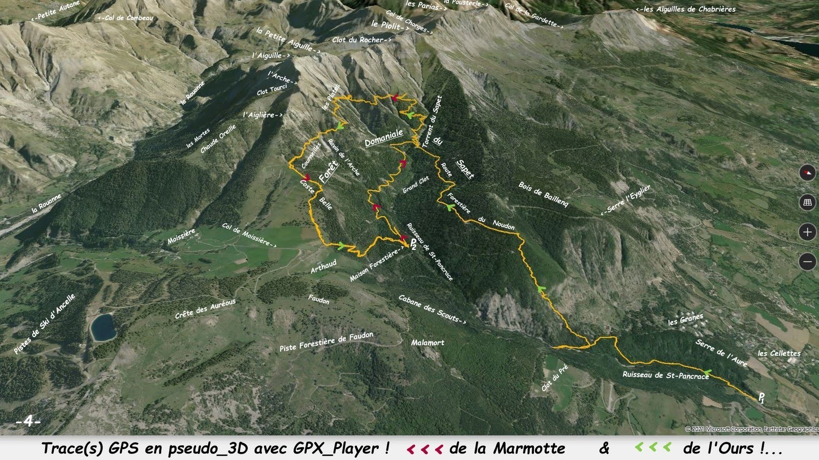 depuis P1, le parking, 1000m, dans l'épingle de la D214 sous Serre de l'Aure sur la route du Col de Moissière au-dessus des Borels (la Bâtie-Neuve) > sentier balisé des Granes, puis de la Cabane des Scouts jusqu'à son franchissement de la croupe qui fait suite à la très longue crête Sud-Ouest du Piolit qu'il suffit de remonter au mieux jusqu'à son croisement de la Route Forestière du Noudon (vagues traces d'animaux, ponctuées de quelques petits cairns, avec franchissement d'une petite barre rocheuse par un petit ravin et ou l'une de ses rives, nous avons emprunté celle de gauche et ainsi raté la draine de débardage de sa rive droite au-dessus de la dite petite barre !) > la Route Forestière du Noudon jusqu'à la rive droite du Torrent du Sapet d'où part le sentier classique du Piolit > le suivre jusqu'à l'épingle de la cote 1923m d'où part le sentier en balcon qui traverse quasiment horizontalement tout ce splendide (ça dépend pour qui ?!) adret (du Clot du Rocher jusqu'à l'Aiglière via les deux Aiguilles et l'Arche !), par les Plates et Courneilles jusqu'à la crête de Coste Belle (très spectaculaire sentier de chèvres, très étroit, avec quelques passages exposés dont une très courte portion câblée très dégradée, donc encore plus dangereuse, sujet au vertige et âme sensible s'abstenir !) > descendre au mieux la crête puis croupe de Coste Belle jusqu'à la D214t au Sud-Est du Col de Moissière > la suivre sur une centaine de m et prendre le premier sentier à droite qui conduit en quelques lacets et une diagonale Est à la Maison Forestière du Sapet et son parking P2, notre terminus par la grâce du Taxi-Marmotte.