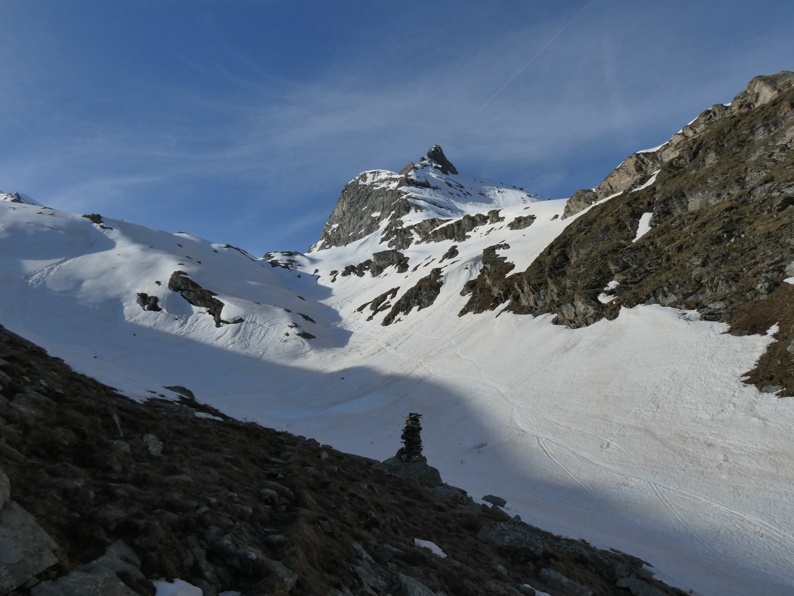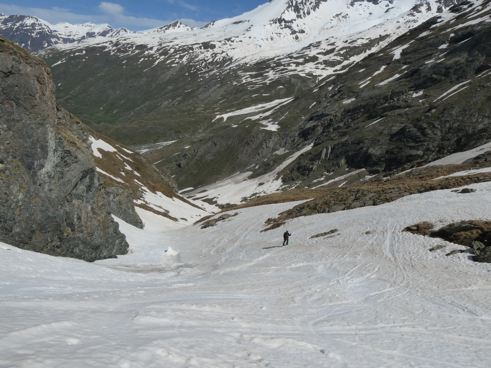 Vallon étroit et raide qui donne accès au vaste col d'Arberon, qui, cette année particulièrment bien enneigée, surtout en haute maurienne, se ski quasiment depuis le refuge.
