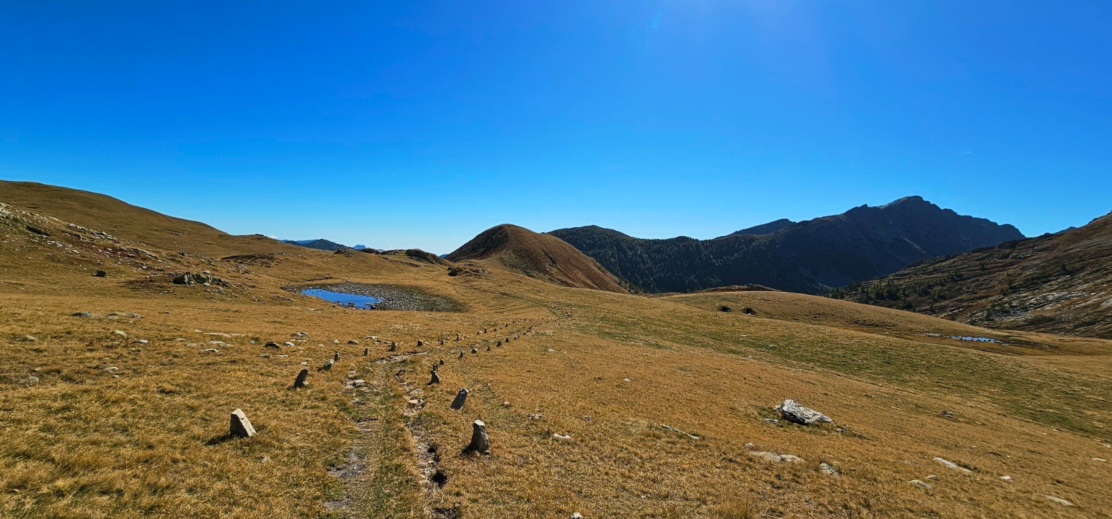 Depuis lac della Vacca, remonter au col ouest du Sabion par même itinéraire et traverser prairie pour rejoindre le col Est du Sabion. Une belle sente (non balisée) conduit directement à la crête de la cime du Sabion que l'on rejoint après bref aller-retour (0,58 km avec d+ 67 m en A/R). Sublime panorama sur ensemble des reliefs avoisinants avec vue spectaculaire sur le Viso qui se détache au nord-ouest. Une très belle phase aérienne longue de 2,13 km relie le sommet du Sabion aux contreforts de la cime de Barchenzane par une crête orientée sud-est, avant de rejoindre la balise 378 (photos n°21 et 22). Cette portion d'itinéraire est desservie par une bonne sente dominant quelques pentes très accentuées nécessitant une attention de circonstance, que l'on parcourt cependant sans grande difficulté (période estivale). Bel aperçu des lacs de Peïrefique depuis Barchenzane. Récupération du PR balisé à la B 378 avec douce déambulation par zone forestière jusqu'aux émouvants vestiges de l'ancienne caserne de Peïrefique avant retour à la baisse du même nom. Redescendre vers Casterino en empruntant momentanément l'ancienne piste routière jusqu'au 1er virage situé après la cabane pastorale de Peïrefique (contournement troupeau) et rejoindre à l'estime, plein sud, une sente "cairnée" bien marquée qui serpente au sud-ouest le long du vallon de Cardon.