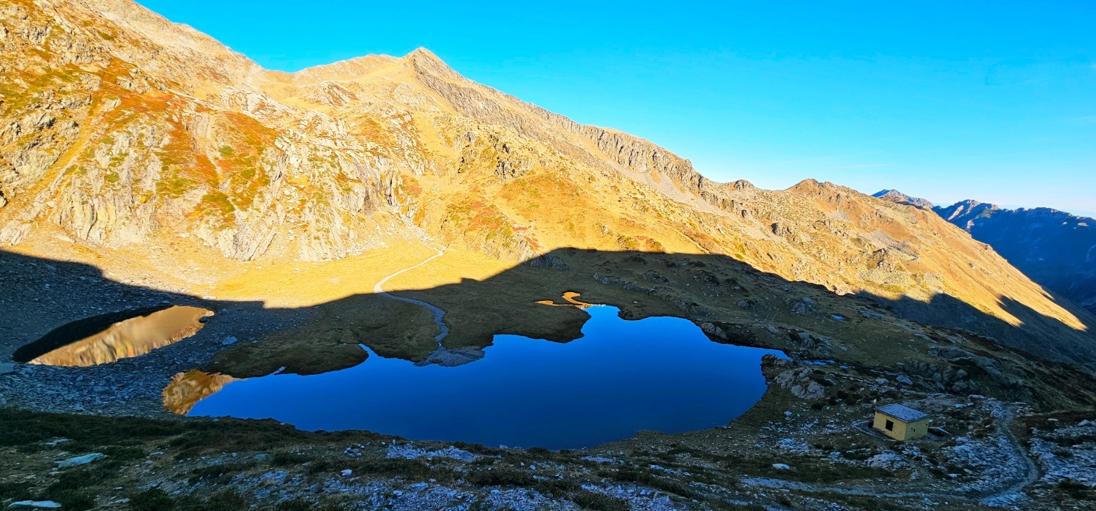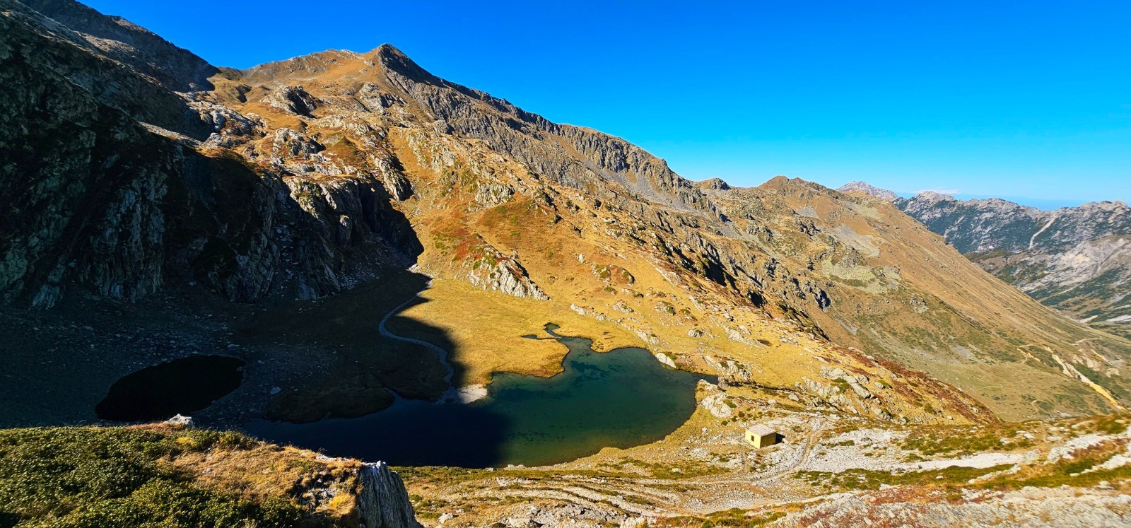 Depuis col Ouest du Sabion en surplomb du "lago della Vacca" et du bivacco Speranza sur rive Est.