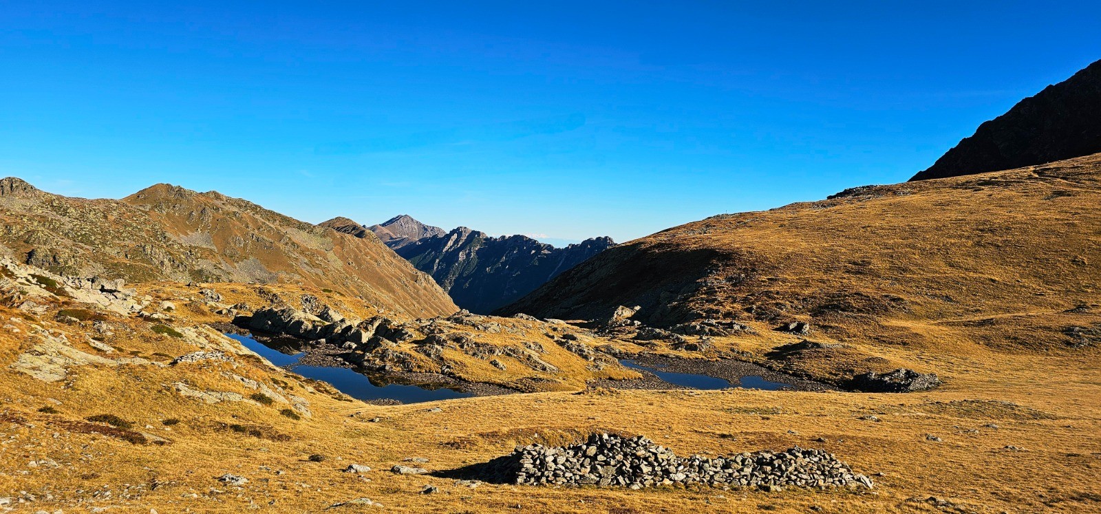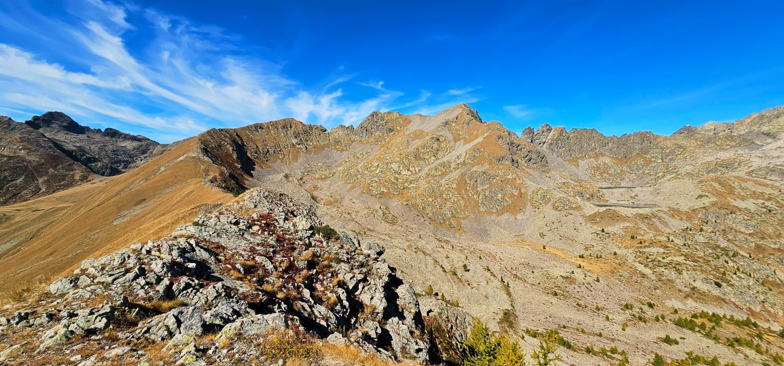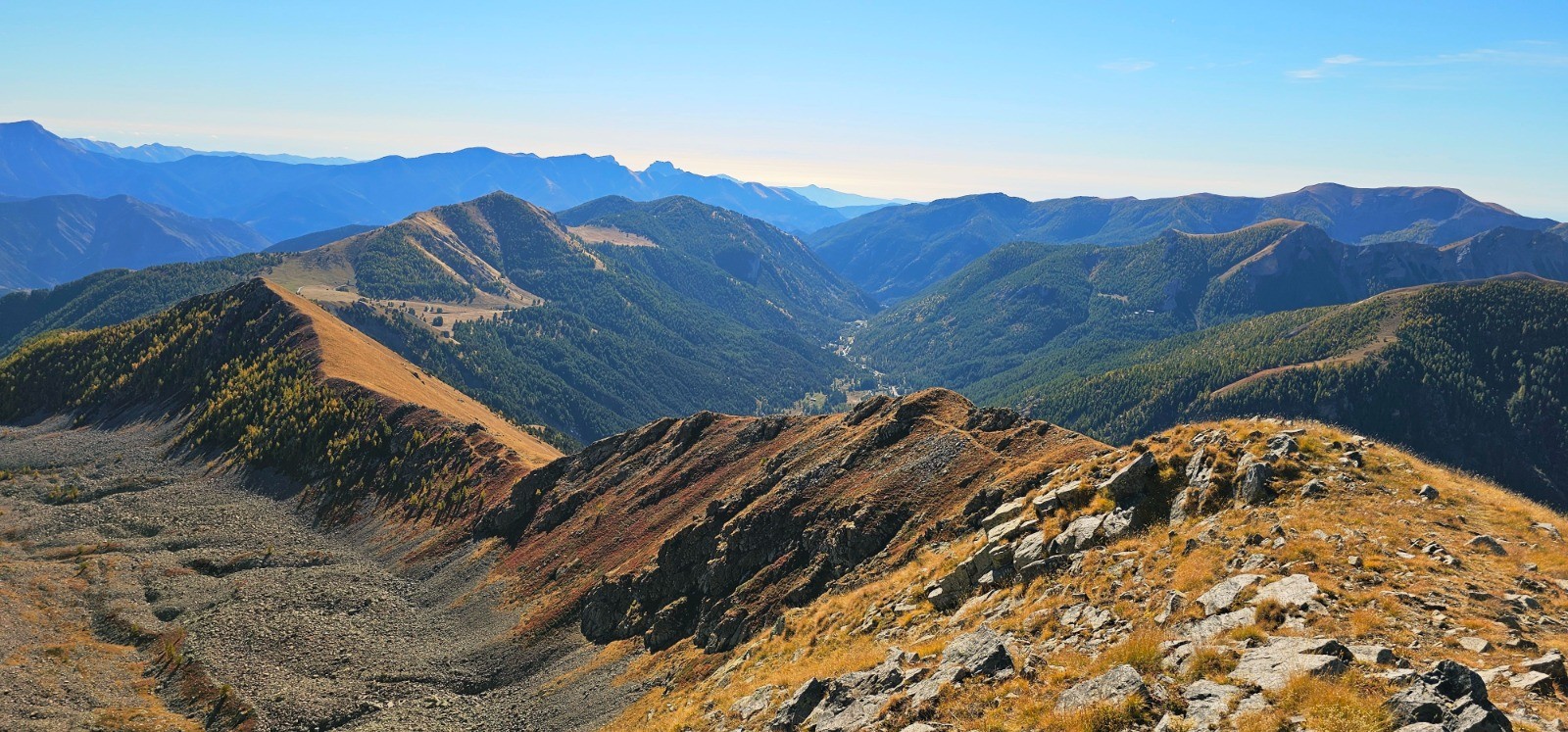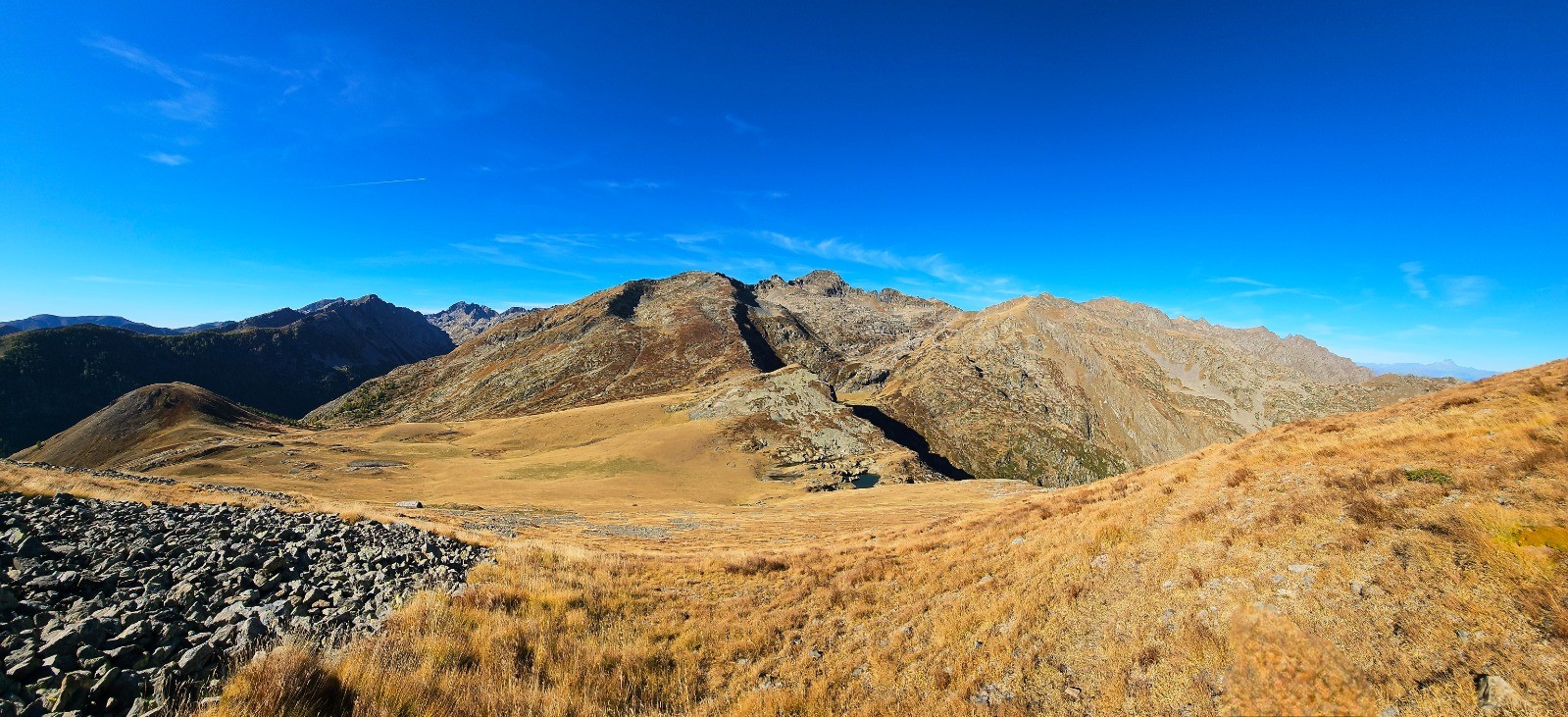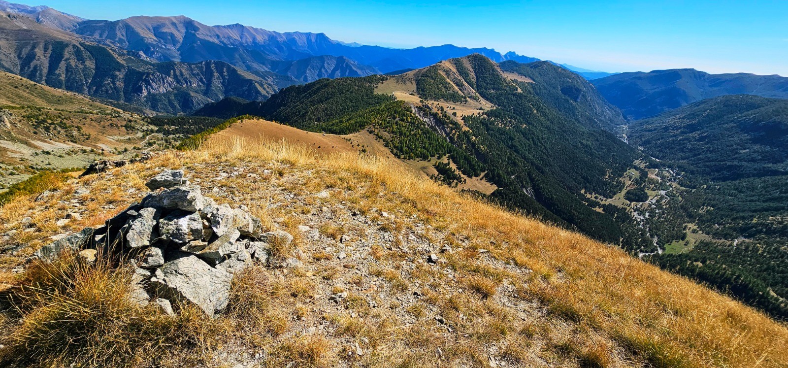 Cairn cime de Barchenzane. Vallon de Casterino à droite et baisse de Peïrefique dans l'axe crête