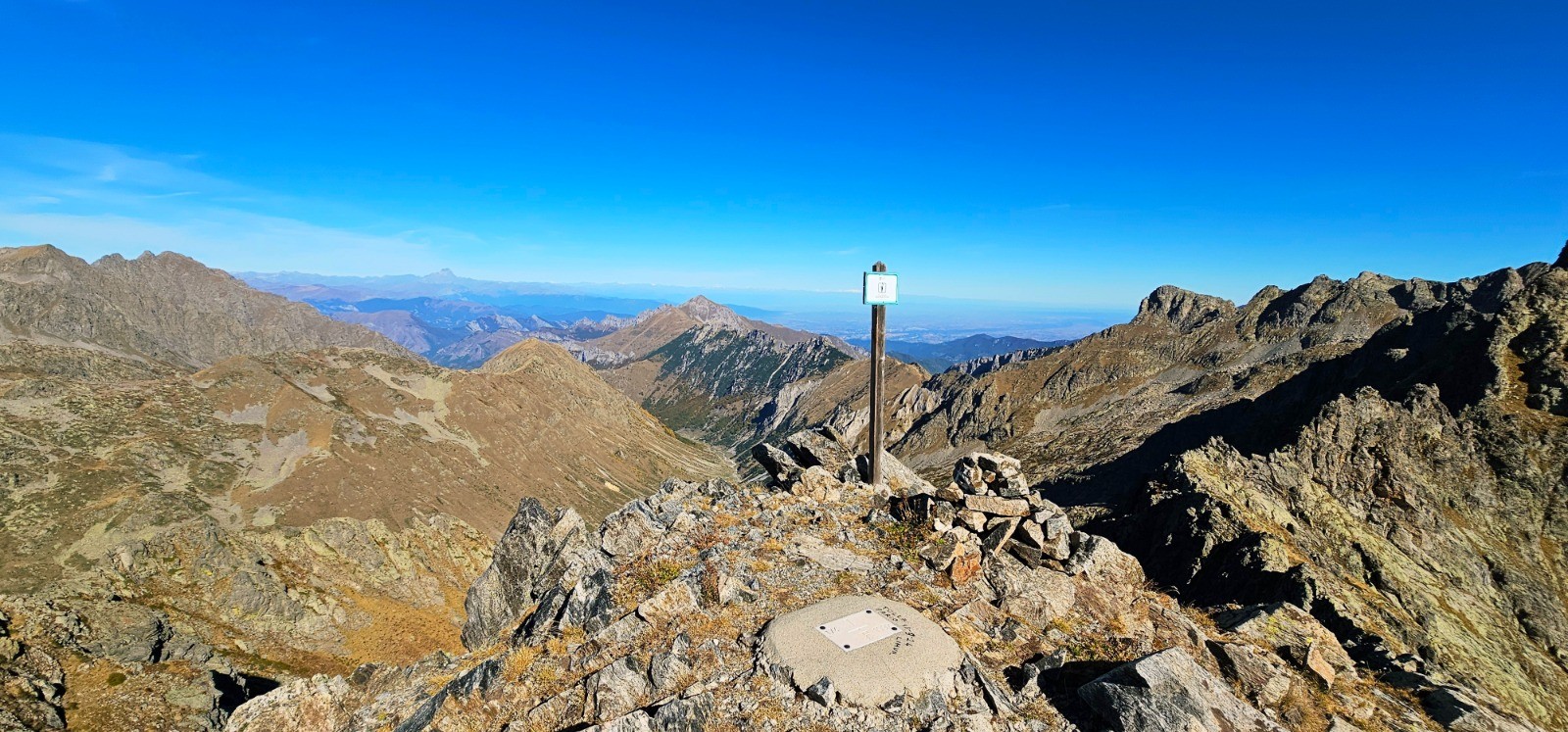 Depuis cime du Sabion, avec plaque frontalière franco-italienne. Mont Viso se détachant en ligne d'horizon.