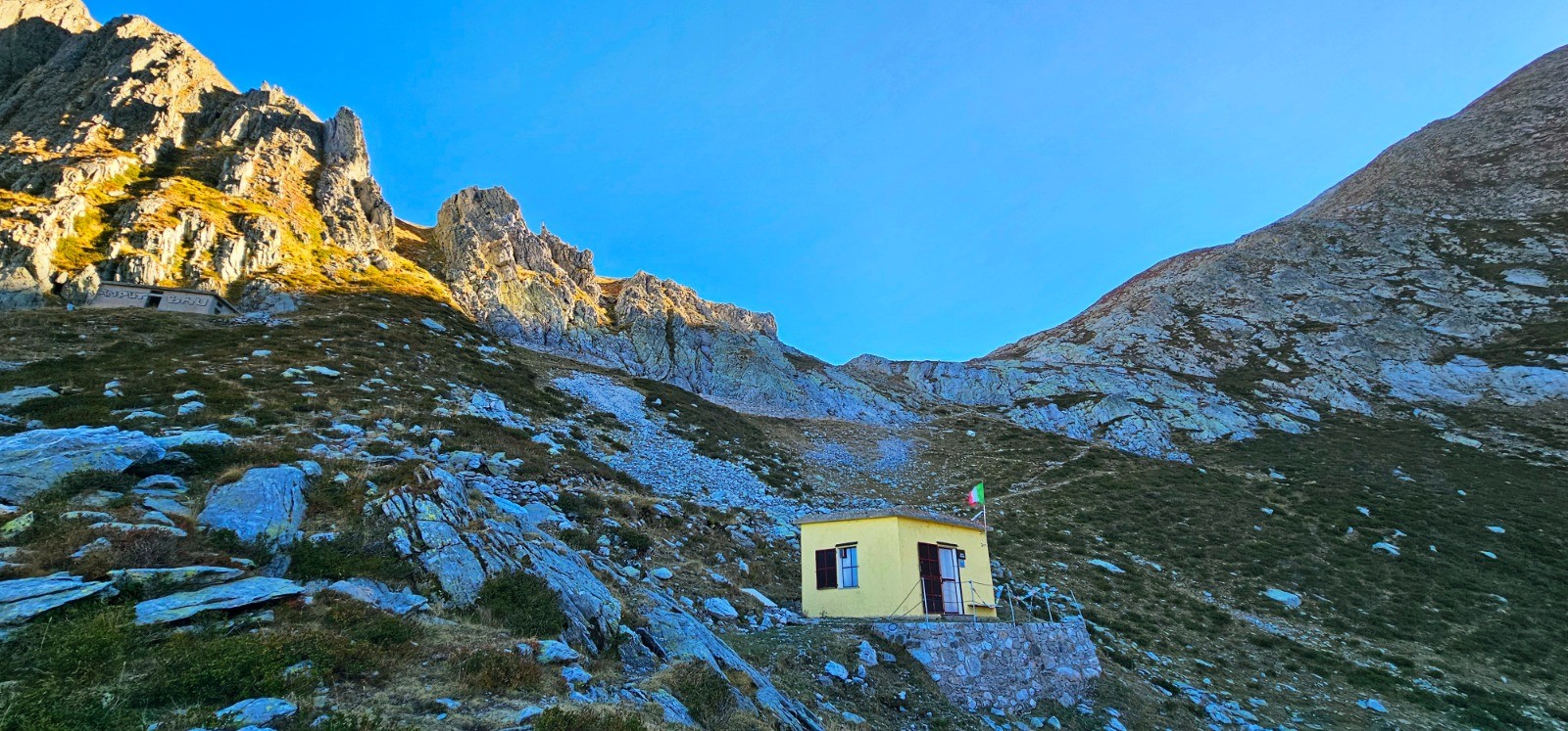 Ce circuit délaisse momentanément le PR à la B 370 pour bref détour jusqu'à la cime débonnaire de Gratin (2139 m) et son intrigant blockhaus que l'on aperçoit depuis le Val Casterino. Récupérer aisément le PR et poursuivre itinéraire balisé (marquage jaune) par très beau cheminement en balcon sur les pentes du mont Barchenzane, conduisant au replat de la B 373 et aux premiers "laquets" rencontrés. Immenses pelouses pacagées délimitées par les cols Est et Ouest du Sabion qui étaient stratégiquement défendus par plusieurs blockhaus dans le cadre d'une zone fortifiée enserrant les 3 lacs du Sabion et les barres rocheuses de la frontière actuelle surplombant le splendide lac della Vacca. Après avoir parcouru à son gré ces vastes étendues, on accède au lac inférieur della Vacca par une courte descente (0,53 km avec d- 45 m) depuis le col ouest. Voir l'étonnante casemate (galerie souterraine avec 2 accès) située à mi-hauteur. Il est utile de préciser qu'un refuge remarquable ("bivacco Speranza") est implanté sur la rive Est du lac à 2270 m. Ce bâtiment non gardé est géré par le Club Alpino Italiano. Il est très bien entretenu et reste dédié aux randonneurs avec de multiples équipements (électricité, etc...). Accès libre (9 couchages) qui a constitué une belle alternative au bivouac sous tente initialement envisagé, et qui m'a ainsi préservé d'un froid mordant !