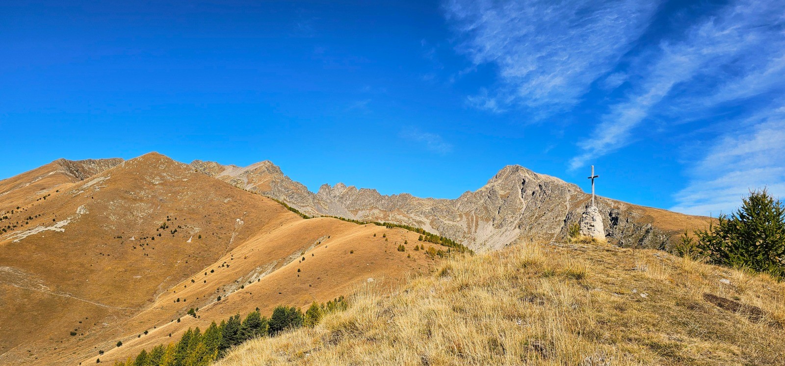 Cime de Gratin avec sa croix en bois. Cime de Barchenzane sur ligne de crête (1er sommet à gauche) et Roche de l'Abisse au plus près de la croix.