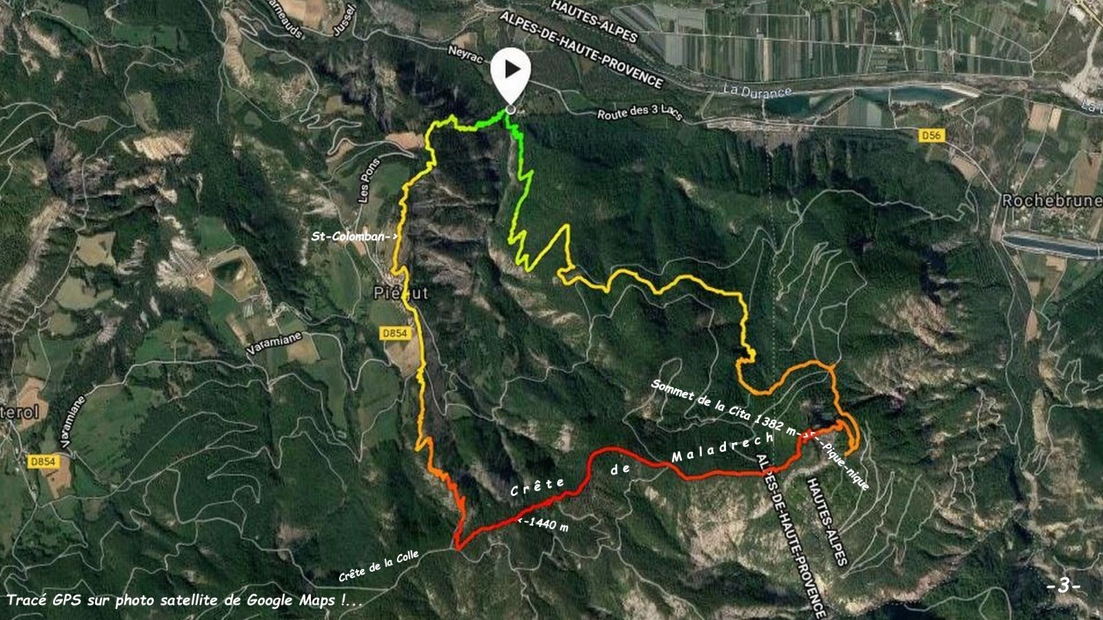 La volonté d'étendre le circuit balisé du Tour du Ravin de Neyrac qui passe par le Bois et le village de Piégut et St-Colomban, à la Crête de Maladrech, hors balisage, confère à cette randonnée un fort caractère sportif dans un environnement particulièrement sauvage, même en prenant soin d'éviter nos déboires pour le sommet de la Cita, abondamment détaillé et commenté ci-dessous (pour cela : du carrefour des routes forestières, à la cote 1200 m, au-dessus de Ratier, suivre la piste forestière jusqu'au collet, coté 1339 m, au Sud-Ouest du Sommet de la Cita et, si affinité, effectuer un sauvage aller-retour au sommet pour son très intéressant panorama Nord-Est).