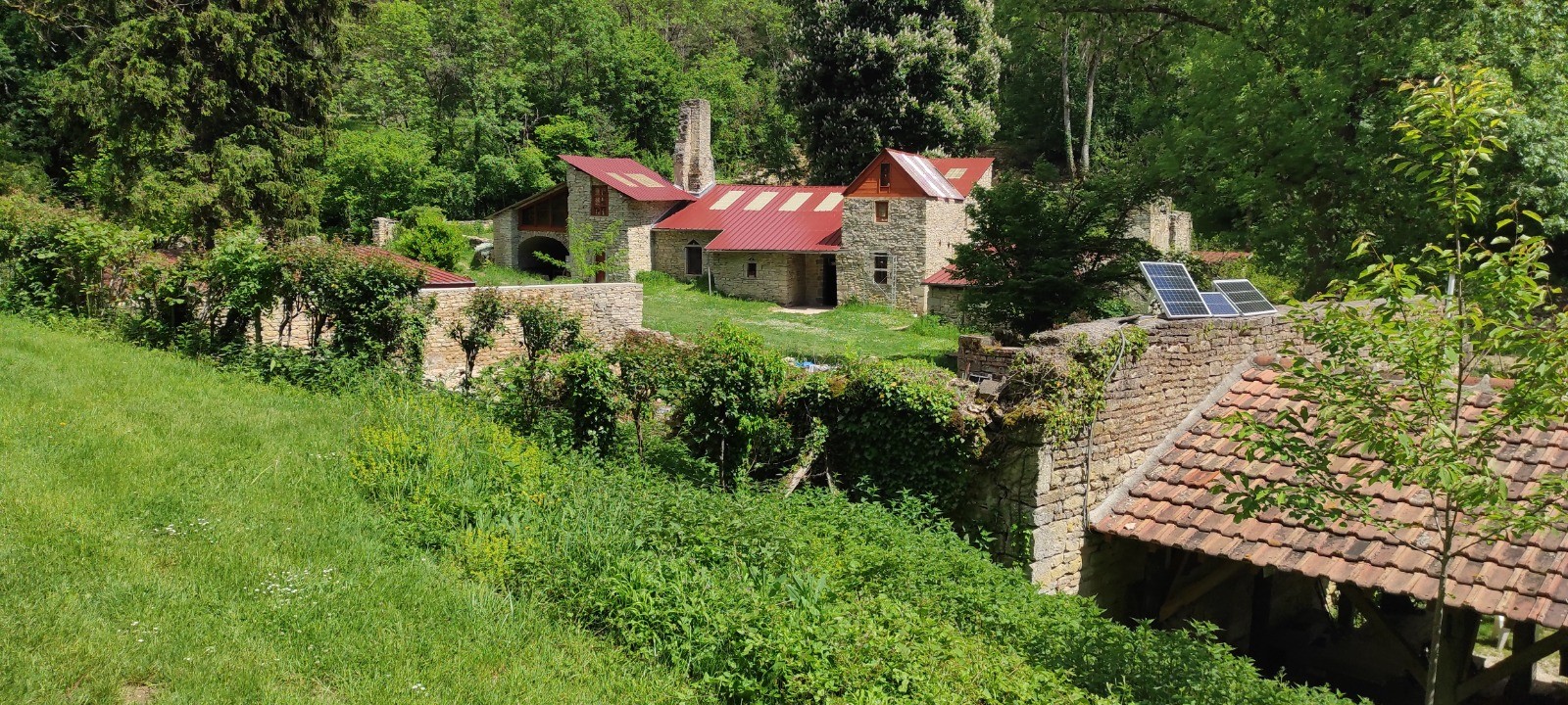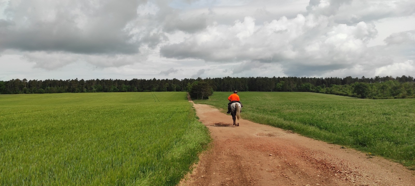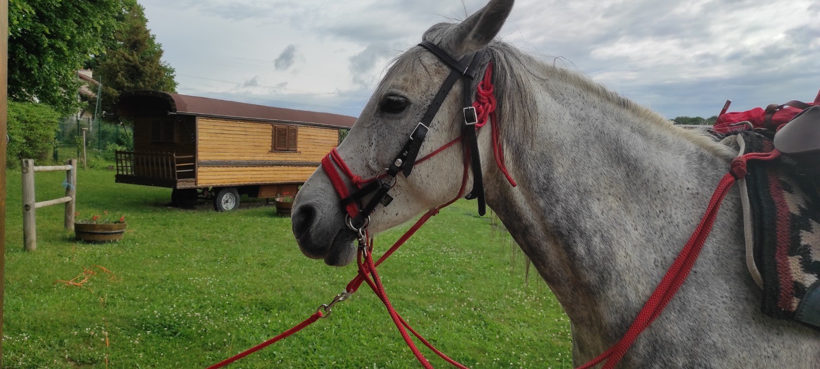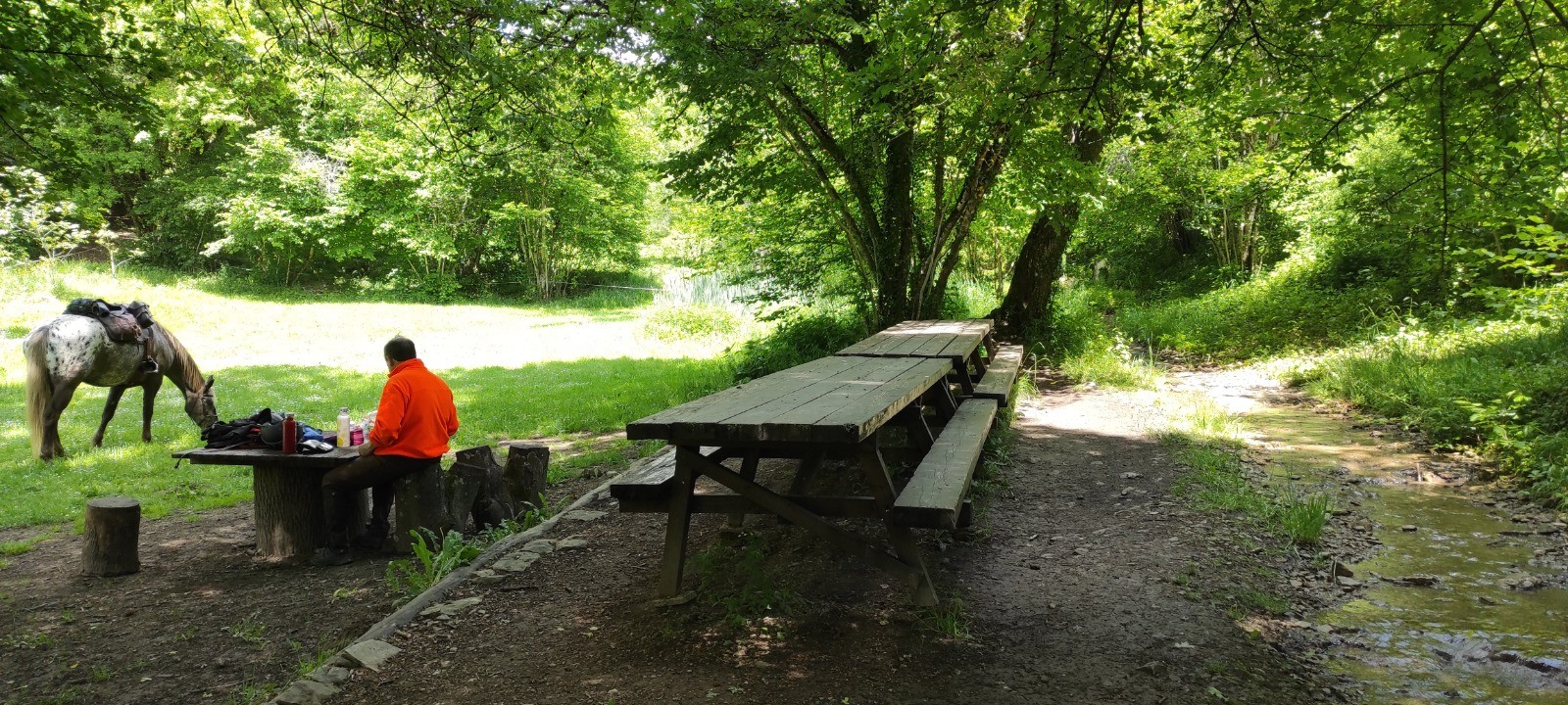 Au départ de la roulotte de Montfee. Nos chevaux dans le parc à côté, nous logés dans la roulotte. Pour le tracé quelques mésaventures.