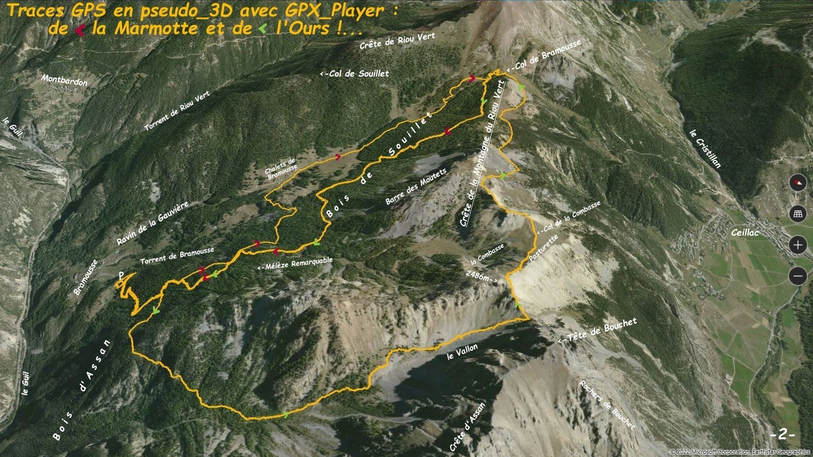 depuis le petit parking avant le panneau indiquant que la route des Chalets de Bramousse est réservée aux ayant droit, 1521m > trouver parmi les nombreuses sentes à vaches le bon départ du sentier des Bois d'Assan et de Souillet en tiretés noirs sur la Top 25 de l'IGN (particulièrement agréable jusqu'à sa bifurcation entre les 2 bois, il est un peu plus compliqué à suivre vers le Bois de Souillet (la Marmotte s'en étant bien mieux accommodée à la montée que l'Ours à la descente!), nettement plus sportif et spectaculaire vers le Bois d'Assan jusqu'au pied du Vallon où il se perd, tout comme sur l'IGN (il est à noter cependant que nous avons été agréablement surpris de constater que certains passages ont été récemment piochés et pelletés, la pioche et la pelle à l'état neuf étant encore coincées dans une anfractuosité rocheuse en amont de sa bien belle traversée des nervures rocheuses en aval de la cote 2130m, laissant supposer qu'une action de réhabilitation est en cours ?!) > la suite est un véritable délice de sauvage à tel point qu'on pourrait naïvement penser être les premiers explorateurs, situation particulièrement rare dans nos montages : pas la moindre herbe foulée, pas un seul cairn en vue et à peine une très vague sente entrevue juste sous le col, un peu trop en lacets pour être du seul fait des chamois ! résultat, la seule navigation à vue s'impose ! Nous avons choisi de privilégier la rive droite bien boisée et peu caillouteuse jusqu'à la cote 2117m, offrant un confortable collet d'accès d'une petite combe ouverte sur tout l'amont du Vallon, une véritable pépite en son genre, ornée d'une petite dorsale rocheuse que nous nous sommes empressés de remonter avec, cerise sur le gâteau, une petite dent rocheuse, belvédère idéal pour un tour d'horizon complet des lieux d'une rare sauvagerie > poursuivre à niveau pour rejoindre au mieux le fond du talweg en traversant un petit bosquet de mélèzes séculaires d'une allure peu commune, tous jadis étêtés, au milieu d'un pierrier de gros bocs qui se franchit assez facilement > la suite est encore plus aisée dans un pierrier relativement clairsemé, récemment bombardé par les nombreux blocs peu volumineux provenant de l'effondrement de tout un pan de falaise de soutènement du sommet coté 2486m, non nommé sur l'IGN > la suite jusqu'au col est d'une simplicité déconcertante, un vrai délice que nous avons d'autant plus apprécié, nous qui nous attendions à une sortie plus ou moins pénible ! > du col, 2396m, remonter la crête au mieux au plus près de son fil et rejoindre celle de Pasturette à proximité du cairn sommital où, pour le spectacle, un A/R paraît s'imposer > rejoindre le Col de la Combasse par le fil de la crête (plus sportif) ou par la sente qui court sur son flanc gauche > du Col l'Ours avait prévu de contourner toute la Crête de la Montagne du Riou Vert jusqu'au Col de Bramousse par le sentier, mais nous n'avons pas résisté au plaisir de passer par la bosse cotée 2423m et toute la crête jusqu'au collet coté 2353m, en souvenir de son spectaculaire parcours en raquettes en