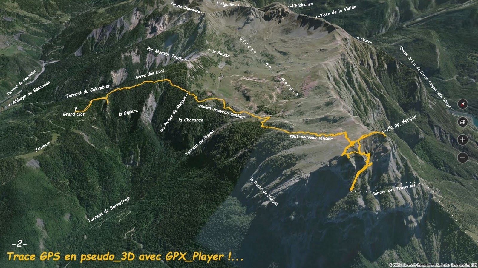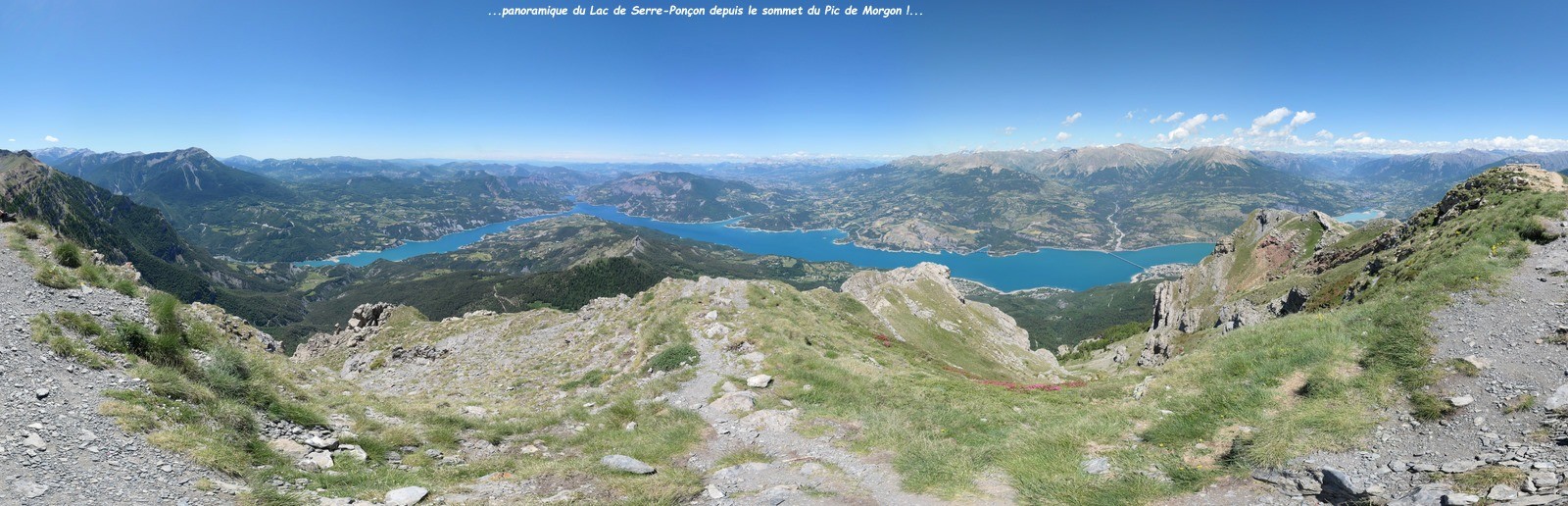 Le Pic de Morgon : pour cette nième visite, dont le seul but est de profiter d'une excellente météo pour réaliser des panoramiques pour la décoration de leur nouvel appartement, avec un départ contraint et très tardif, l'Ours avait décrété qu'il garderait leur trace privée. Mais, suite à la découverte de la dernière section du tout nouveau tracé du sentier d'accès au sommet dont les confortables lacets sont bien taillés dans la solide pente rocheuse semi-herbeuse bien à droite de l'ancien très gravillonneux et particulièrement pénible pour un sommet aussi fréquenté qui les a enchantés d'une part et d'autre part satisfait de sa collection de panoramiques, il est revenu sur sa décision, pour le cas où certains visiteurs seraient intéressés par l'information et les vues offertes par ce sommet mythique, d'où nous sommes bien obligés de reconnaître qu'il offre un somptueux panorama à 360°. Revers de la médaille, sa surfréquentation quasi-infernale du 14 juillet au 15 août qui justifie les investissements consentis pour la réhabilitation de ses accès et l'instauration par la municipalité de Crots d'un péage en guise de régulateur pour l'accès au parking du Grand Clot, à quand une navette obligatoire comme dans de nombreux sites à protéger ?