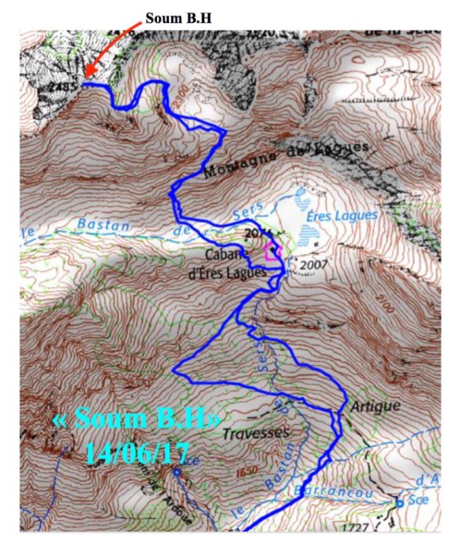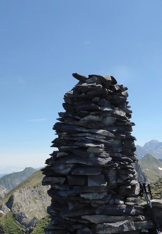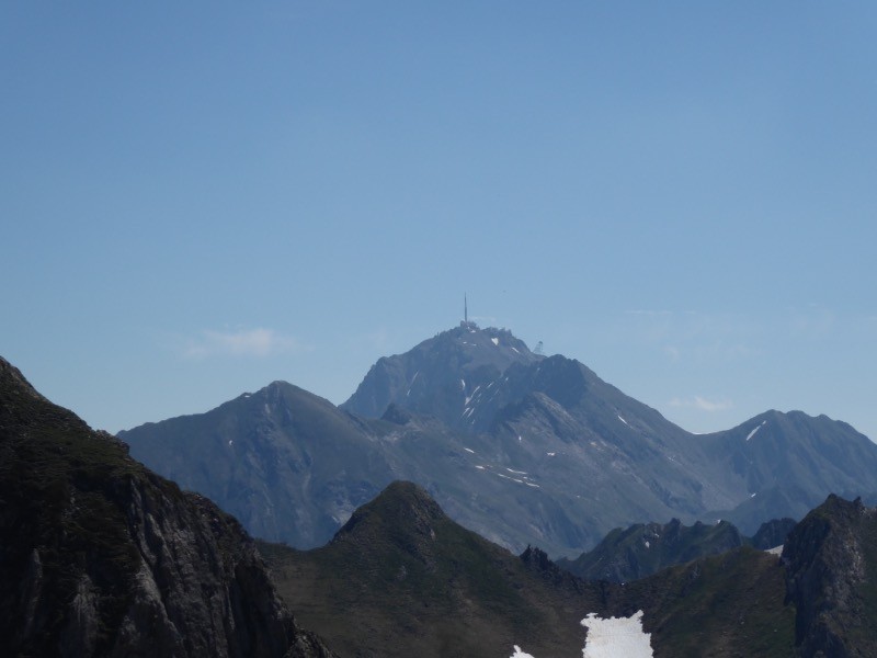 Superbe course qui nous fait nous installer devant le Soum Arrouy. Ce sommet ne porte pas de nom, mais semble visité car le cairn sommital est assez imposant, il fait plus d'un mètre de haut.Vue splendide sur la chaîne depuis le Pic du Midi de Bigorre à l'est , Le Néouvielle, le Mont Perdu , le Cylindre du Marboré , L'Epaule, la Tour, Le Casque, la Brêche, Le Taillon ,Le Gabeitous, La Grande Fache, Le Balaïtous, le Pibeste à l'ouest .....