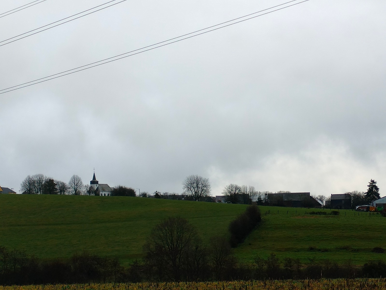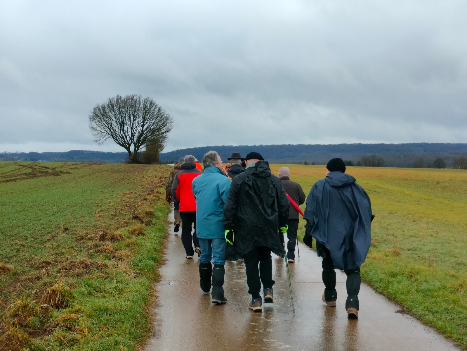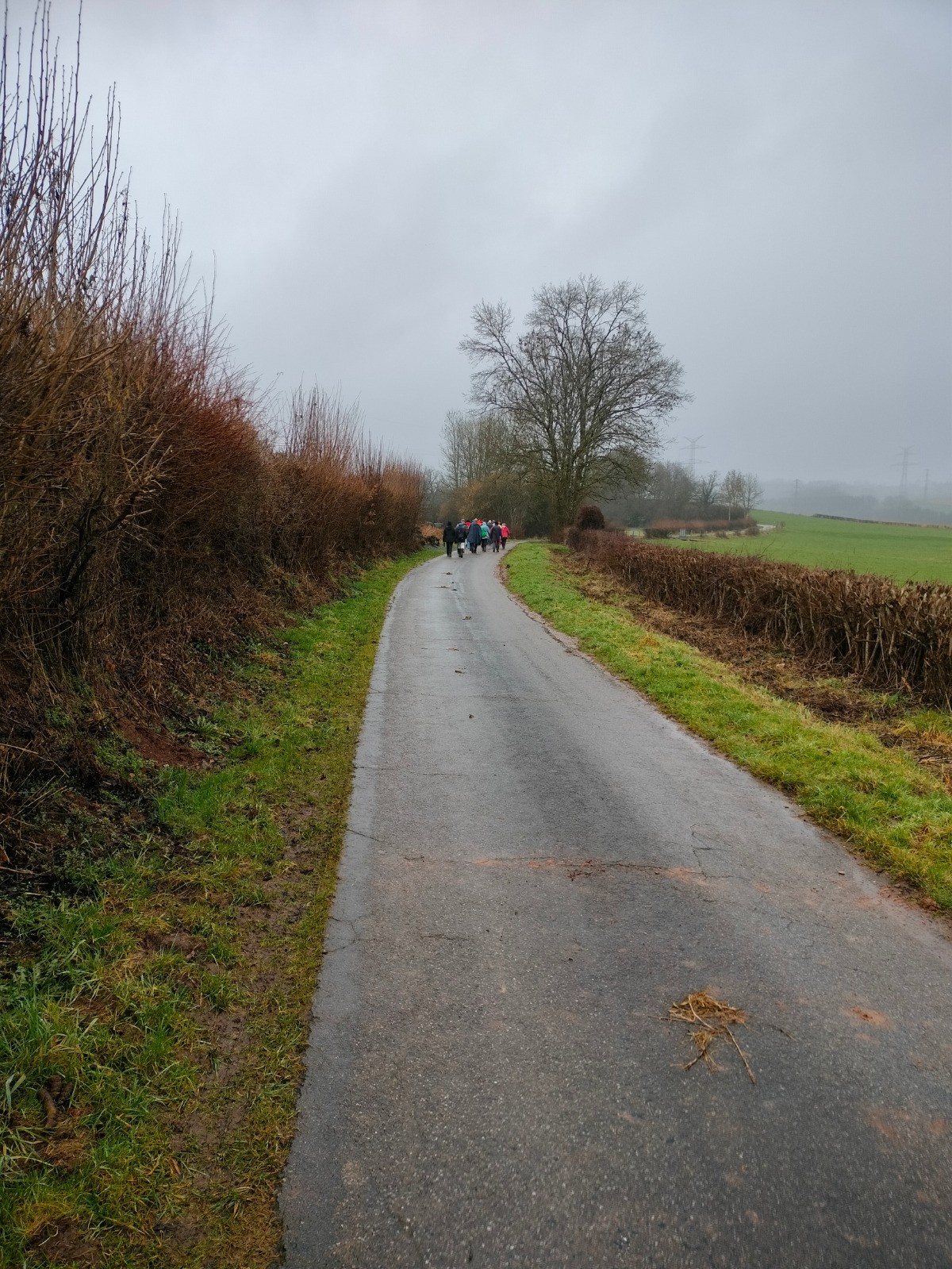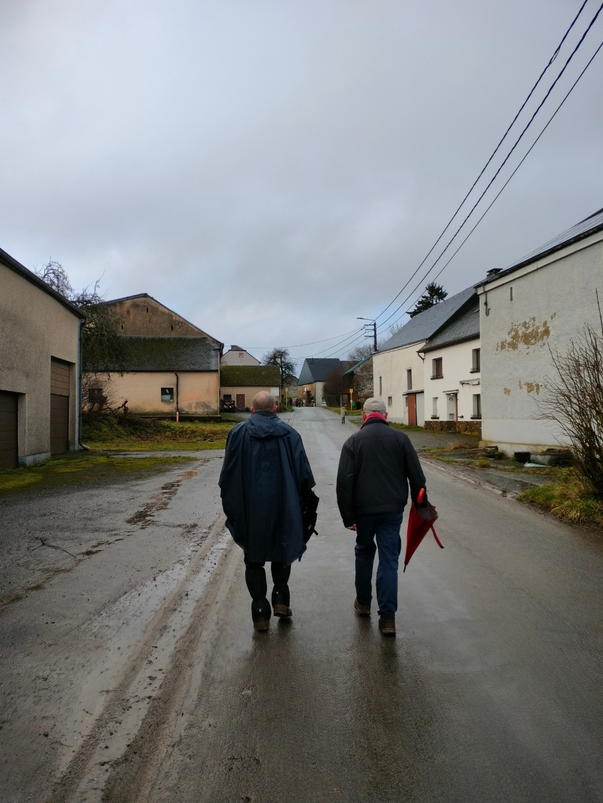 rue du Cercle, puis vers l’église dont le clocher, comme une aiguille discrète coud le ciel bas à l'horizon. Le village réapparaît, flou et apaisant derrière l’averse qui s’éclaircit et au sommet d'une dernière montée. Nous rentrons trempés, mais le cœur léger — comme après avoir traversé plus qu’un paysage : un moment suspendu, offert par l’hiver et la pluie.