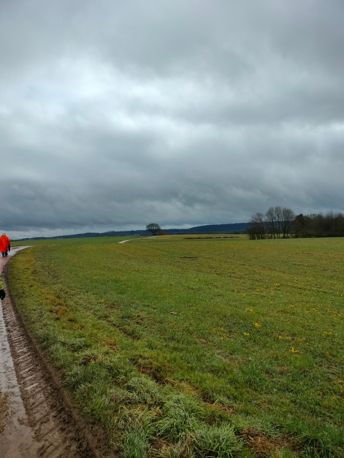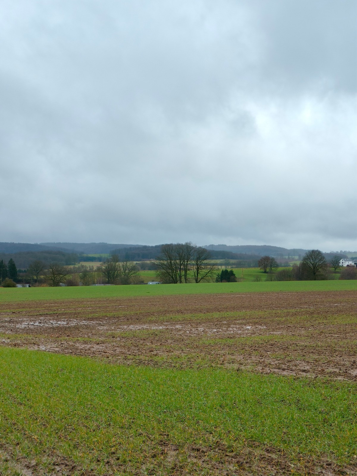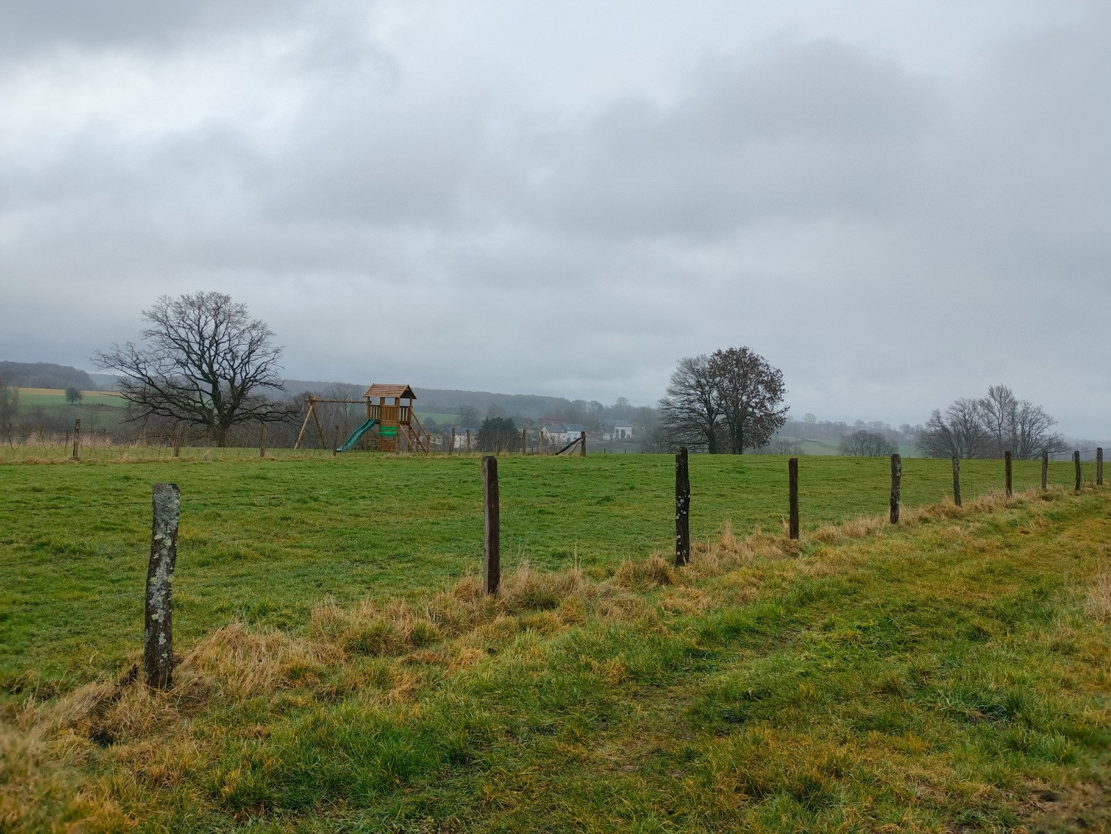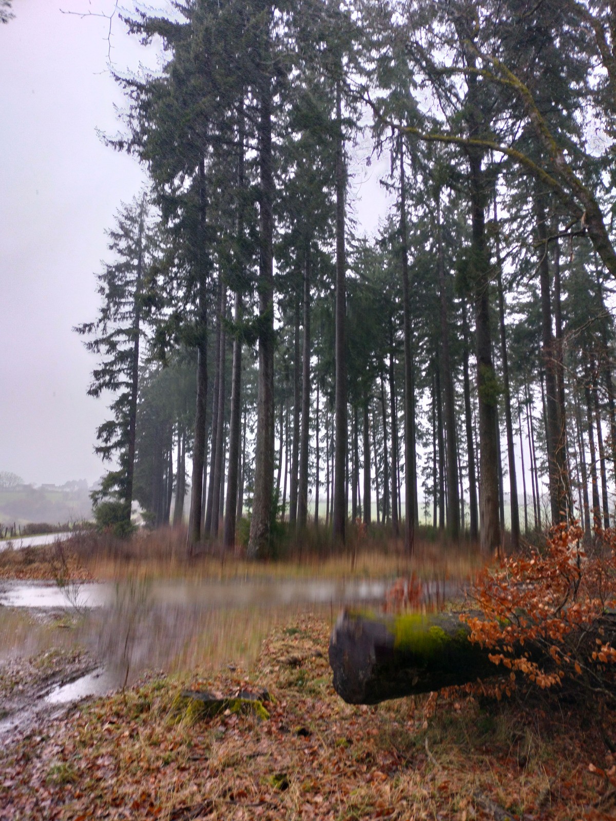 rue du Cercle, puis vers l’église dont le clocher, comme une aiguille discrète coud le ciel bas à l'horizon. Le village réapparaît, flou et apaisant derrière l’averse qui s’éclaircit et au sommet d'une dernière montée. Nous rentrons trempés, mais le cœur léger — comme après avoir traversé plus qu’un paysage : un moment suspendu, offert par l’hiver et la pluie.