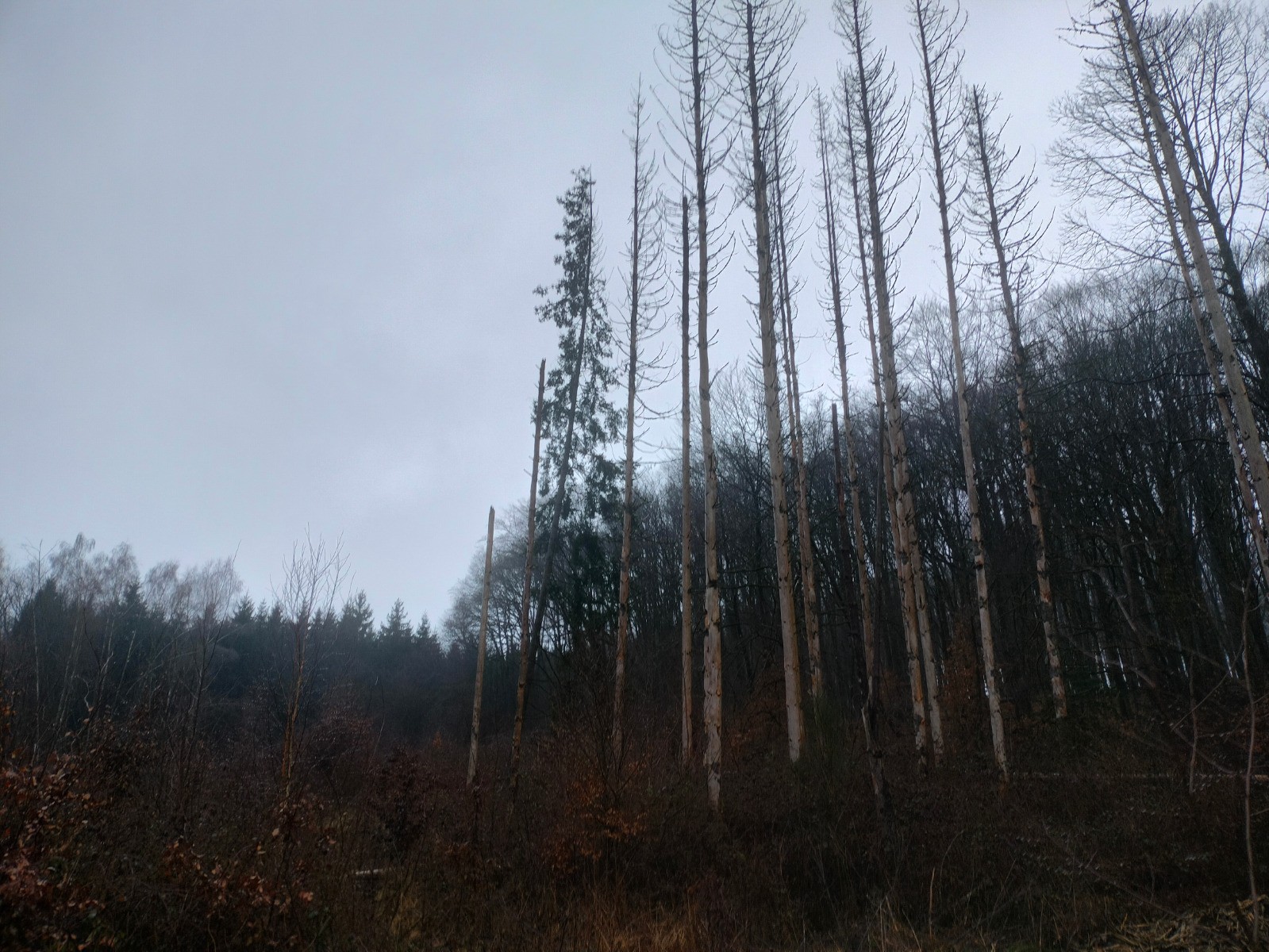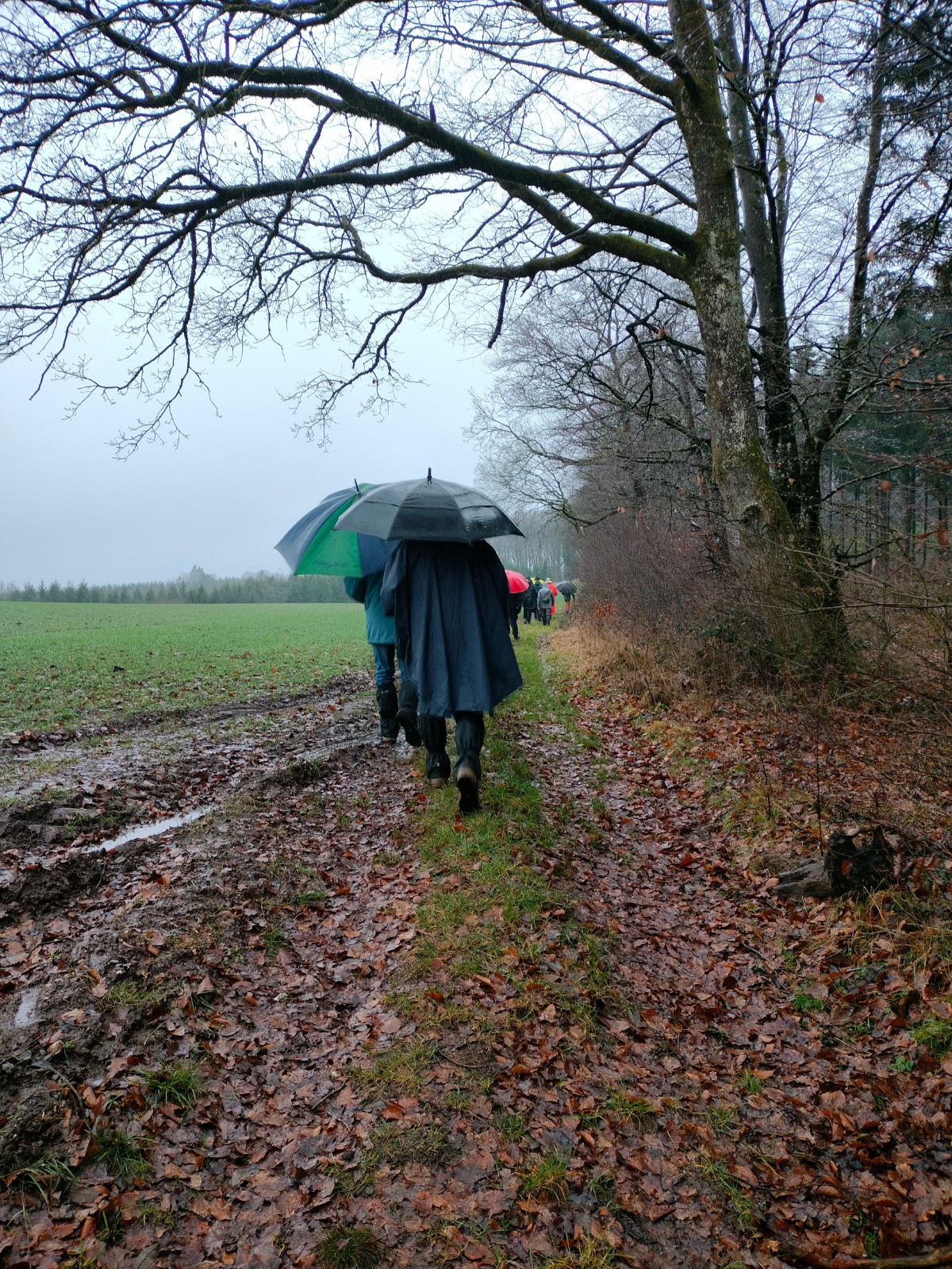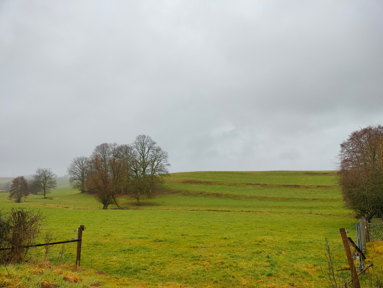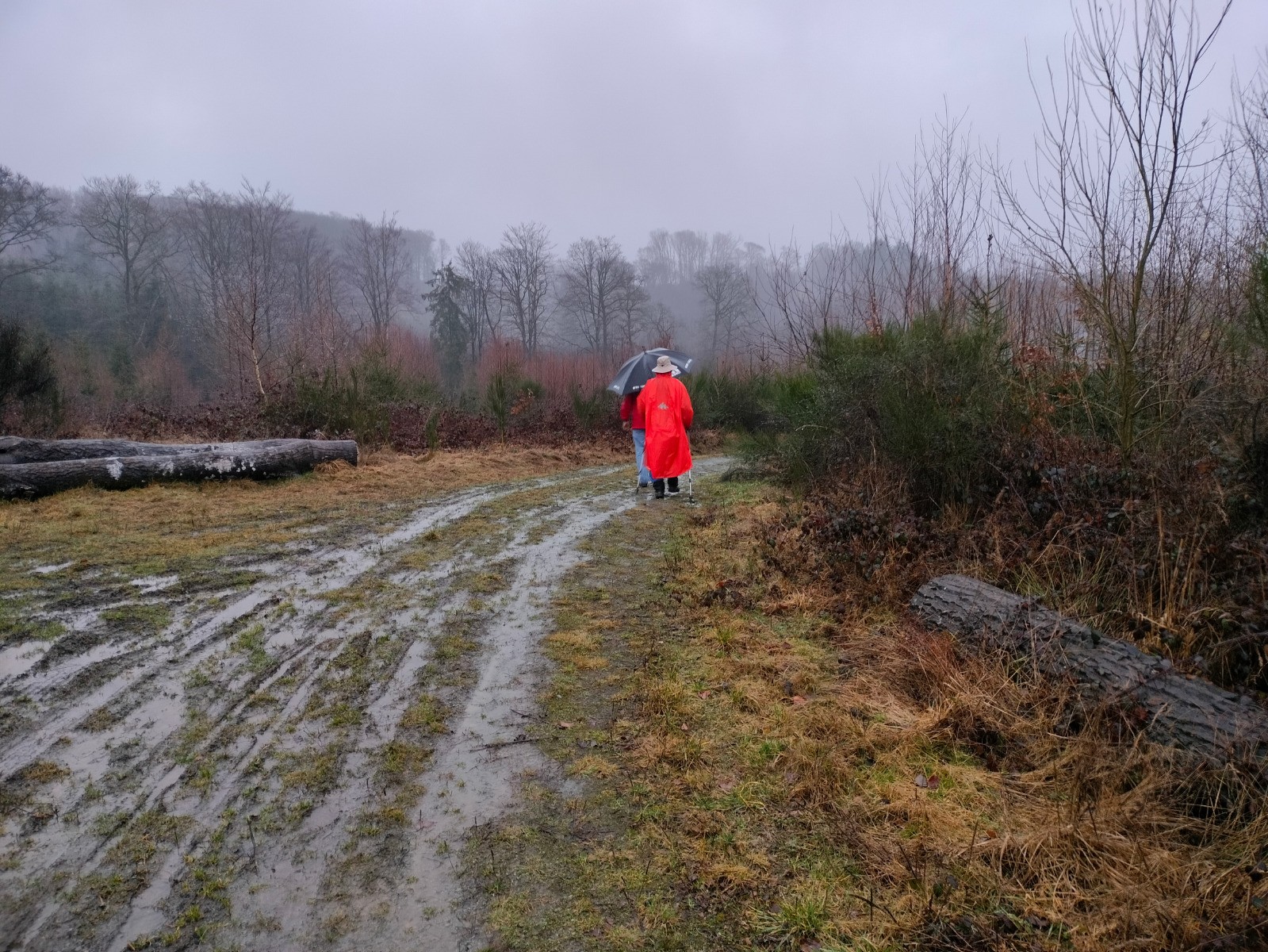 rue du Cercle, puis vers l’église dont le clocher, comme une aiguille discrète coud le ciel bas à l'horizon. Le village réapparaît, flou et apaisant derrière l’averse qui s’éclaircit et au sommet d'une dernière montée. Nous rentrons trempés, mais le cœur léger — comme après avoir traversé plus qu’un paysage : un moment suspendu, offert par l’hiver et la pluie.