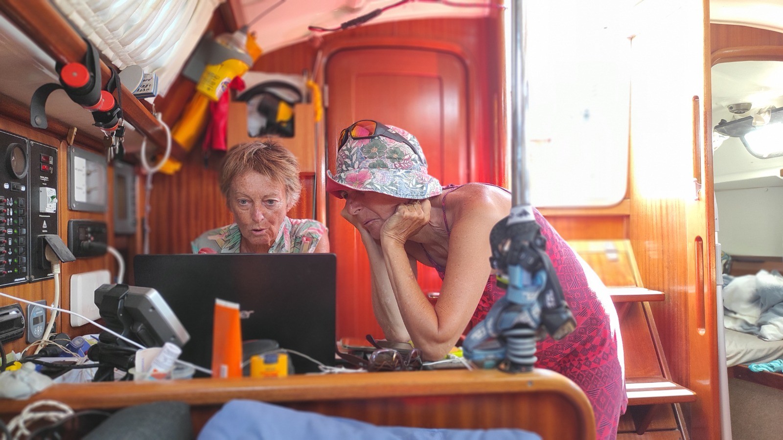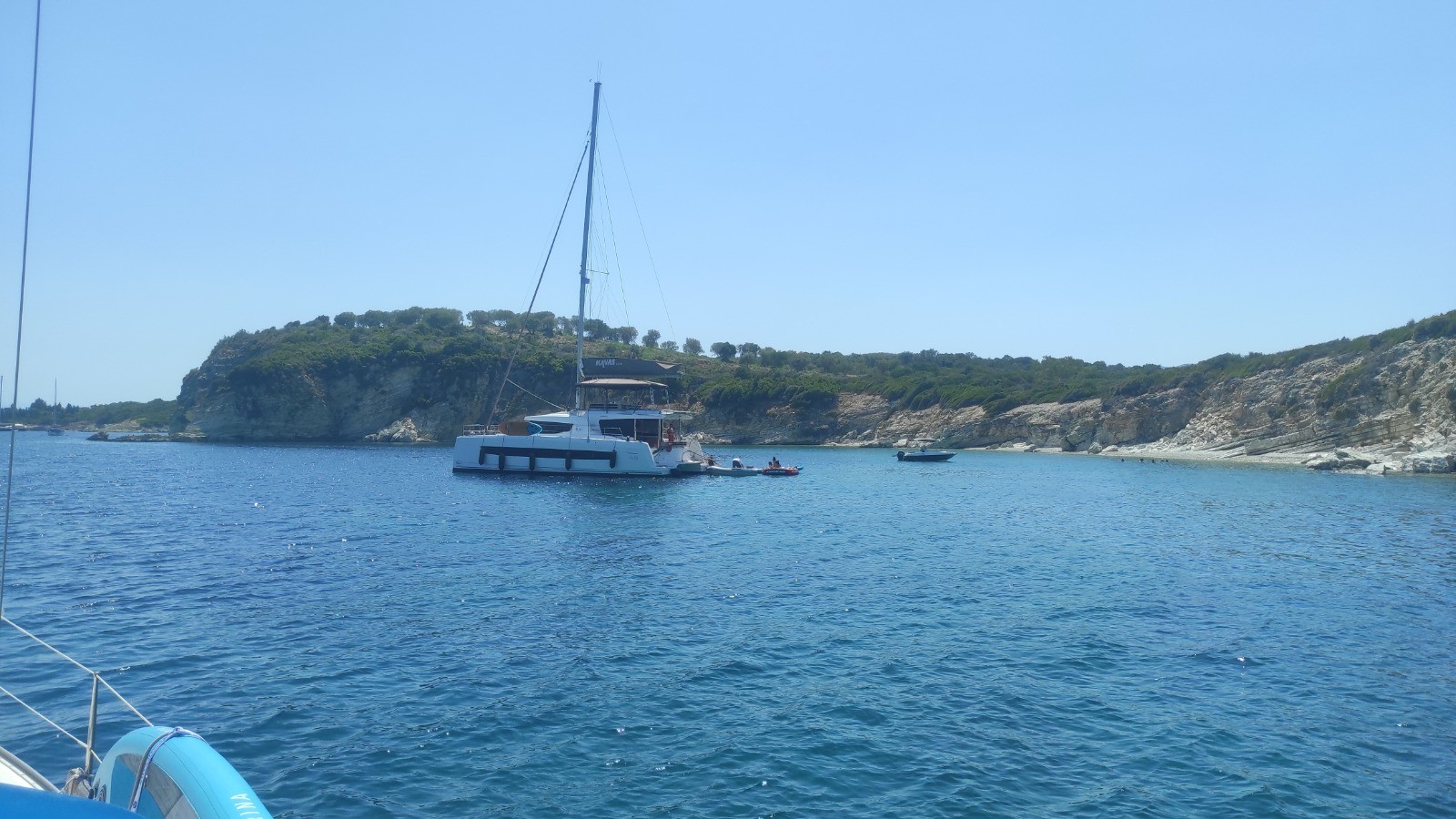 Il fait chaud. Moteur et voile. Beau mouillage en solitaire. Baignades en mer et ailleurs. Café et citronnade servi par Maryvonne. Tuto changement de bord.