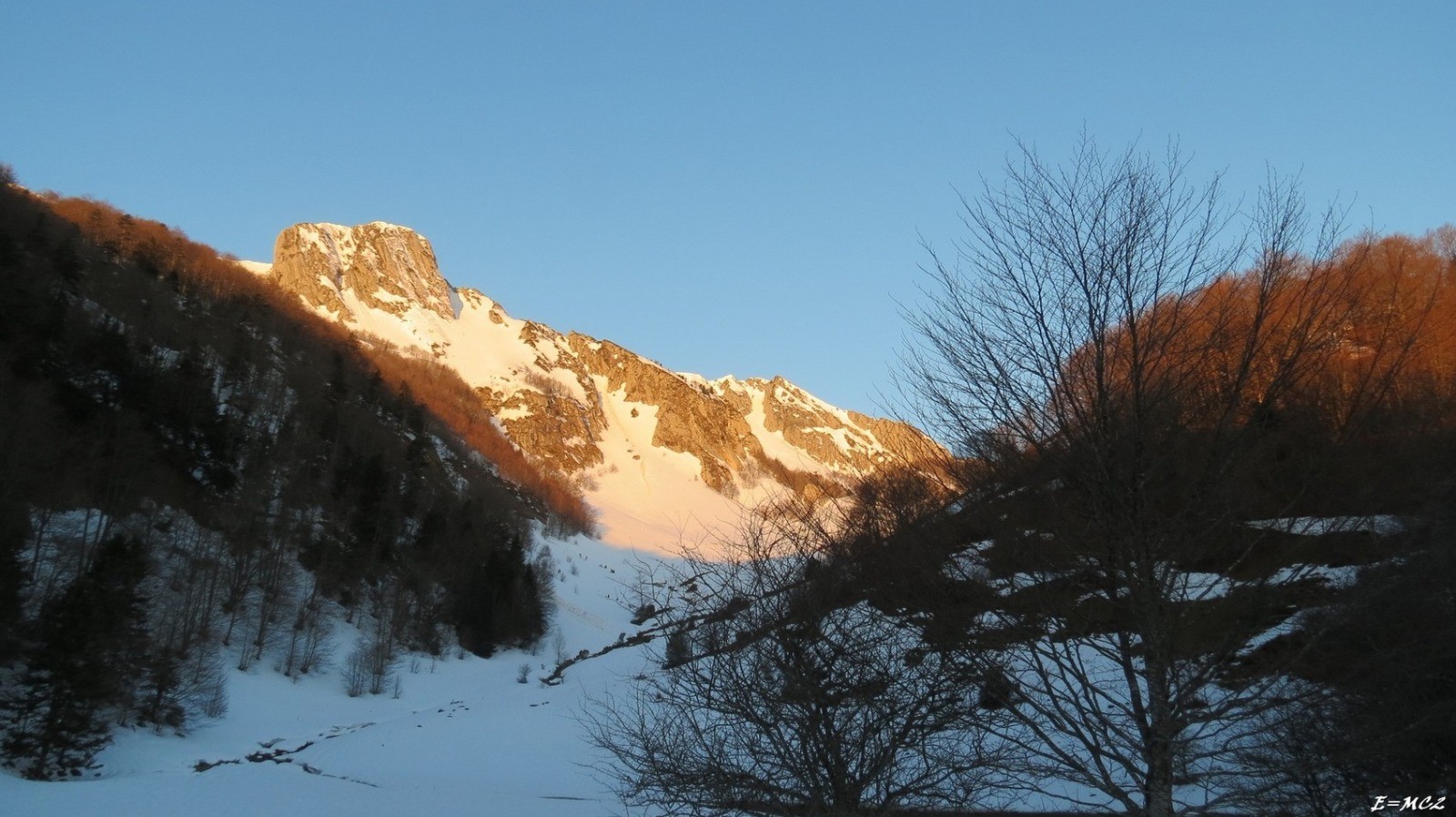Démarrer en entrant dans la carrière et en prenant tout de suite à droite, faire 150 mètres environ et tourner à gauche. Le sentier est facile à suivre jusqu'à la sortie de la forêt. Peu de temps après la sortie de la forêt, on arrive sur une sorte de plateau, ne pas suivre le balisage jaune et continuer vers l'ouest à remonter le vallon. Aux Fontaines de Congles laisser le sentier vers le Col d'Aran sur la gauche pour continuer tout droit jusqu'à un petit col, 1450 m. De ce col descendre sur une dizaine de mètres et rentrer sur la gauche dans le bois, quelques traces et cairns. Longer la basse d'une barre rocheuse et continuer dans le bois en diagonale ascendante. On en sort assez rapidement et l'arrivée au pied du couloir devient évidente. Malgré la date assez tardive et la faible altitude les conditions de neige étaient bonnes. Une fois sorti du couloir il reste quelques mètres pour finir au sommet. Pour le retour on peut passer par le Rocher d'Aran et le Col d'Aran. On peut aussi au pied du Rocher d'Aran couper dans les pentes d'herbe pour retrouver le chemin reliant le Col d'Aran aux Fontaines de Congles.