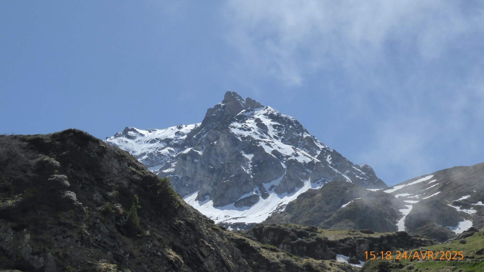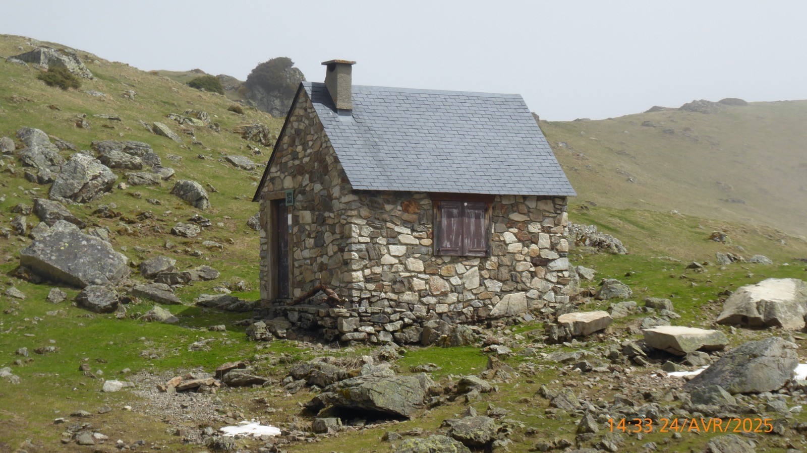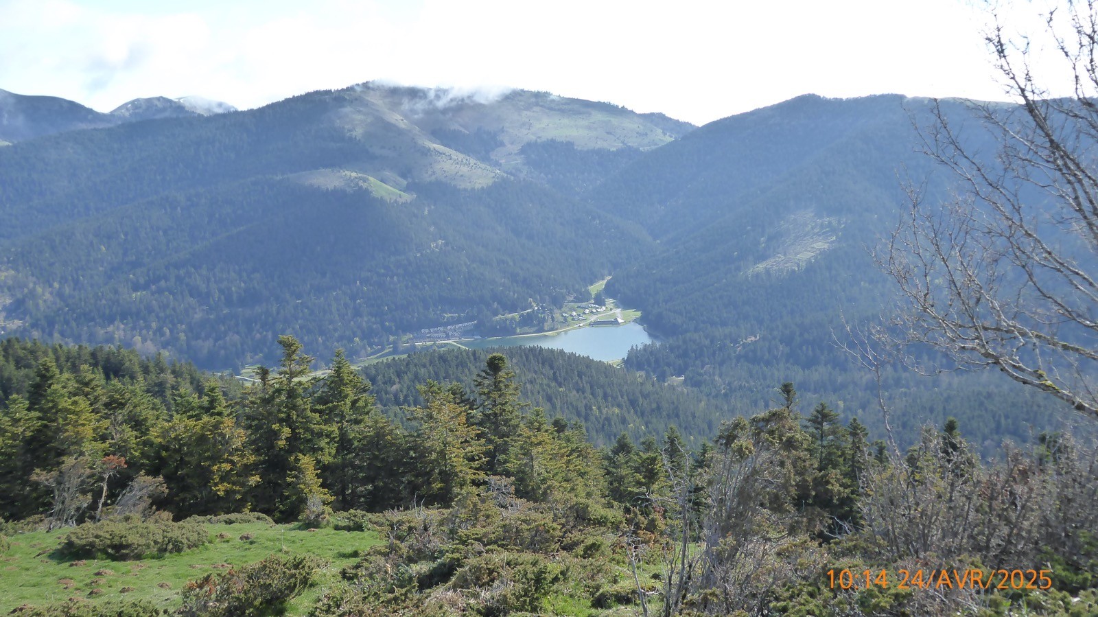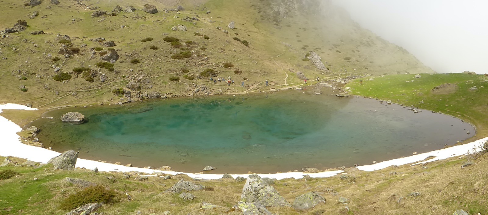Une journée ou le soleil à joué à cache cache avec le brouillard . Départ depuis les cabanes de Camoudiet . Elles constituaient autrefois un courtaou .Elles appartiennent à des bergers et une d'entre-elles, privée également, reste cependant ouverte; elles se trouvent à 1418m et la route de la Houquette d'Ancizan passe devant. Elles sont situées sur le territoire de la commune d'Ancizan. Un sentier remontant NNO nous fait passer par un point côté 1519m et depuis lequel on peut apprécier une vue d'ensemble de Payolle. Nous atteindrons la piste menant au Pla de Castet et prendrons la crête SO au point 1450m. La montée est un peu raide mais nous atteindrons facilement le Pla de l'Arcouade à 1891m. Magnifique belvédère qui nous a permis d'apercevoir: le Pic du Midi de Bigorre, Le Pic de Montarrouye, Le Coste Ouillère, Le Pic de Marianette, La Bèque ,Le Maufaucon , l'Arbizon , le Plagnot de Soubirou et même les cabanes de la Hosse. Le sentier descendant nous fait passer par un petit sommet sans nom mais côté 1916 m sur la carte IGN pour ensuite arriver au col de Crabe ( qui veut dire chèvre !!!). La neige sera encore présente mais sur des étendues .... confidentielles. Nous arrivons au lac d'Arou à 1786 m, superficie 0.3 ha,il a une profondeur de 3 m. Le ruisseau qui en sort est nommé ruisseau de l'Artigou mais aussi ruisseau du Différent . La pause déjeuner nous réservera beaucoup de surprises et nous dégagera le brouillard pour admirer le Pic de Monfaucon et L'Arbizon avec le cirque enneigé avec un lac d'Arou turquoise !! Une belle journée.