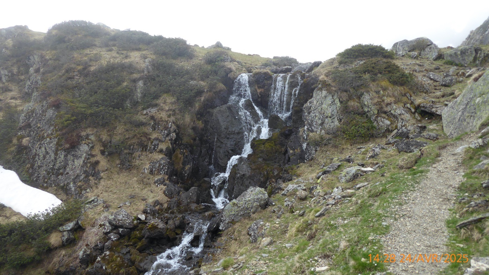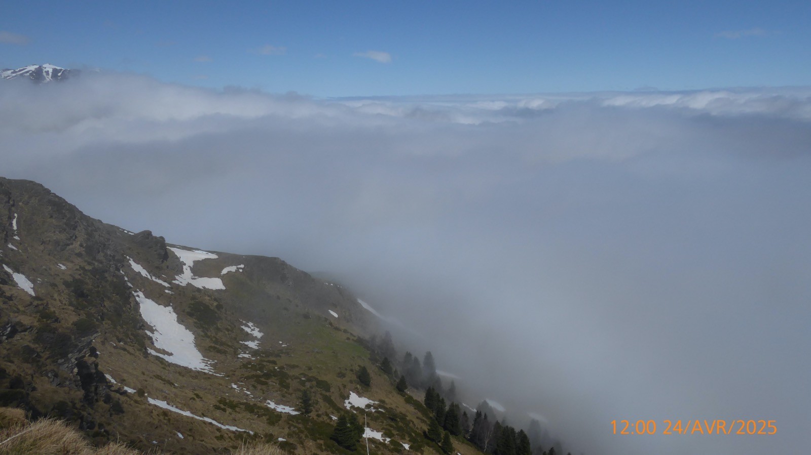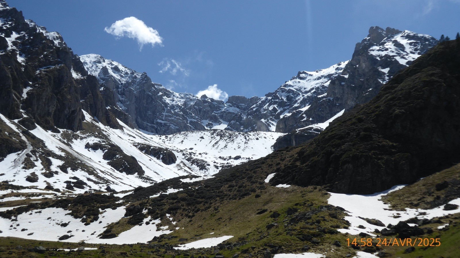 Une journée ou le soleil à joué à cache cache avec le brouillard . Départ depuis les cabanes de Camoudiet . Elles constituaient autrefois un courtaou .Elles appartiennent à des bergers et une d'entre-elles, privée également, reste cependant ouverte; elles se trouvent à 1418m et la route de la Houquette d'Ancizan passe devant. Elles sont situées sur le territoire de la commune d'Ancizan. Un sentier remontant NNO nous fait passer par un point côté 1519m et depuis lequel on peut apprécier une vue d'ensemble de Payolle. Nous atteindrons la piste menant au Pla de Castet et prendrons la crête SO au point 1450m. La montée est un peu raide mais nous atteindrons facilement le Pla de l'Arcouade à 1891m. Magnifique belvédère qui nous a permis d'apercevoir: le Pic du Midi de Bigorre, Le Pic de Montarrouye, Le Coste Ouillère, Le Pic de Marianette, La Bèque ,Le Maufaucon , l'Arbizon , le Plagnot de Soubirou et même les cabanes de la Hosse. Le sentier descendant nous fait passer par un petit sommet sans nom mais côté 1916 m sur la carte IGN pour ensuite arriver au col de Crabe ( qui veut dire chèvre !!!). La neige sera encore présente mais sur des étendues .... confidentielles. Nous arrivons au lac d'Arou à 1786 m, superficie 0.3 ha,il a une profondeur de 3 m. Le ruisseau qui en sort est nommé ruisseau de l'Artigou mais aussi ruisseau du Différent . La pause déjeuner nous réservera beaucoup de surprises et nous dégagera le brouillard pour admirer le Pic de Monfaucon et L'Arbizon avec le cirque enneigé avec un lac d'Arou turquoise !! Une belle journée.