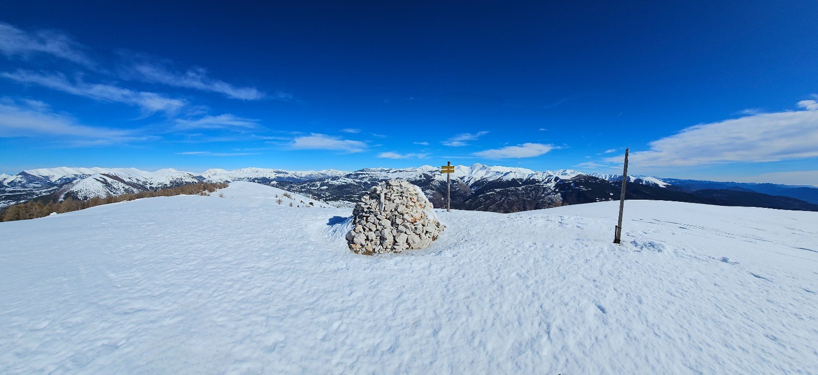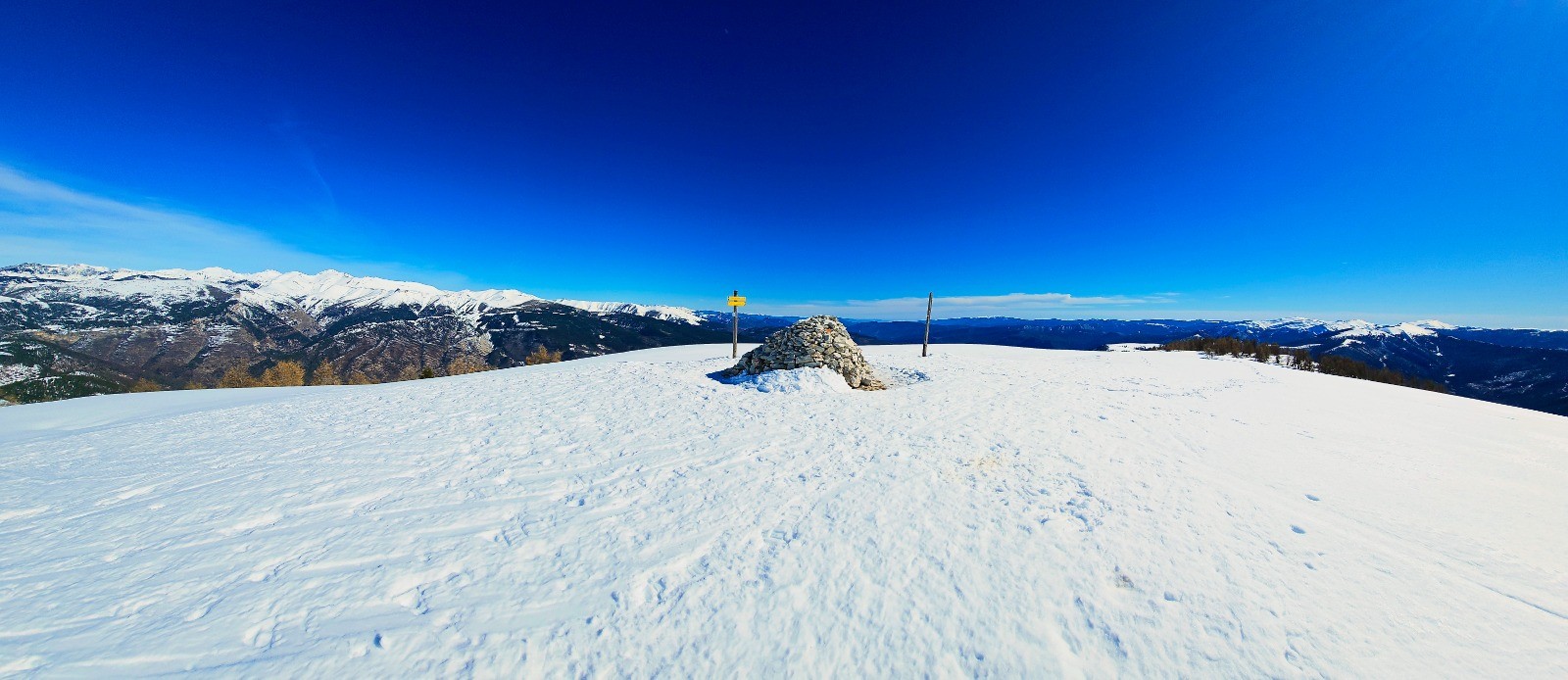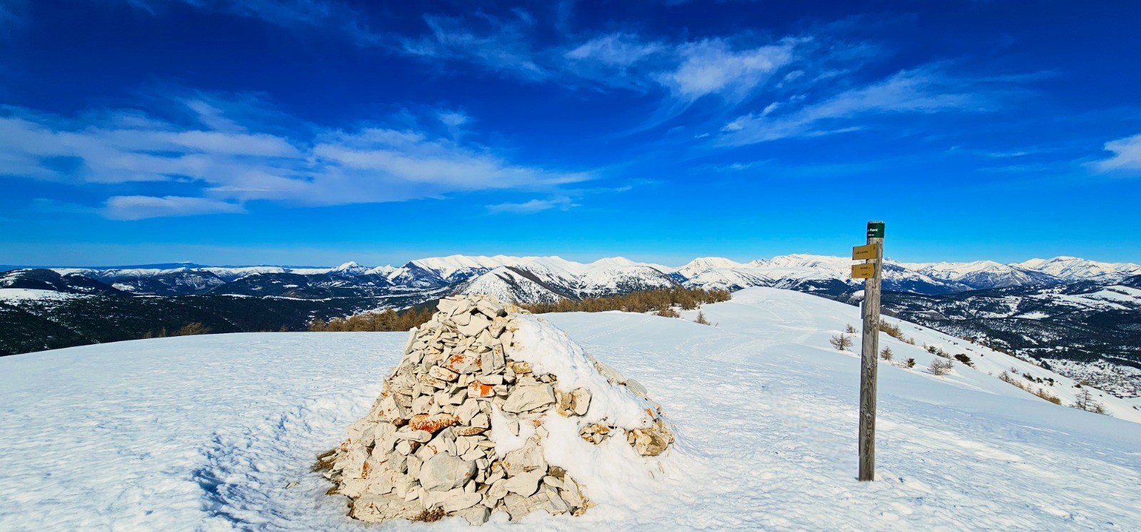 Départ depuis le vaste parking situé en bordure de l'unique route (D 908) desservant le hameau de La Colle Saint-Michel, en vis à vis d'un site nordique. Suivre au mieux le GRP estival de la Vallée de la Vaïre qui mène directement à la crête de Rent par croupe caractéristique, en partant du corps de ferme de Saint-Antoine. Localiser une 1ère balise indiquant le Puy de Rent, avec de nombreuses pistes de ski de fond situées à proximité. Le cheminement à suivre est en montée constante jusqu'au Pic de Rent (3,43 km avec d+ 538) et serpente à travers un mélézin entièrement enneigé avec une signalisation verticale apparente sur troncs d'arbres (jaune et rouge GRP ou indications trail - photo N° 1). Après 2,30 km environ on sort de cette zone boisée avec un 1er aperçu du dôme du Pic de Rent qu'il convient de gravir au mieux par la ligne d'épaulement principale. Il s'agit là d'une simple antécime non matérialisée dans la mesure où le véritable sommet constitué par le Puy de Rent en demeure encore distant de 700 m dans le prolongement de cette longue ligne de crête aplanie. Cairn monumental depuis ce point haut du circuit avec superbe tour d'horizon sur les massifs enneigés de l'Ubaye. Immenses perspectives qui incitent à poursuivre la balade dans un splendide isolement et sans risque particulier sur pente à faible dénivelé. Vous invite ainsi à prolonger le plaisir depuis cette crête spectaculaire avec une douce déambulation au-delà du Puy de Rent jusqu'à la proéminence de la côte 1846 dominant un vaste replat contournant doline, soit 2 km supplémentaires de pur bonheur (avec d+ 47 et d- 189 m).