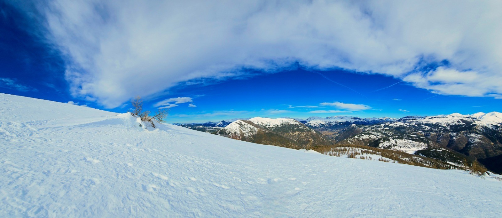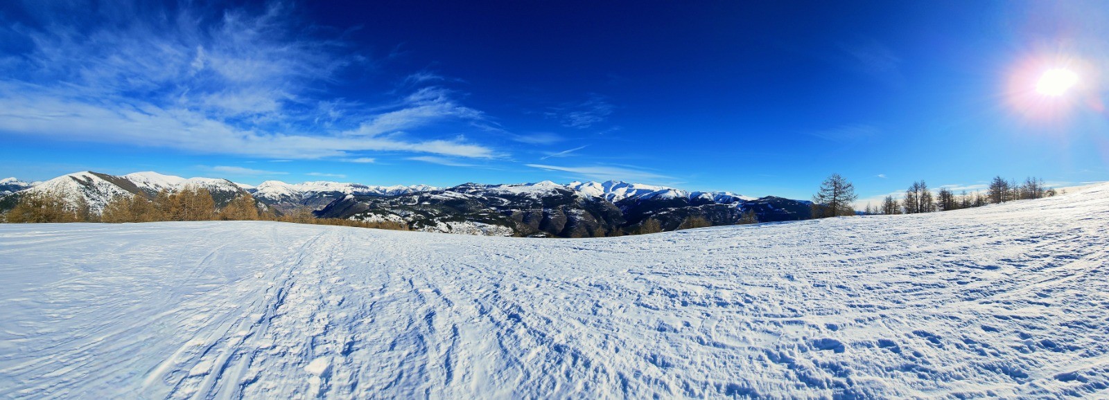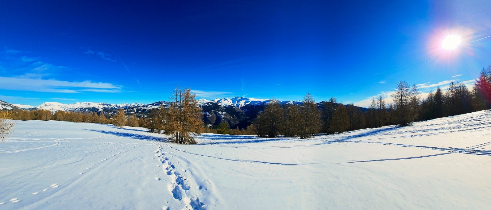 Départ depuis le vaste parking situé en bordure de l'unique route (D 908) desservant le hameau de La Colle Saint-Michel, en vis à vis d'un site nordique. Suivre au mieux le GRP estival de la Vallée de la Vaïre qui mène directement à la crête de Rent par croupe caractéristique, en partant du corps de ferme de Saint-Antoine. Localiser une 1ère balise indiquant le Puy de Rent, avec de nombreuses pistes de ski de fond situées à proximité. Le cheminement à suivre est en montée constante jusqu'au Pic de Rent (3,43 km avec d+ 538) et serpente à travers un mélézin entièrement enneigé avec une signalisation verticale apparente sur troncs d'arbres (jaune et rouge GRP ou indications trail - photo N° 1). Après 2,30 km environ on sort de cette zone boisée avec un 1er aperçu du dôme du Pic de Rent qu'il convient de gravir au mieux par la ligne d'épaulement principale. Il s'agit là d'une simple antécime non matérialisée dans la mesure où le véritable sommet constitué par le Puy de Rent en demeure encore distant de 700 m dans le prolongement de cette longue ligne de crête aplanie. Cairn monumental depuis ce point haut du circuit avec superbe tour d'horizon sur les massifs enneigés de l'Ubaye. Immenses perspectives qui incitent à poursuivre la balade dans un splendide isolement et sans risque particulier sur pente à faible dénivelé. Vous invite ainsi à prolonger le plaisir depuis cette crête spectaculaire avec une douce déambulation au-delà du Puy de Rent jusqu'à la proéminence de la côte 1846 dominant un vaste replat contournant doline, soit 2 km supplémentaires de pur bonheur (avec d+ 47 et d- 189 m).