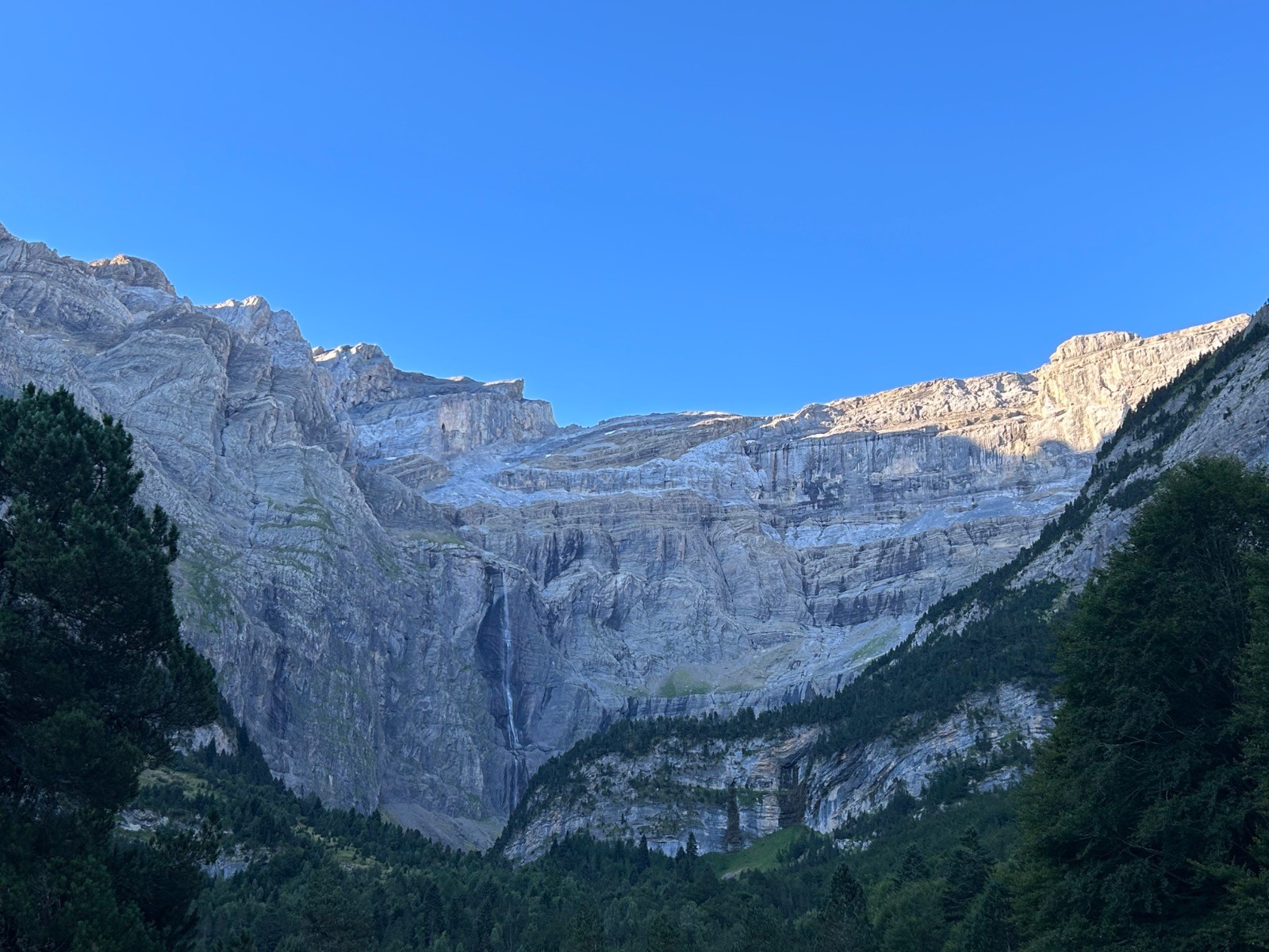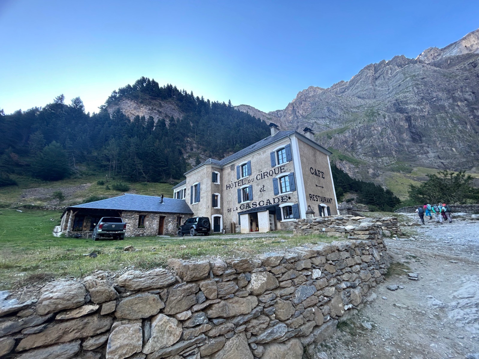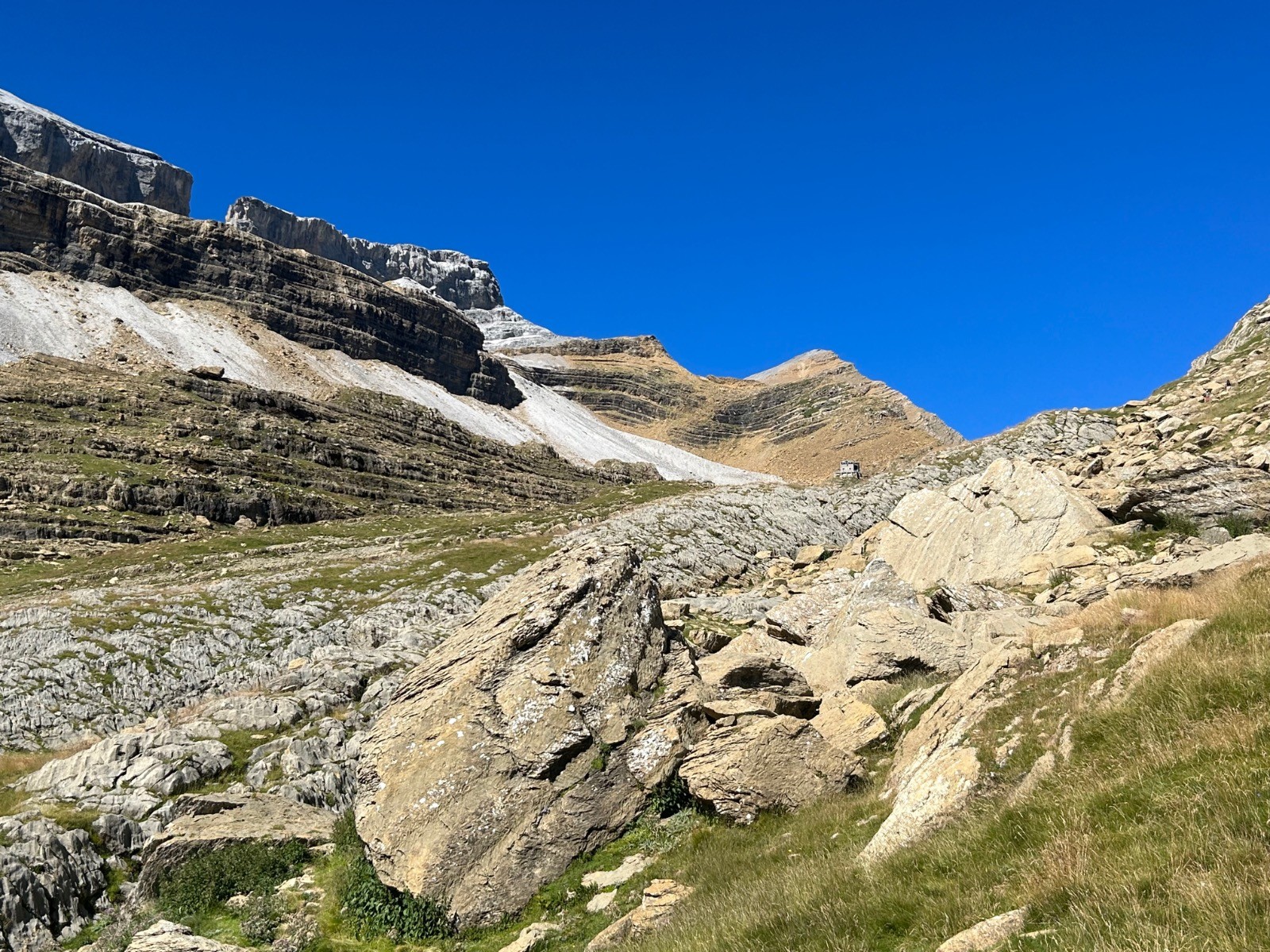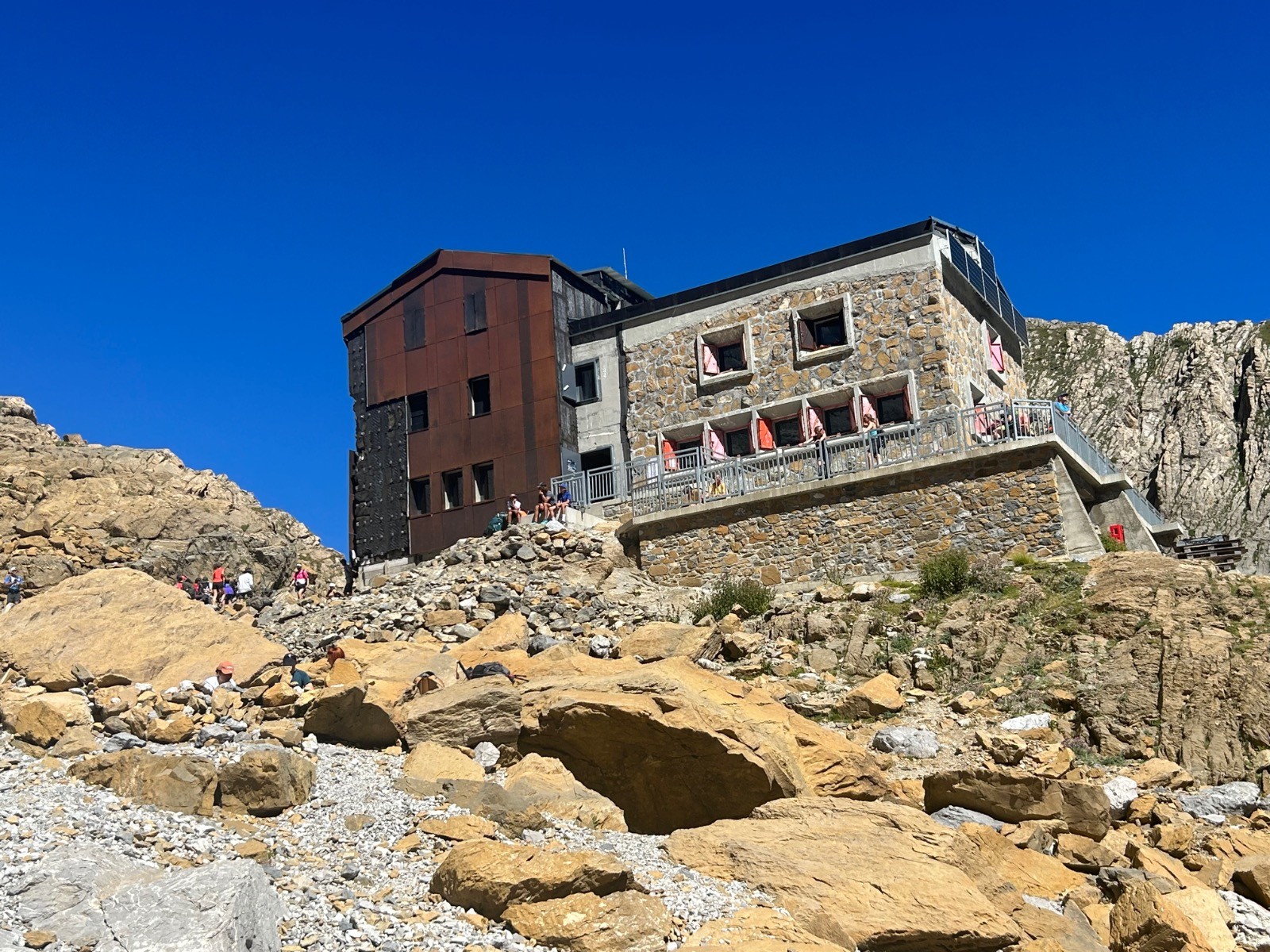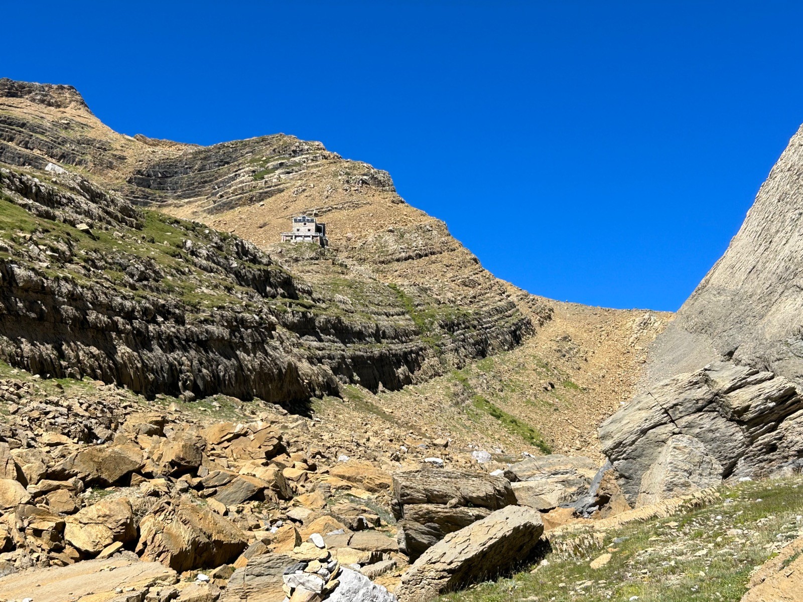 L'échelle des Sarradets a une inclinaison d’environ 45°, le sentier présente un dénivelé voisin de 250 mètres pour une distance à vol d'oiseau d'environ 250 mètres la pente topographique moyenne y est donc de 100 % .Le sentier débouche sur un plateau orienté E/O. Panorama magnifique; Pic Rouge de Pailha, Grand Astazou, le Pic de Marboré, Pics Oriental et Occidental de la Cascade, la Cascade bien entendu, l'Epaule, la Tour, le Casque...Le refuge des Sarradets se trouve à une altitude de 2 587 m, il donne accès aux sommets du cirque, au mont Perdu, au Taillon, aux vallées aragonaises, etc. C'est au cours de l'année 1951 que démarre la construction , sur les plans de l'architecte Tarbais J. Martin. Construit par l'entreprise Castells de Bagnères-de-Bigorre, il fut inauguré en 1956 par Maurice Herzog, alors président du Club alpin français. C'était le premier refuge moderne édifié dans les Pyrénées après la Seconde Guerre mondiale. Des travaux de rénovations seront lancés en 2016 et après quatre années de chantier et des travaux perturbés par une avalanche en 2019, le refuge pourra finalement ouvrir en 2020. Le refuge des Sarradets est gardé jusqu'à la mi-octobre. La Brêche étale sa grandeur avec le fond de ciel bleu.
