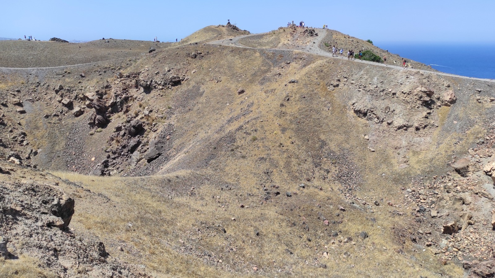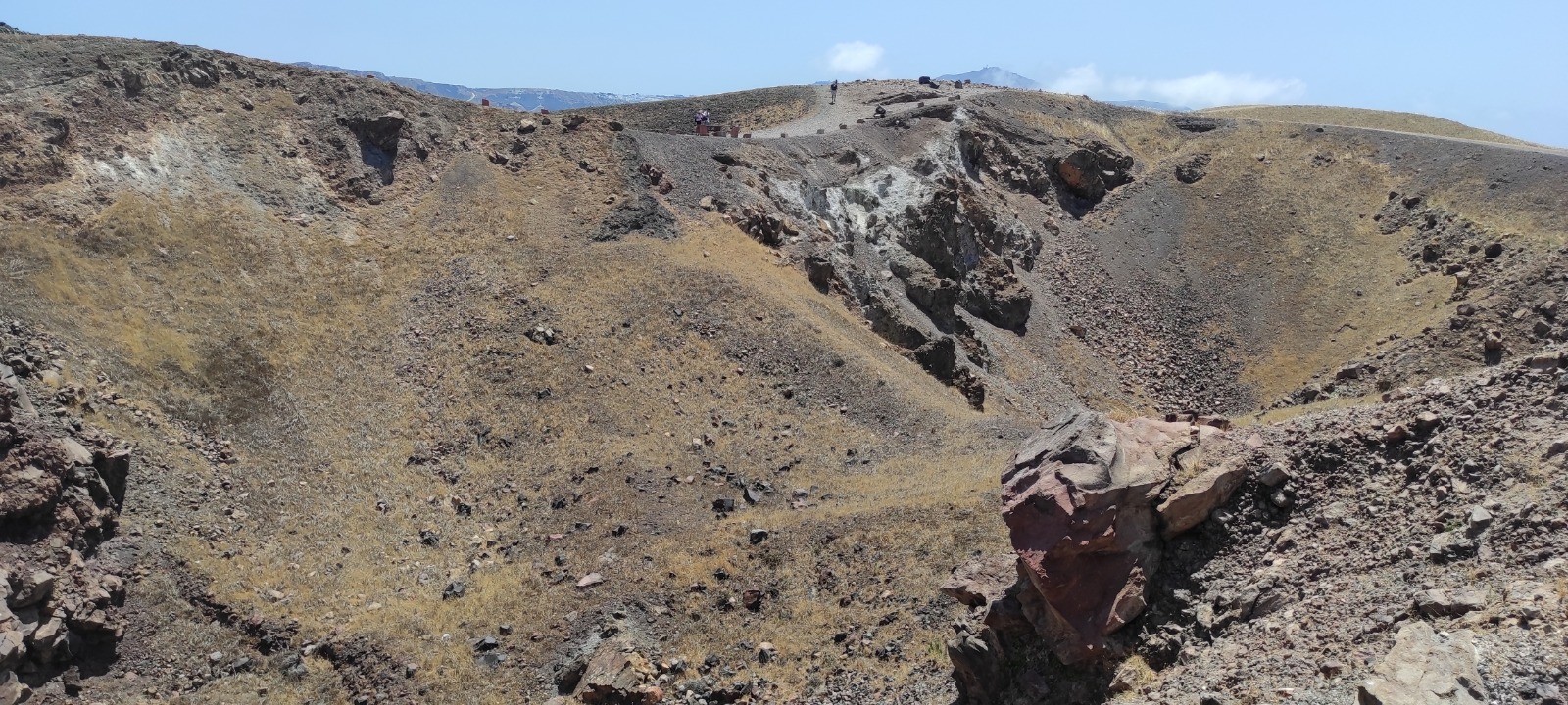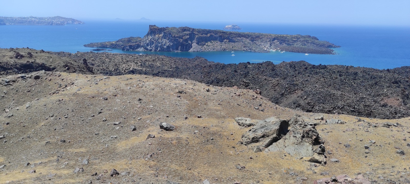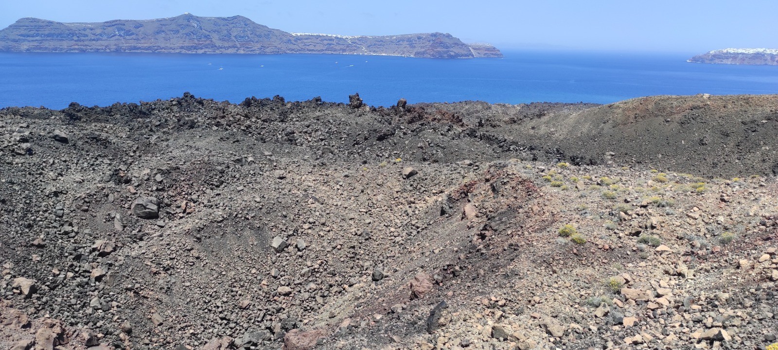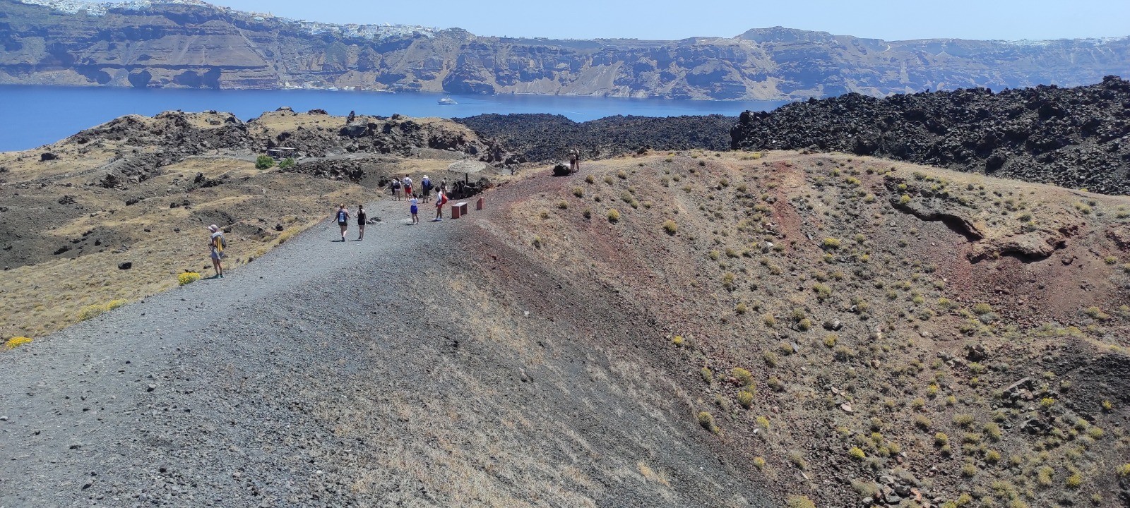 Descente au port de Fira, dans prendre les donkey. Bateau jusqu'à l'île de Nea kameni et ballade jusqu'au sommet du cratère encore actif. Baignade dans un eau soit disant chaude mais plus froide que tiedasse. Remontée à pied sans prendre le cable car.