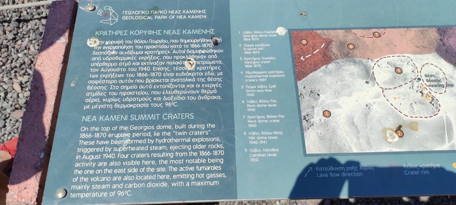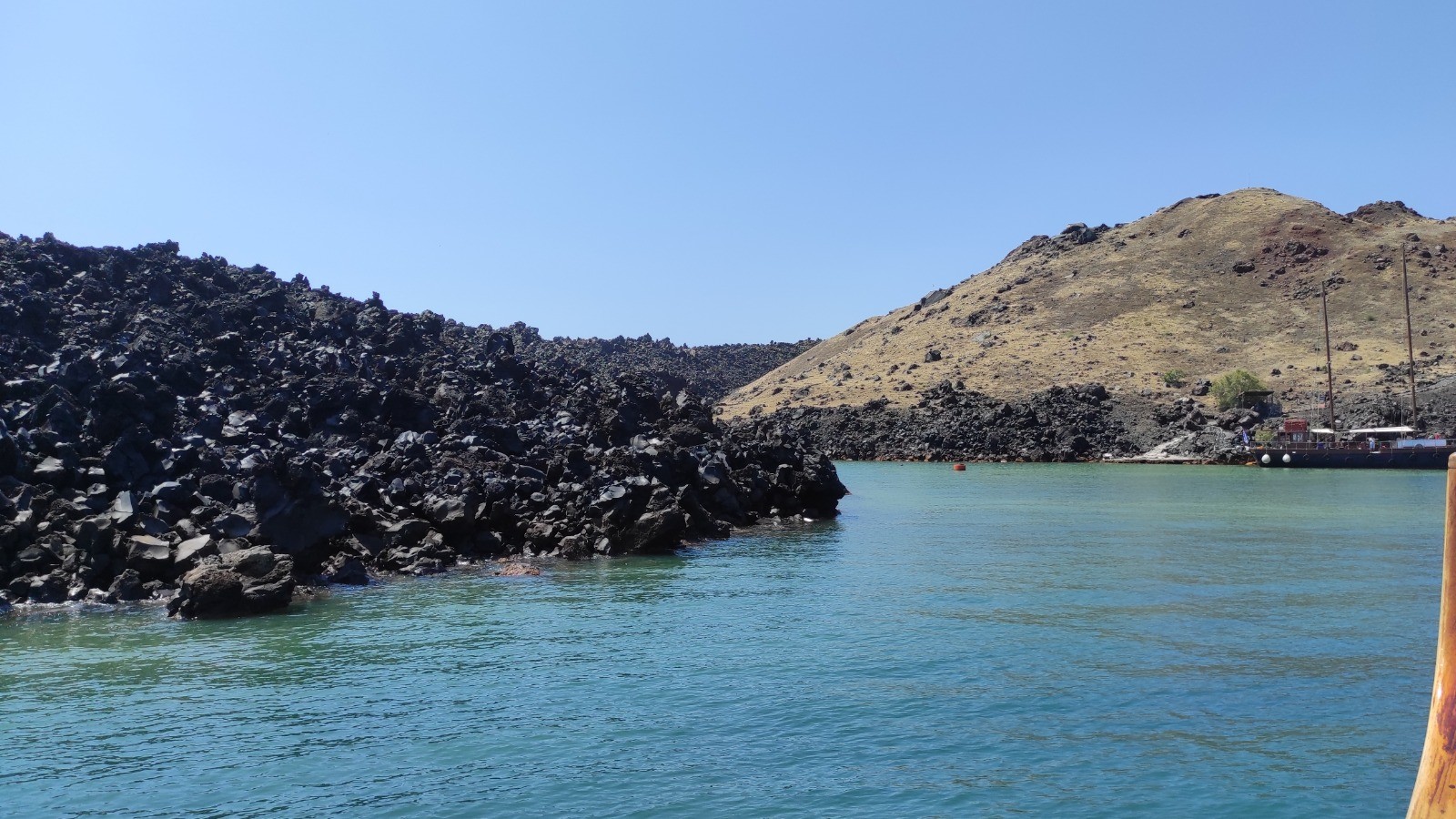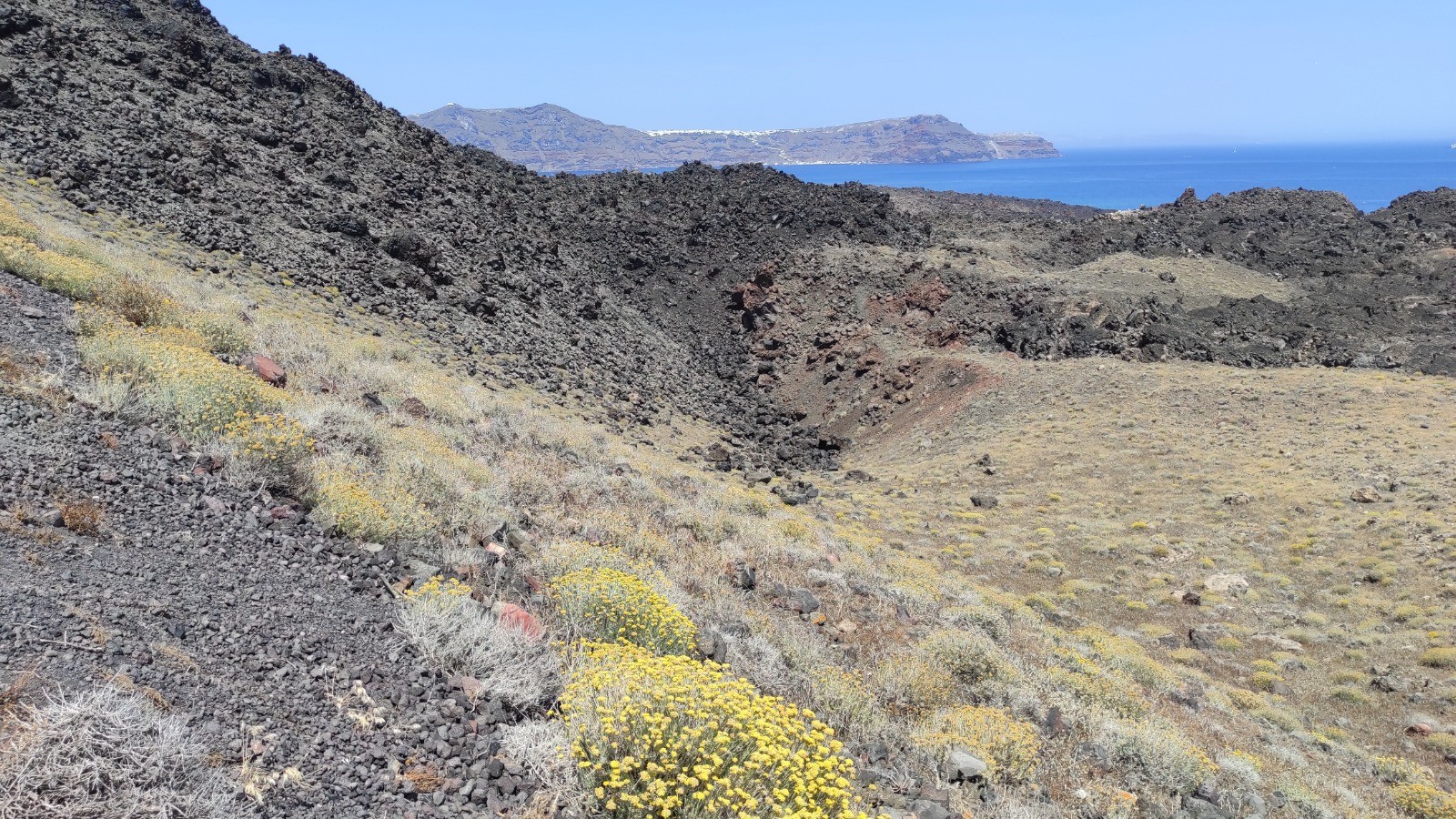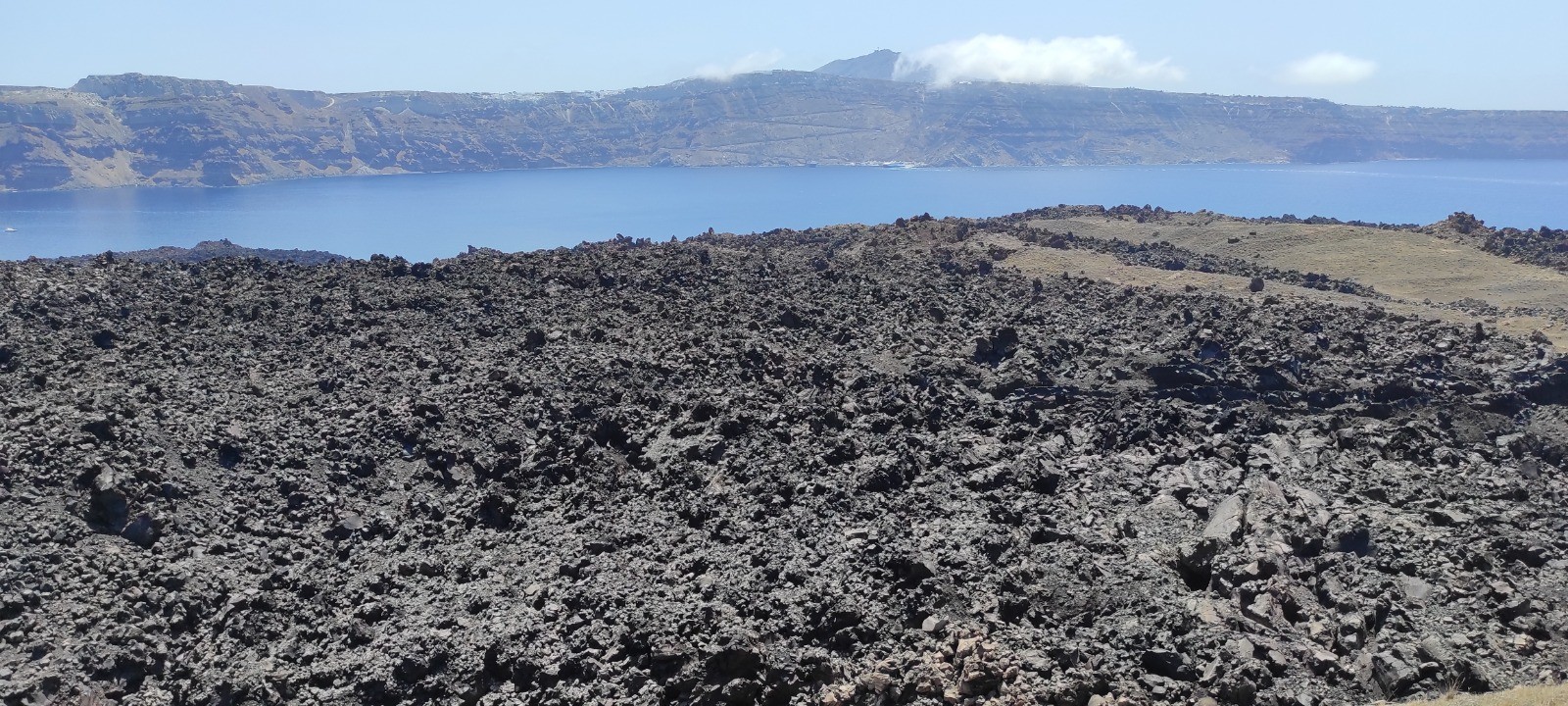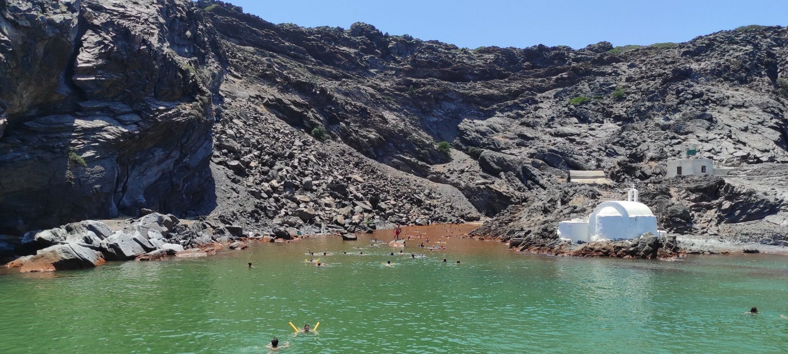Descente au port de Fira, dans prendre les donkey. Bateau jusqu'à l'île de Nea kameni et ballade jusqu'au sommet du cratère encore actif. Baignade dans un eau soit disant chaude mais plus froide que tiedasse. Remontée à pied sans prendre le cable car.