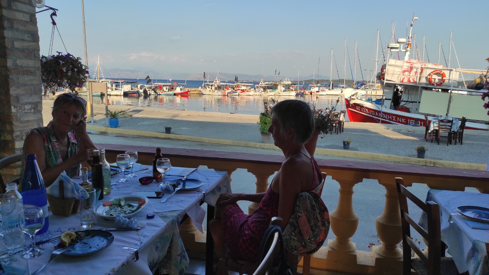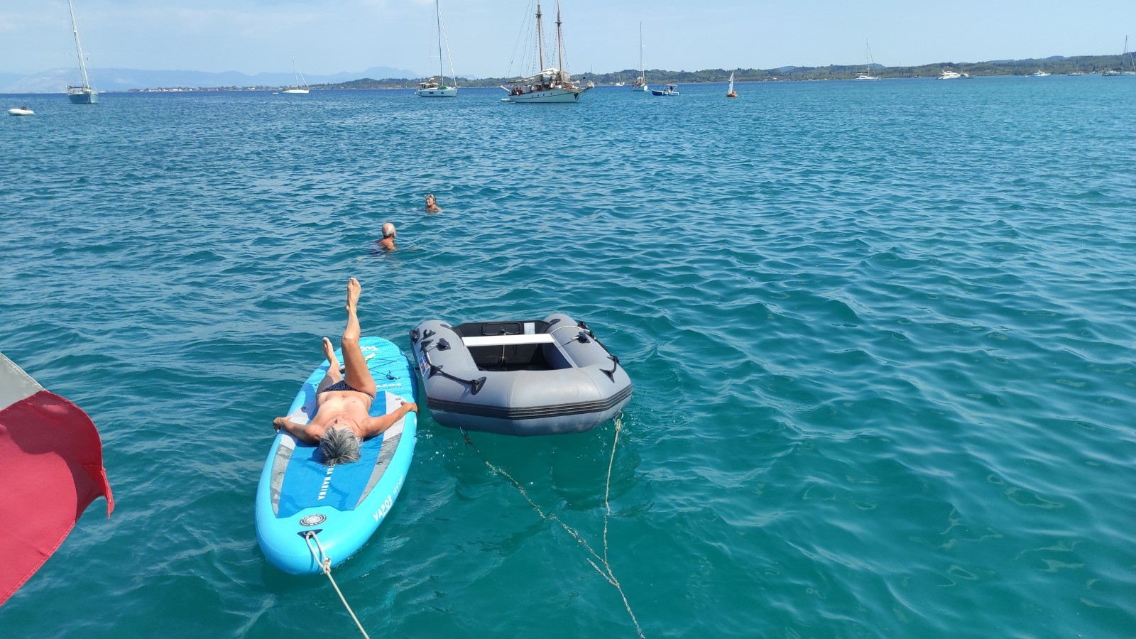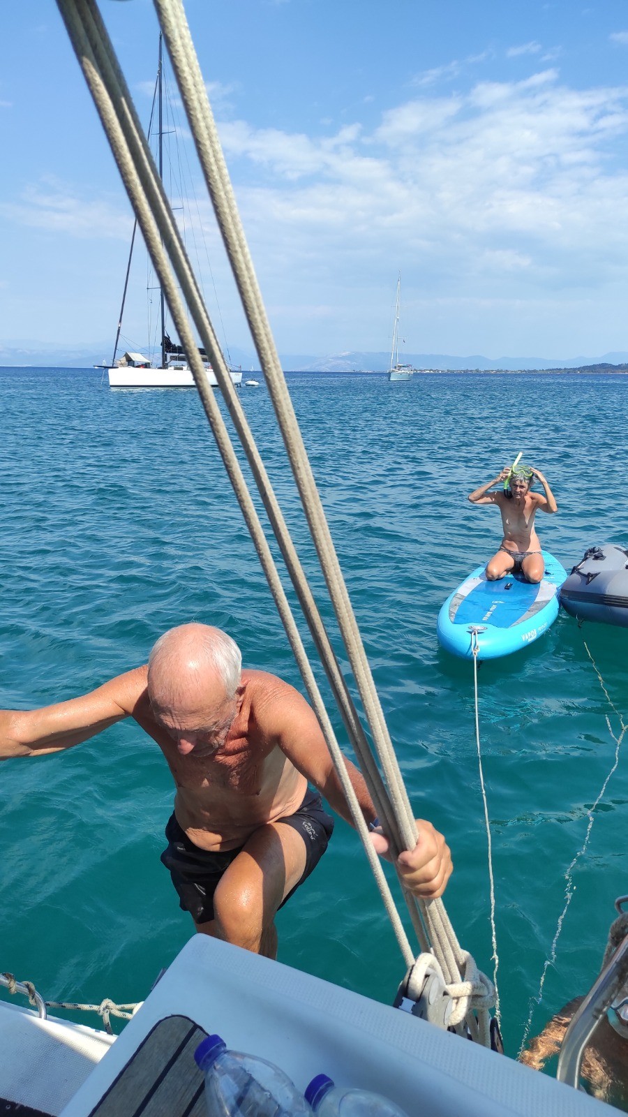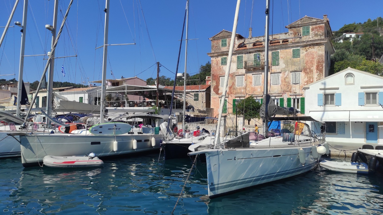 Gaios en bateau, puis sous voile pour Corfou. Bon vent, speedo en panne, taverne chez Vasili, les bateaux de pêche, les lunettes de Bernard à l'eau, Maryvonne encore une fois héroïque.